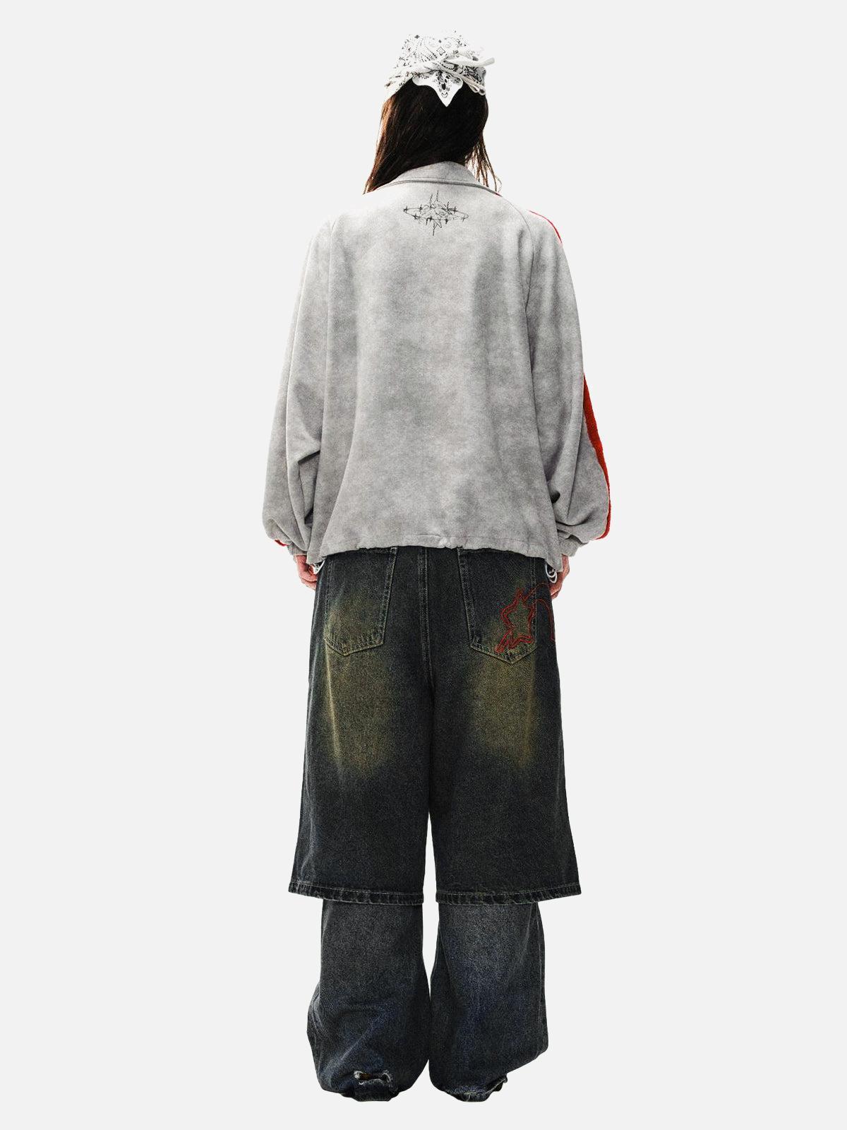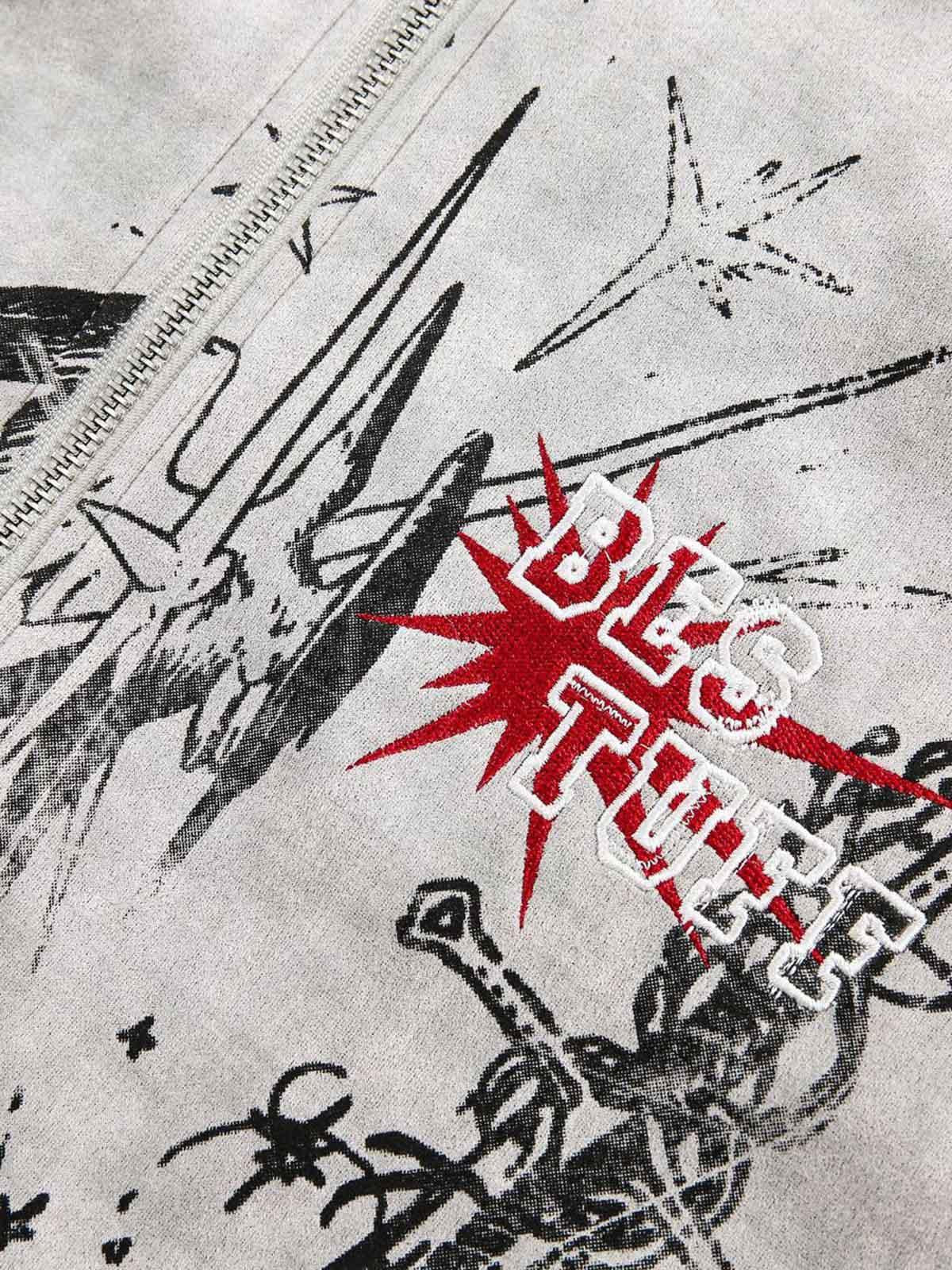 Channel your inner street artist with this bold zip-up that speaks volumes without saying a word. The gritty gray backdrop is the perfect canvas for the rebellious splashes of black graphic elements, creating an edgy visual narrative. Vivid red stripes down the sleeves add a dynamic punch, ensuring you stand out in any urban jungle. Designed for those who dare, the relaxed fit offers comfort without compromising style, making it ideal for layering over your favorite y2k outfits. Available in sizes M, L, XL, and 2XL, this piece is your ticket to effortless streetwear fashion. Ready to redefine your outfit game?