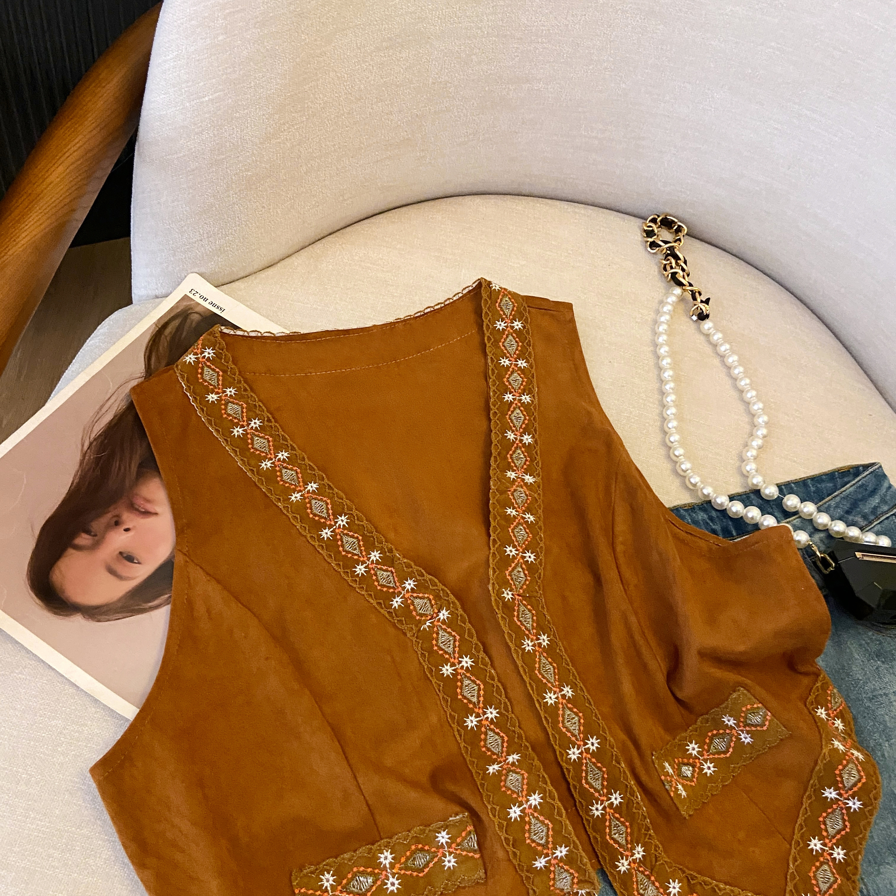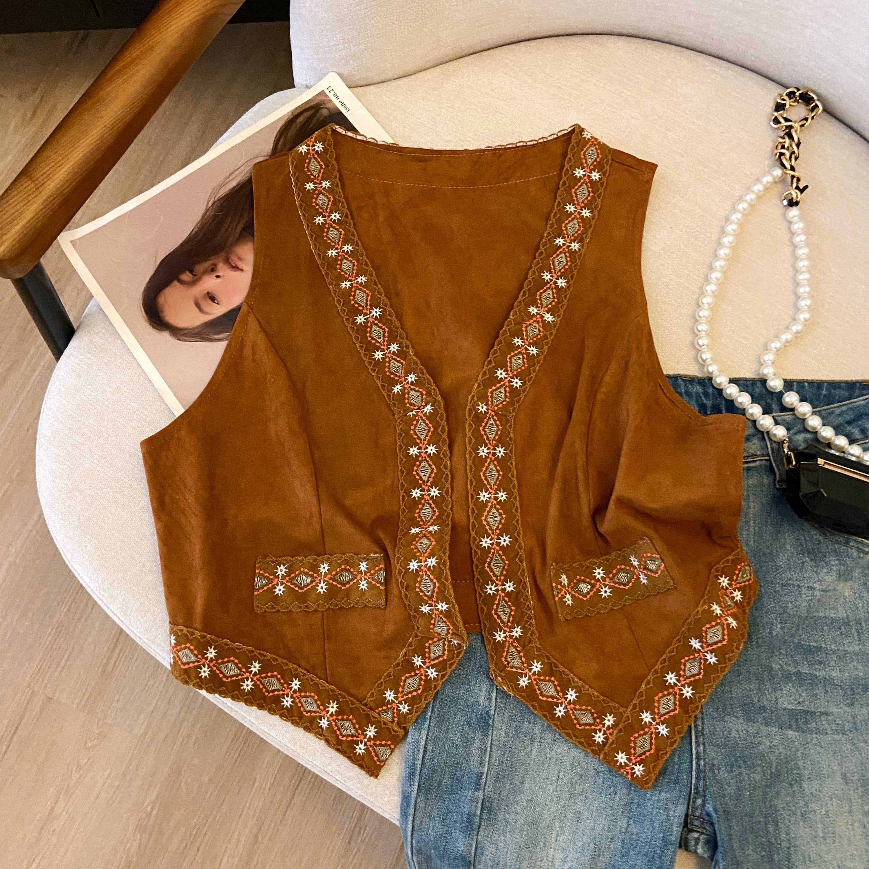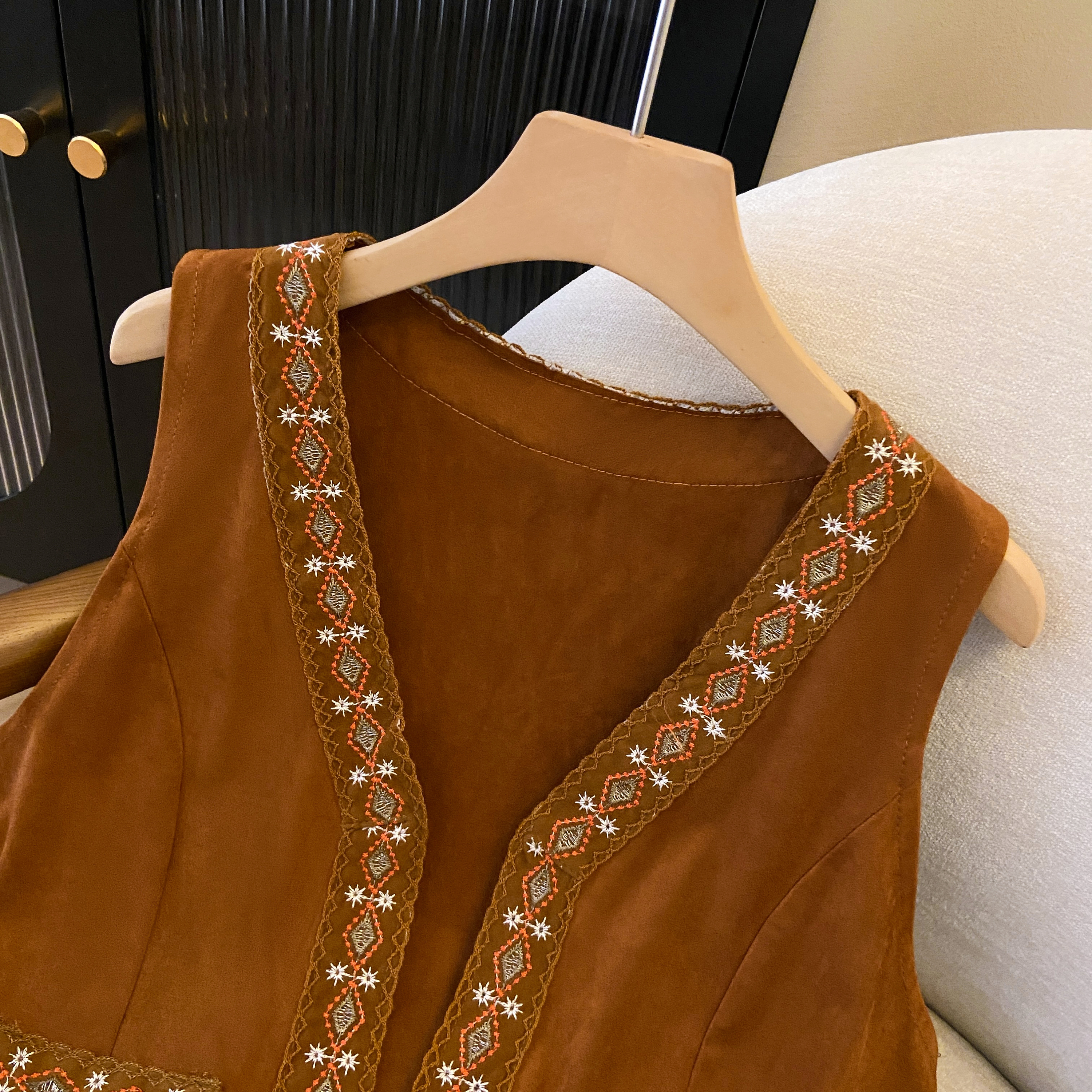 Concert Outfit Ethnic Brown Suede V Totem Embroidery Layered Tank Top Jacket, Boho