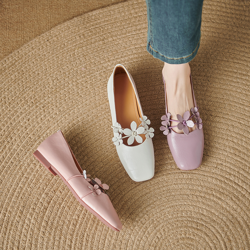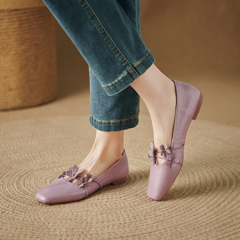 Concert Outfit Genuine Leather Square Toe Flower Shallow Mouth Flats Women Footwear
