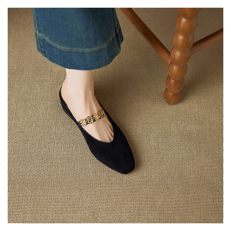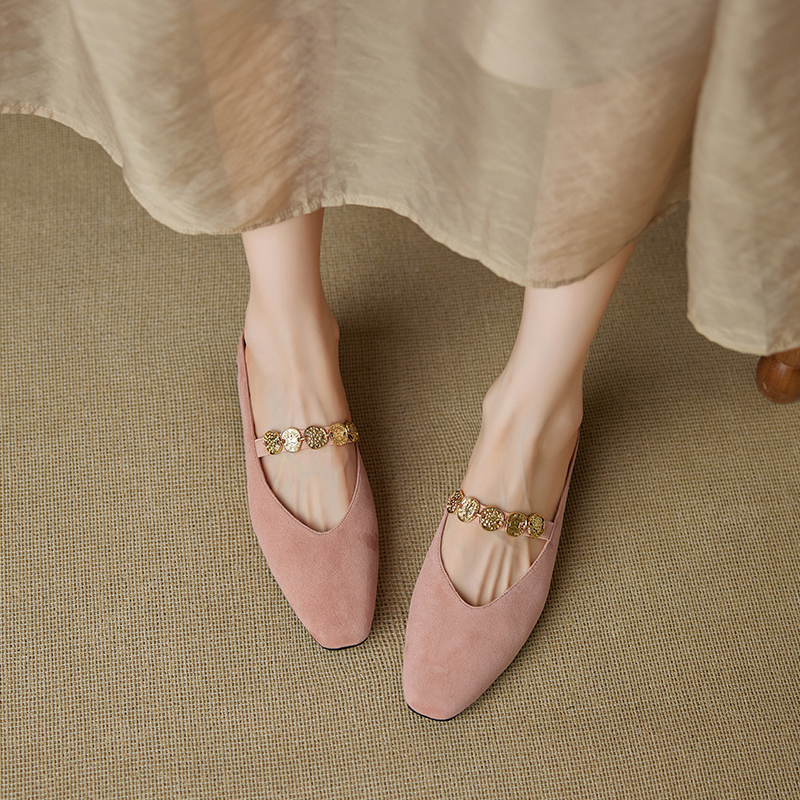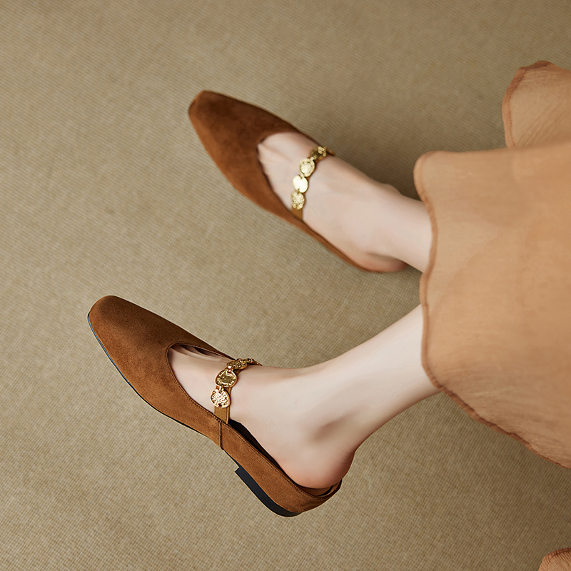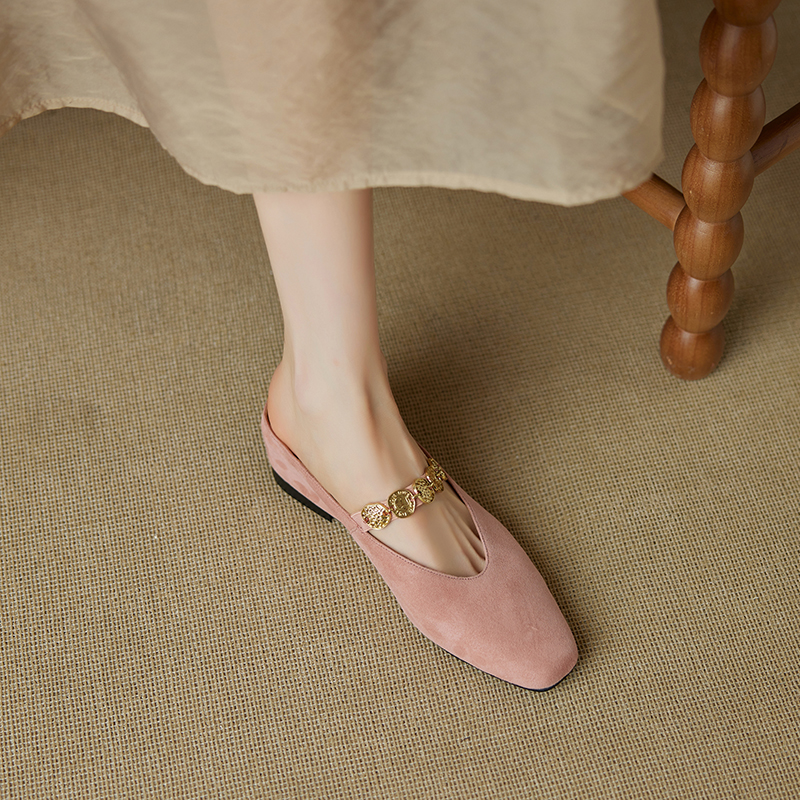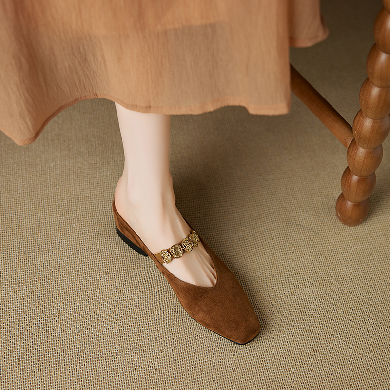 Concert Outfit Genuine Leather Square Toe Gold Coin Slip On Mules Women Summer Height Increasing Closed Toe Slippers