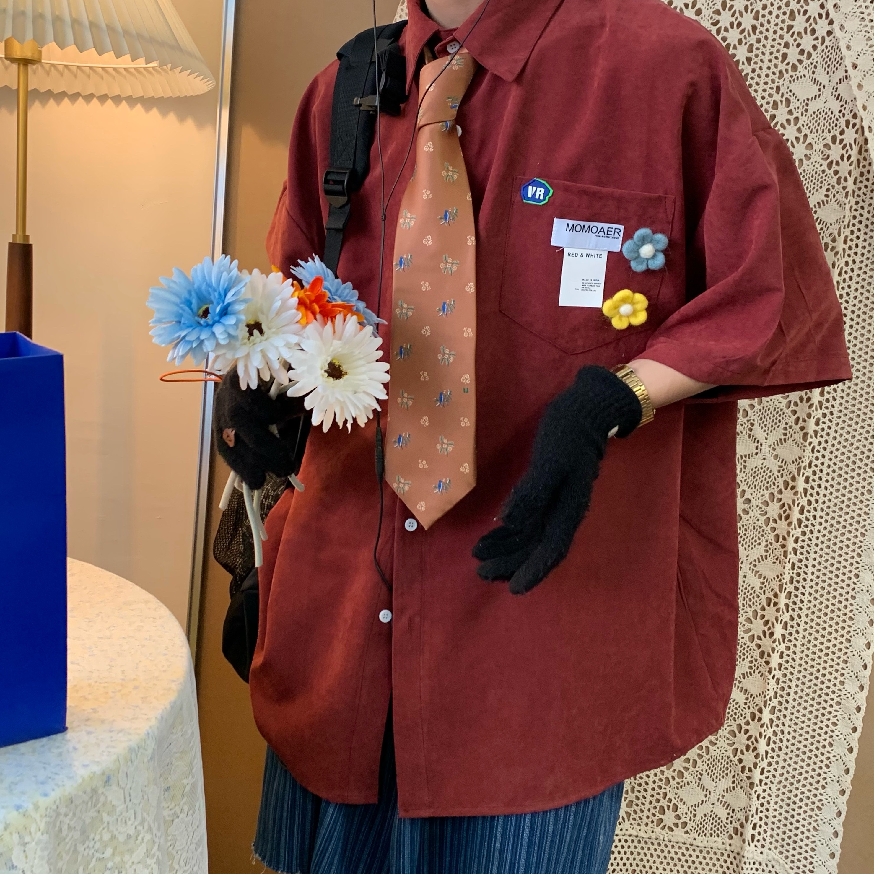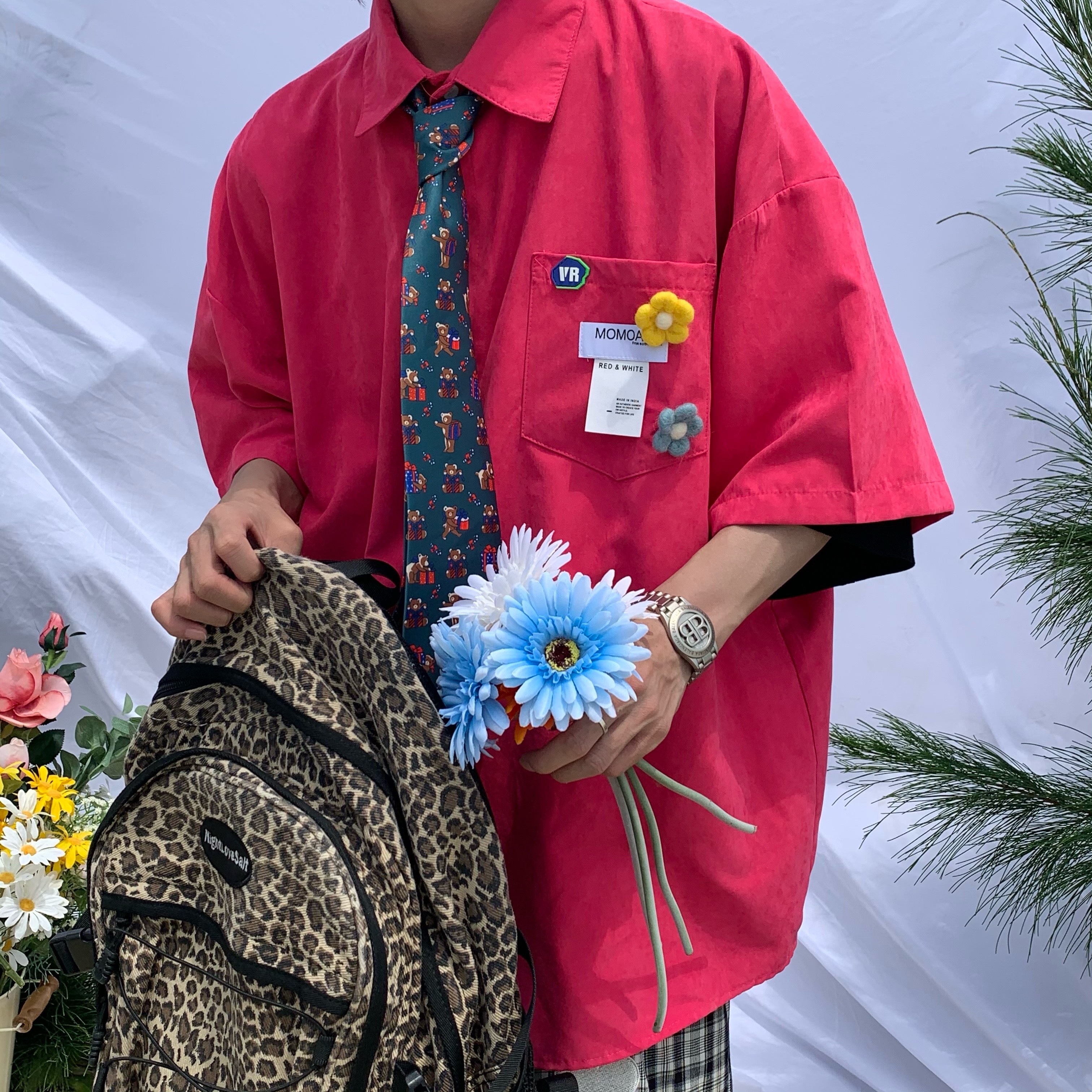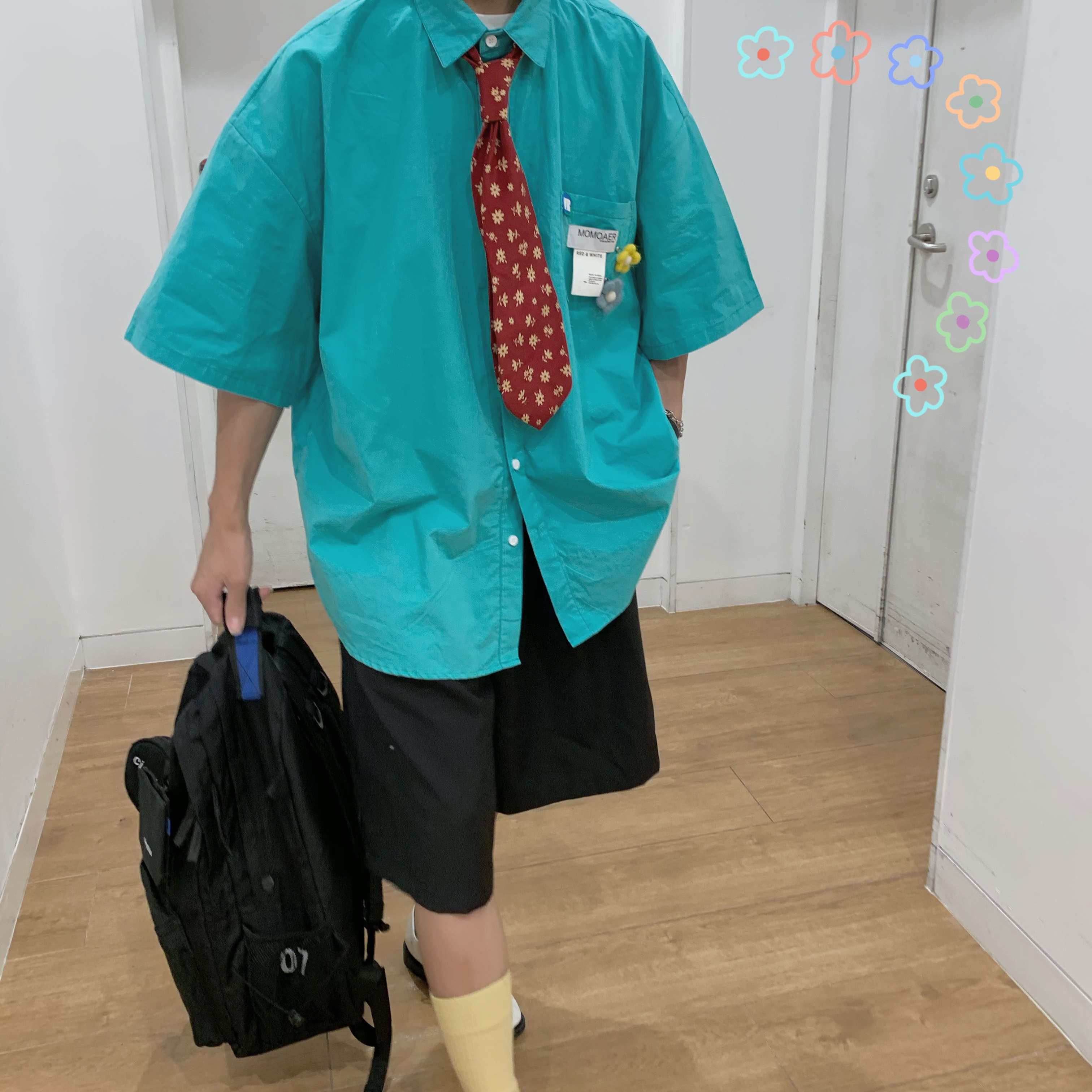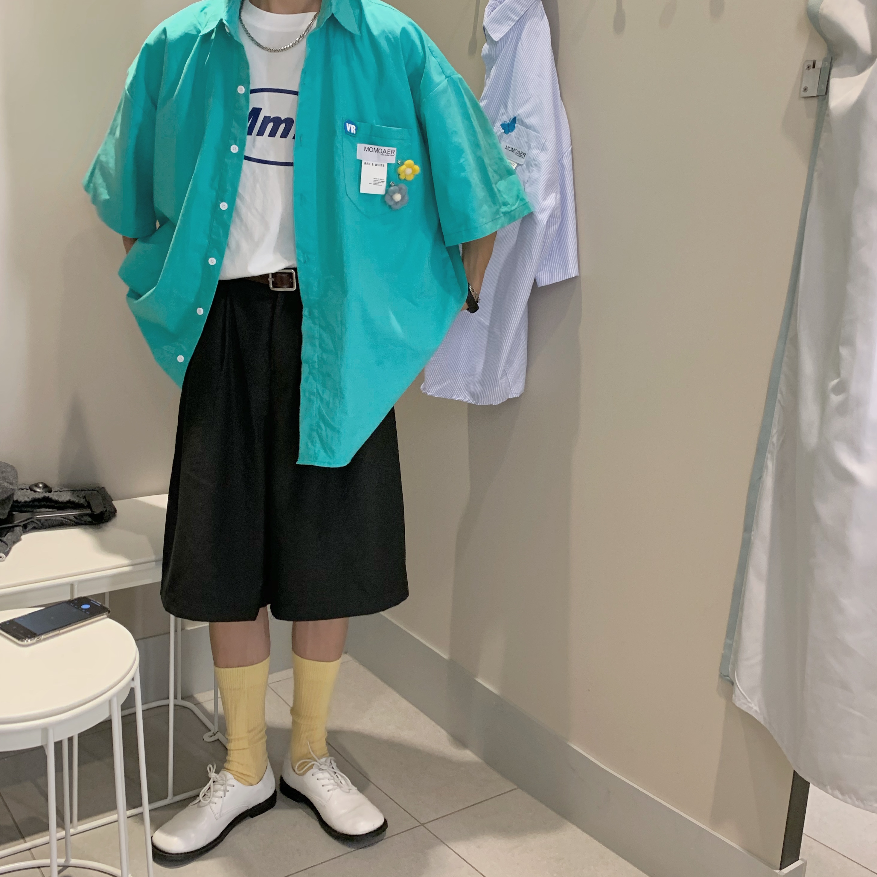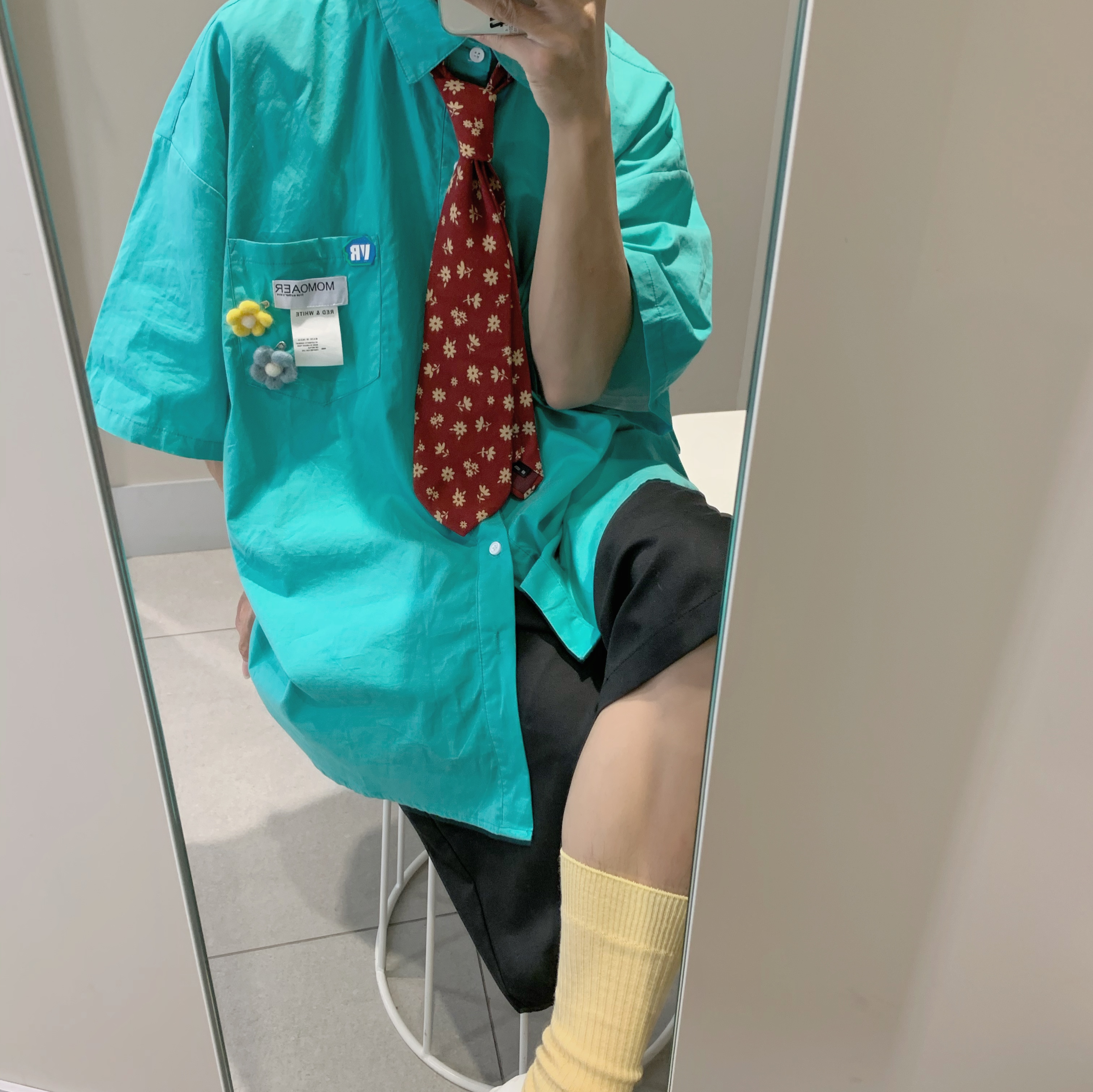 Concert Outfit Brooch Flower Loose Shirt Lake Blue Solid Short Sleeve Top Students