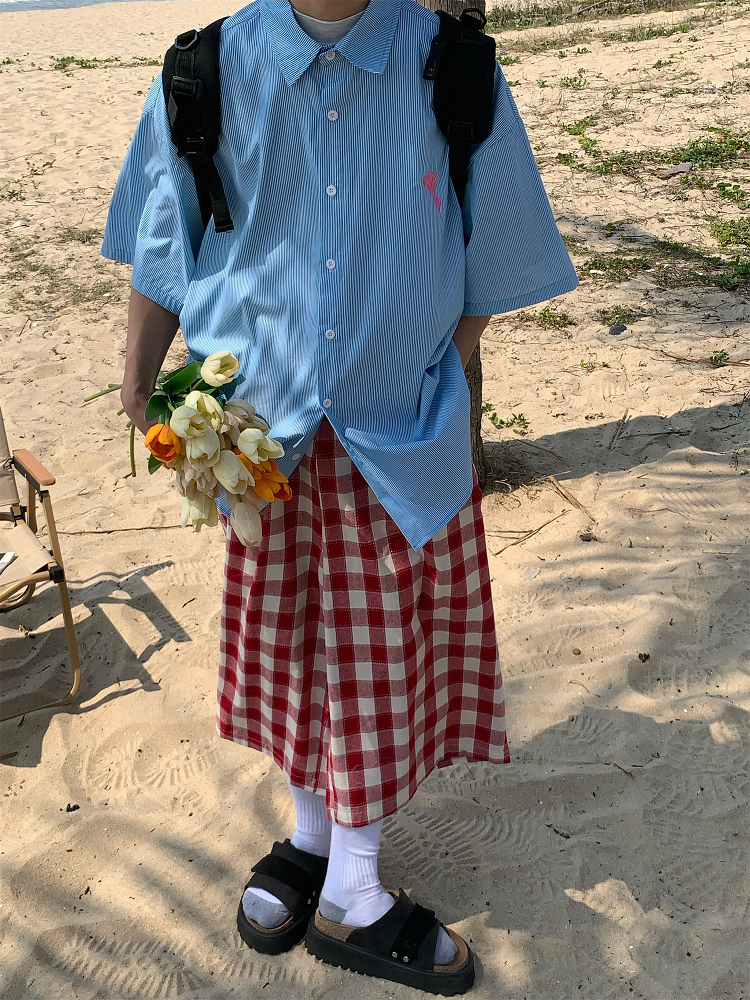 Trendy Concert Outfit: Vertical Striped Short Sleeve Shirt with Embroidery