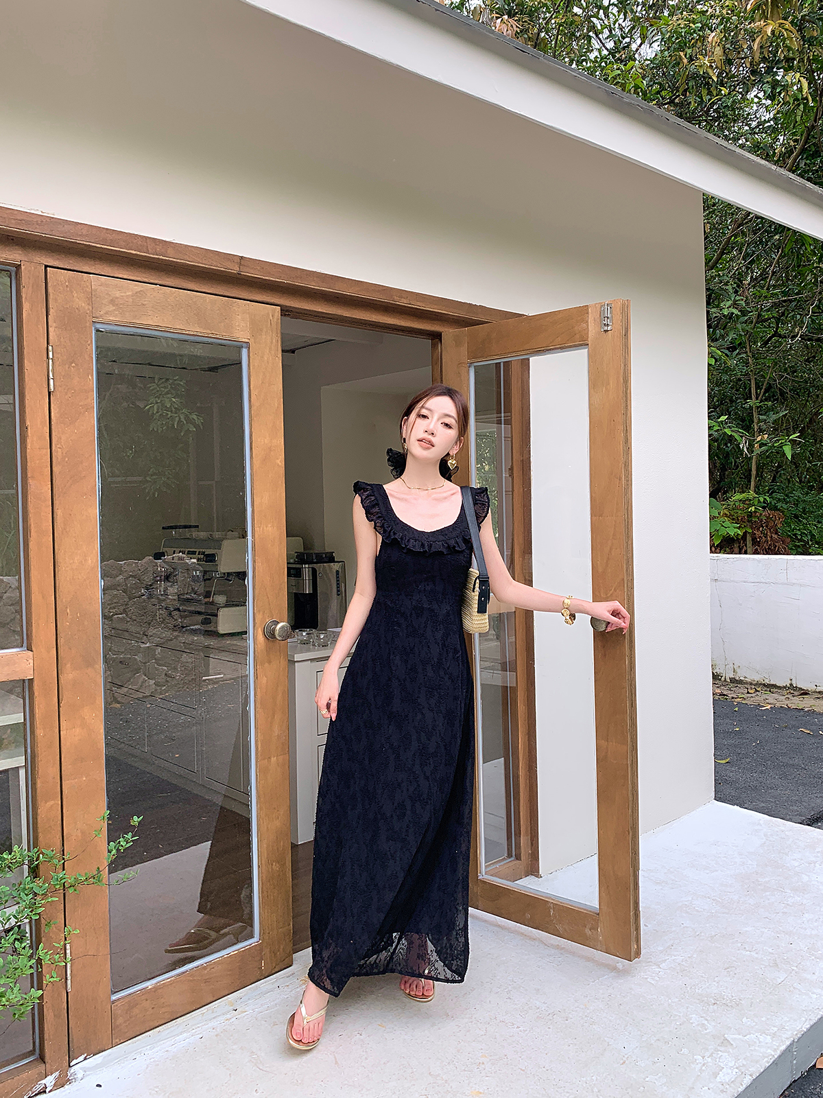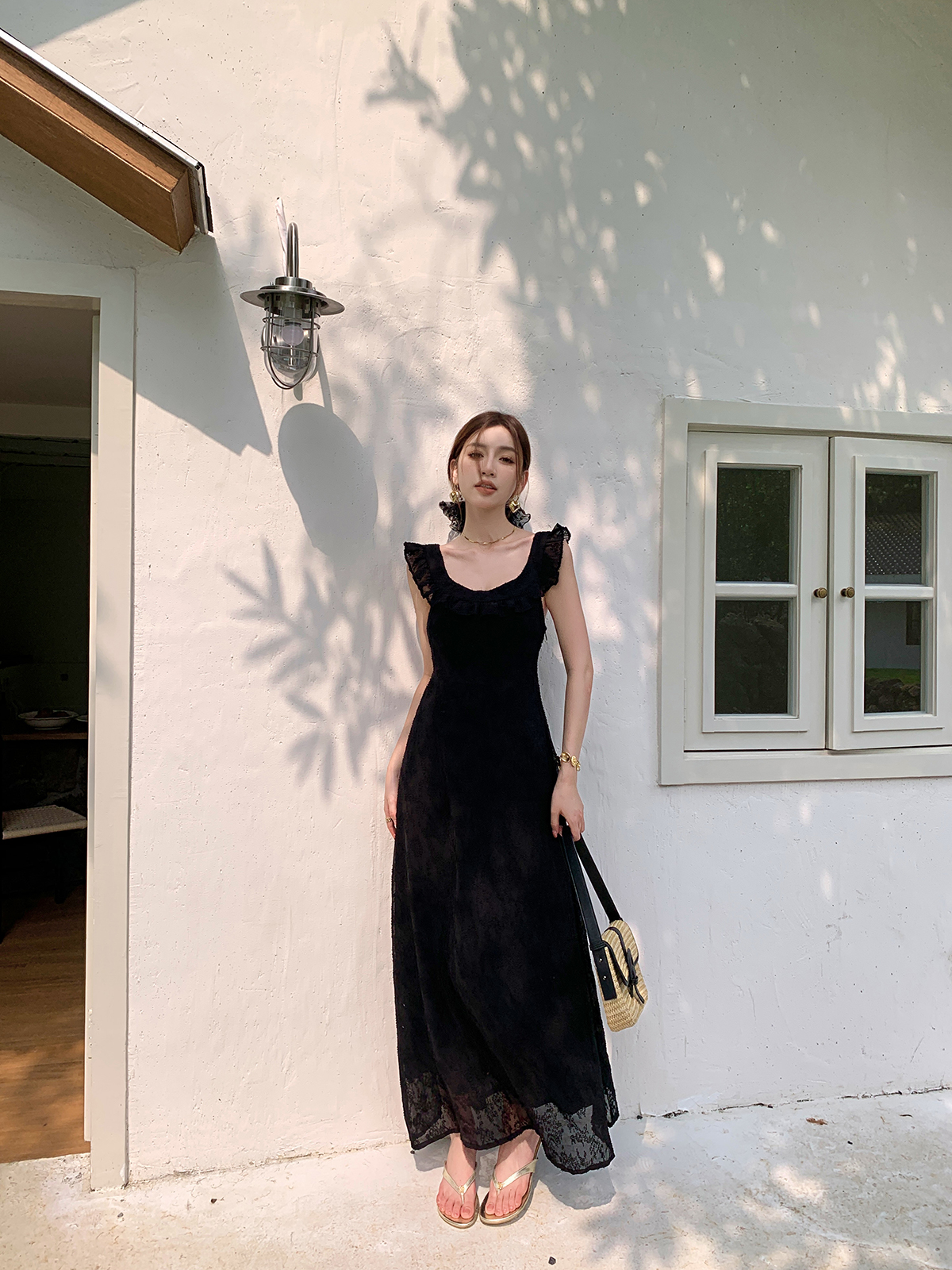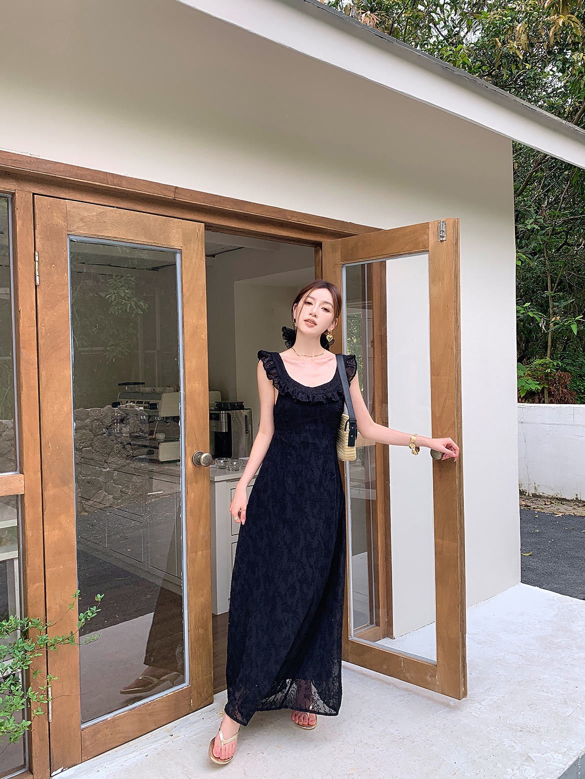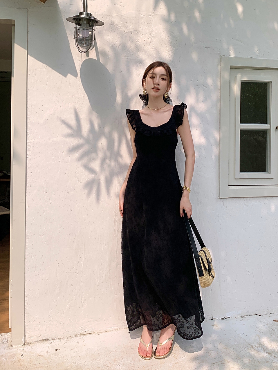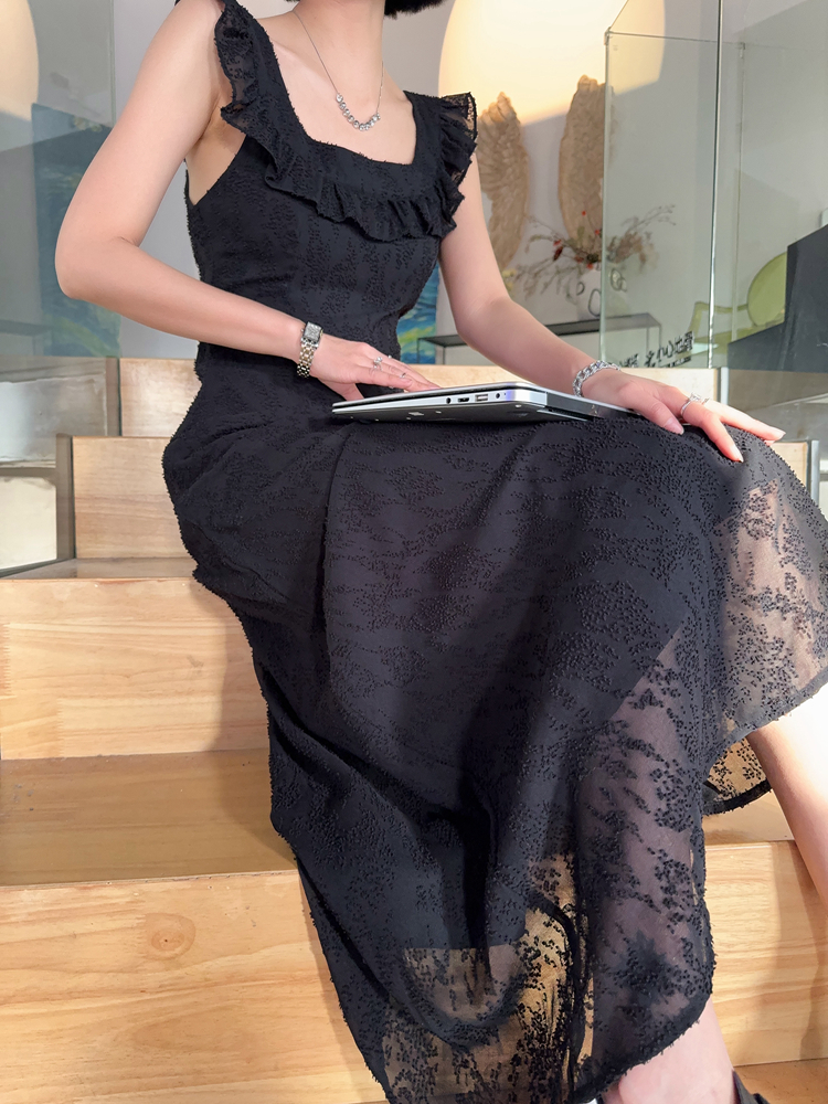 Concert Outfit High Waisted Black Floral Chiffon Long Dress Square Neckline Summer