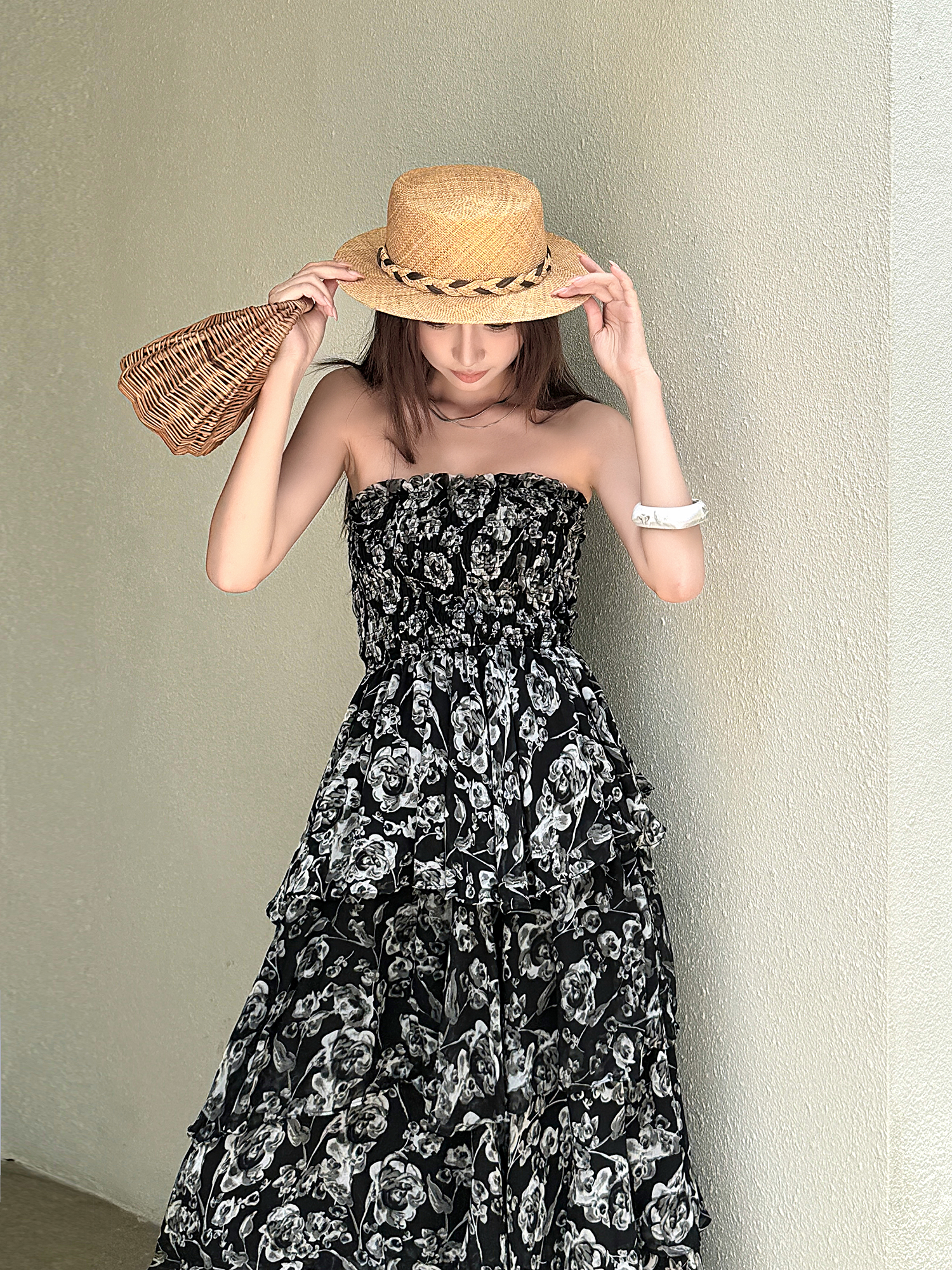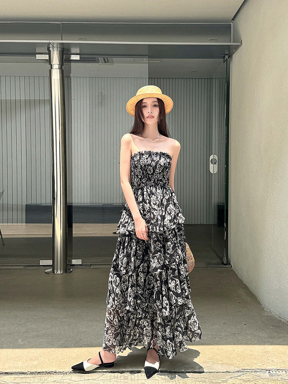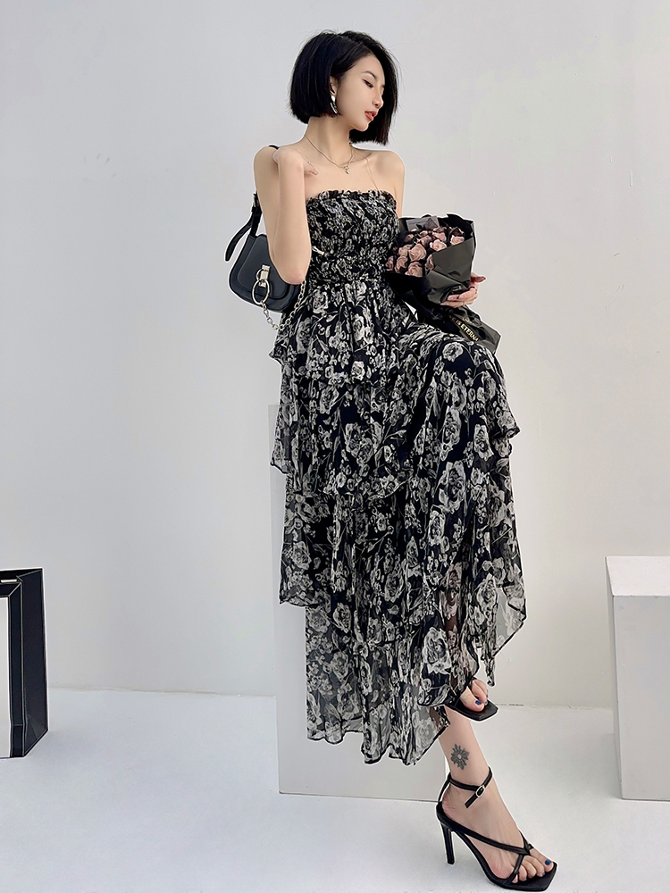 Concert Outfit High Waisted Strapless Summer DressLight Chiffon Printed Long Skirt