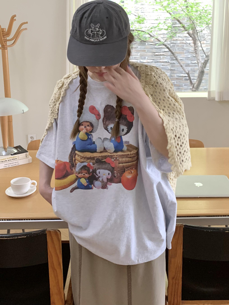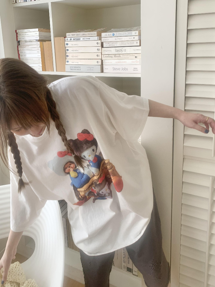 Concert Outfit Korean Casual Kitty Princess Cartoon Print Loose Cotton Short Sleeve T- shirt Top