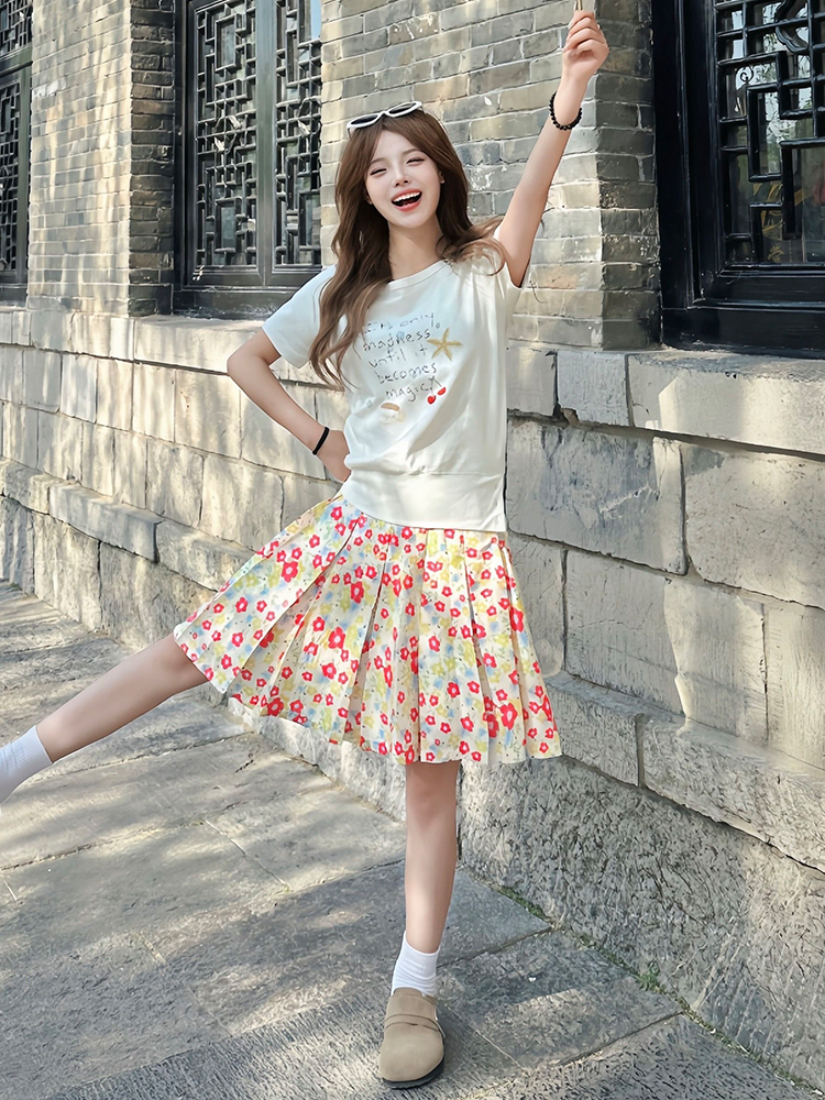 Elevate your summer wardrobe with our Korean Style Floral Pleated Skirt, a stunning A-line mid-length piece designed to flatter every figure. Crafted with a lightweight fabric, this colorful skirt features delicate floral patterns that bring a vibrant touch to your vacation outfits. Perfect for day outings or evening strolls, its pleated design ensures a graceful movement that enhances your feminine charm. Don’t miss out on this essential addition to your closet—add it to your cart today and step into effortless style!
