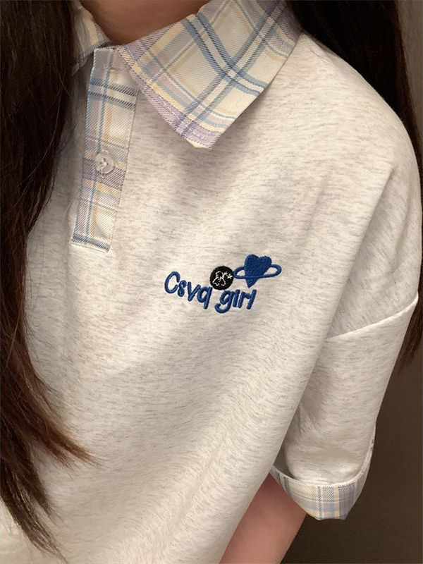Elevate your summer wardrobe with our Korean-Style Plaid Spliced Polo Collar Embroidered Short Sleeve T-Shirt for Women. This stylish top combines a trendy plaid pattern with a classic polo collar, offering a chic yet comfortable fit perfect for college outings or casual dates. The embroidered details add a unique touch, making it a standout piece in any fashionista’s collection. Don’t miss out on this versatile addition—add to your cart today and step out in style!