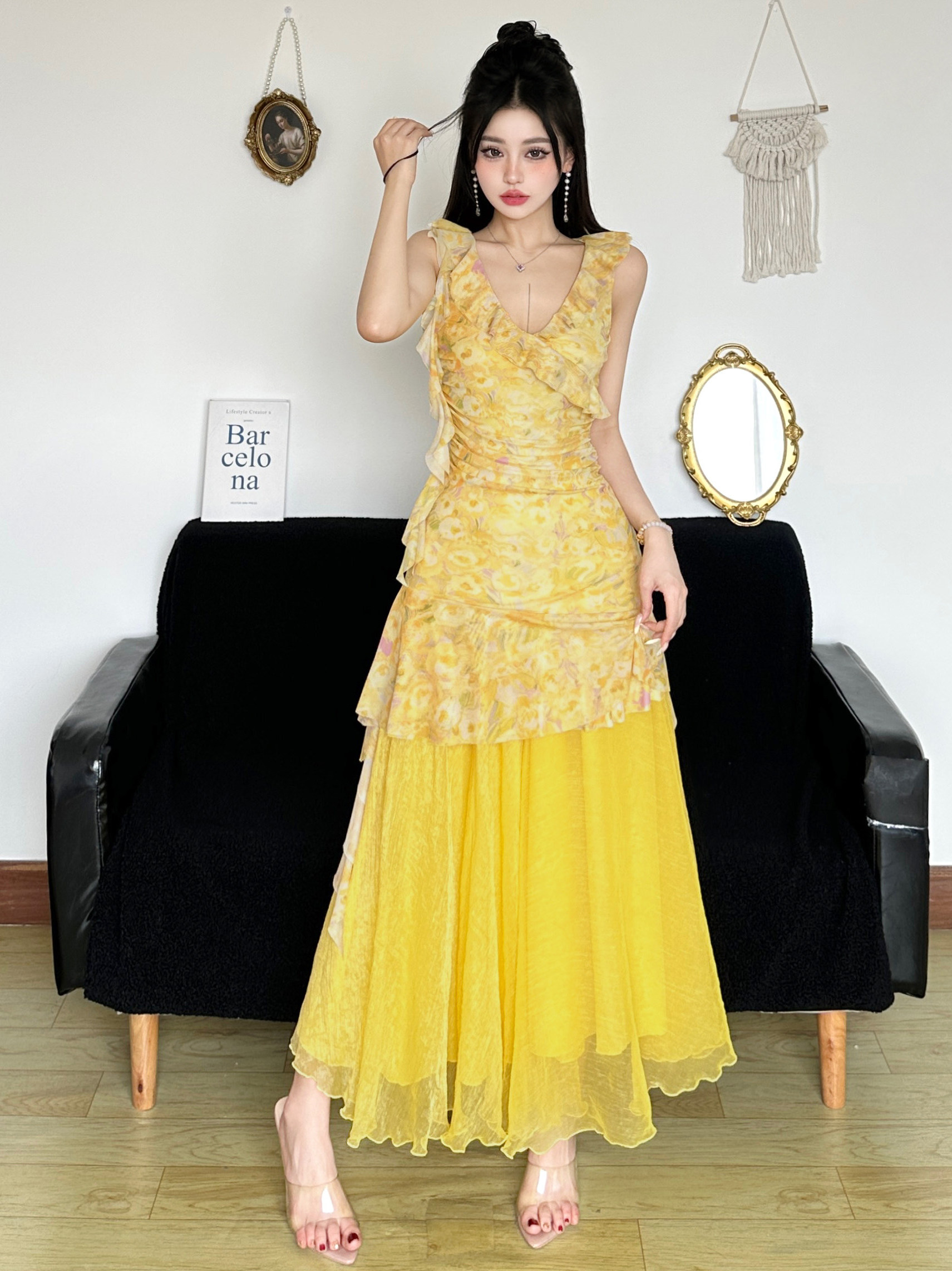 | Color | Floral dress, Layered long dress |
