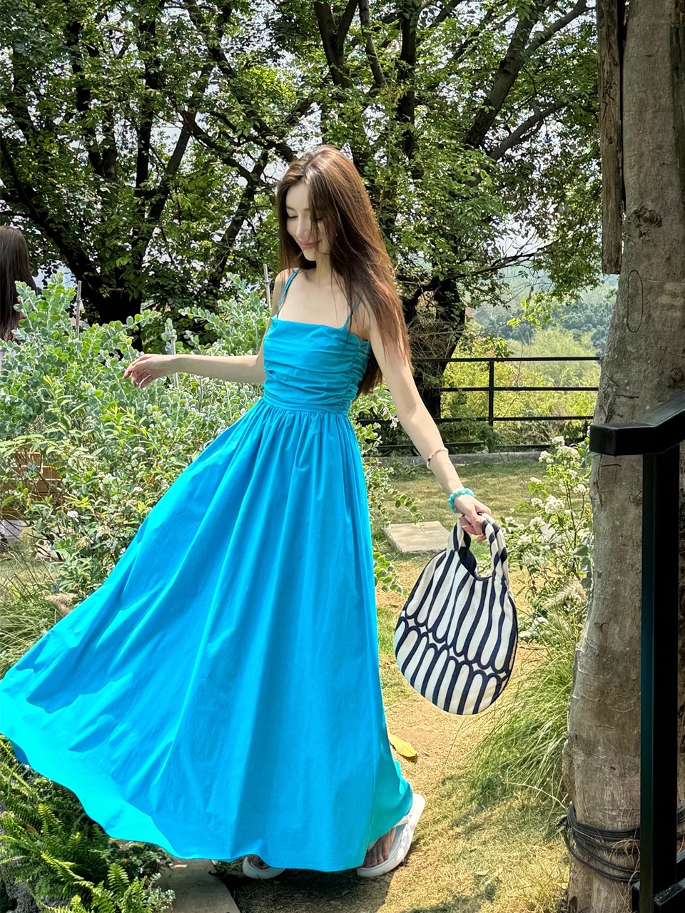 Concert Outfit Light Blue Spaghetti Strap Dress Cinched Waist, Flared Skirt, Summer, Ready