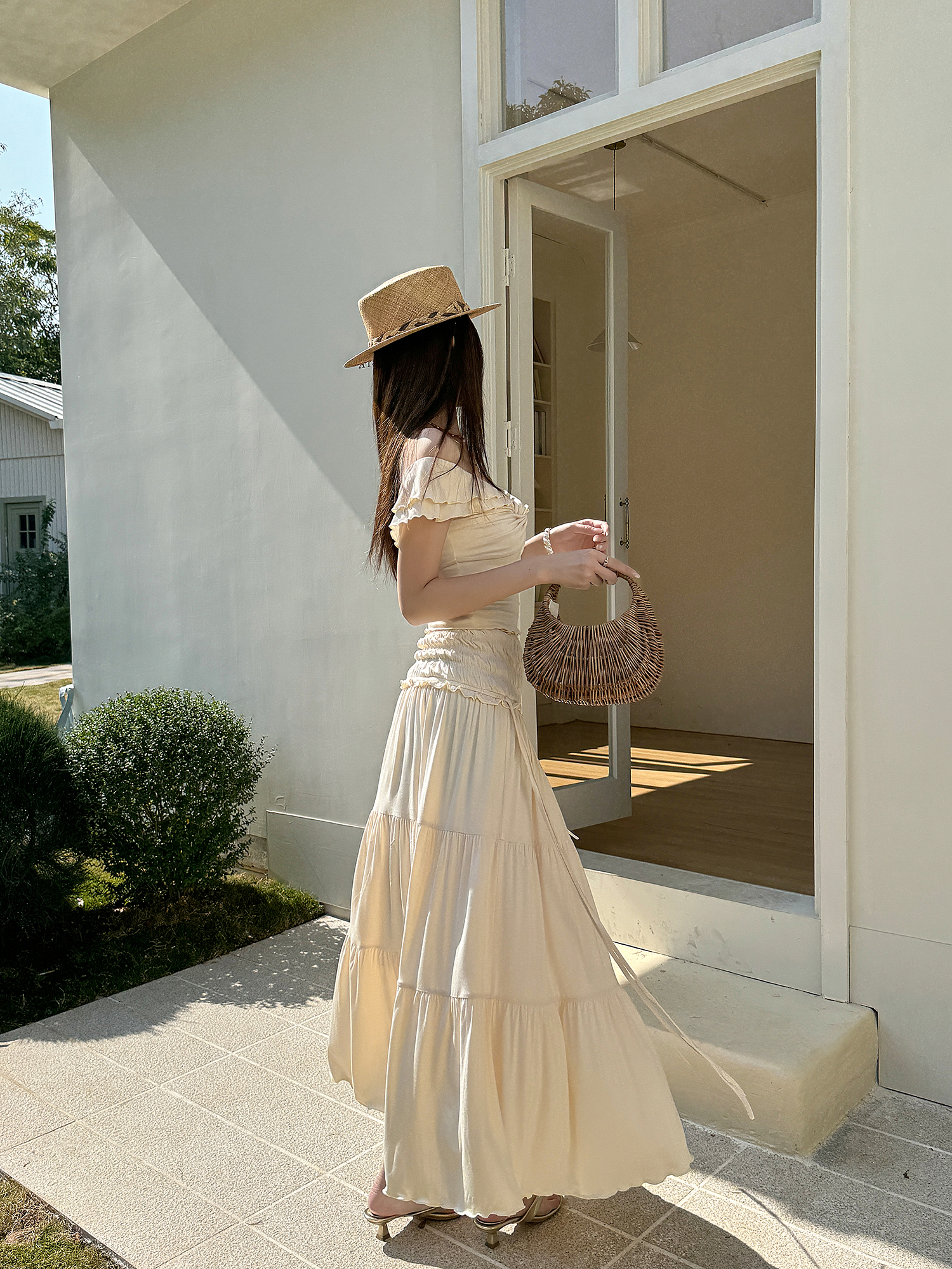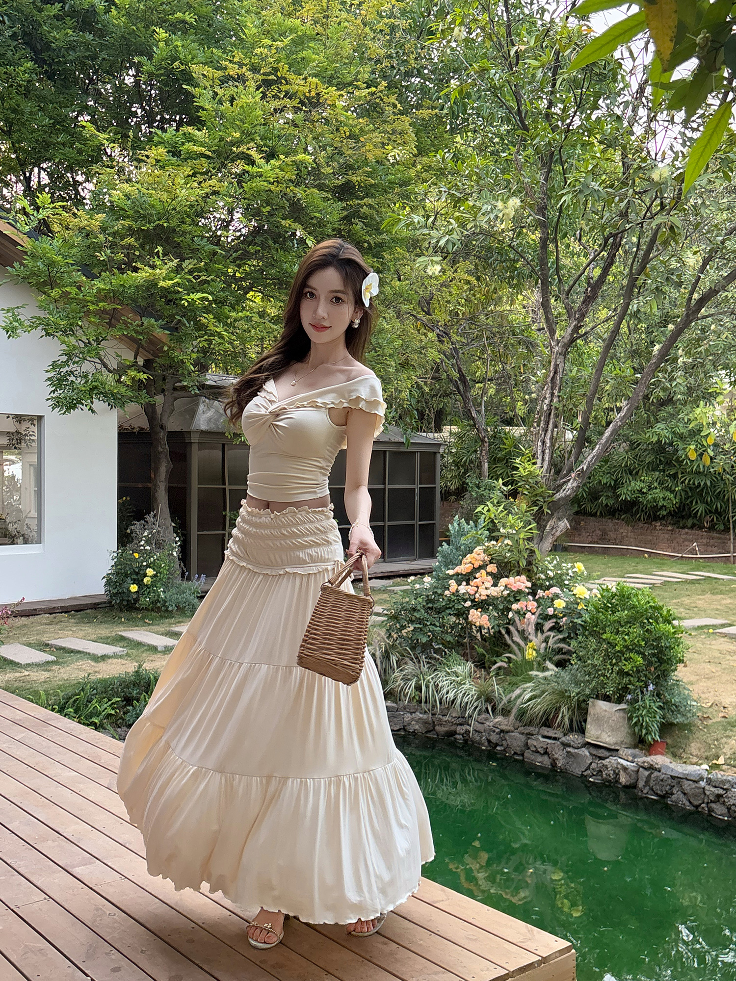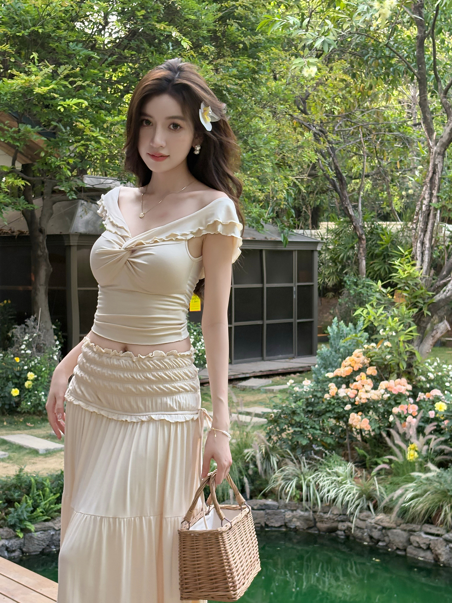 Elevate your summer wardrobe with our Lightweight One-Shoulder French Top featuring playful ear-shaped ruffles, paired perfectly with a flowing elastic long skirt. This chic set offers a flattering fit that accentuates your silhouette while ensuring all-day comfort, making it ideal for beach outings or casual brunches. Embrace effortless style and versatility this season—add this stunning ensemble to your cart today and make a statement wherever you go!