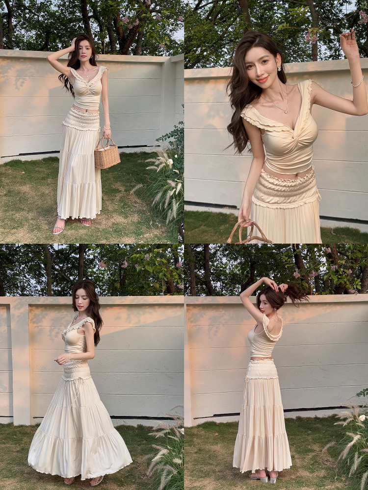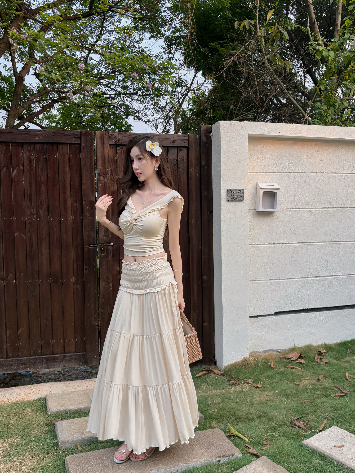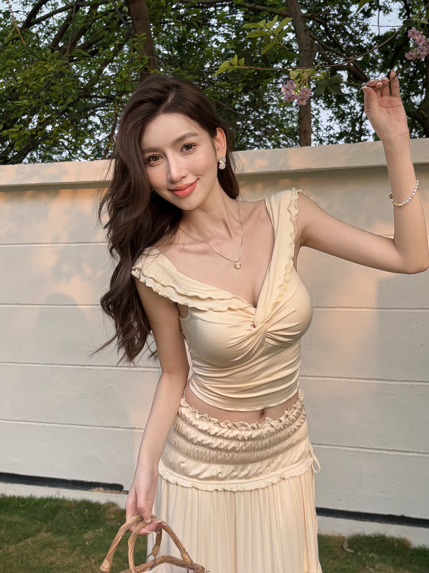 Elevate your summer wardrobe with our Lightweight One-Shoulder French Top featuring playful ear-shaped ruffles, paired perfectly with a flowing elastic long skirt. This chic set offers a flattering fit that accentuates your silhouette while ensuring all-day comfort, making it ideal for beach outings or casual brunches. Embrace effortless style and versatility this season—add this stunning ensemble to your cart today and make a statement wherever you go!