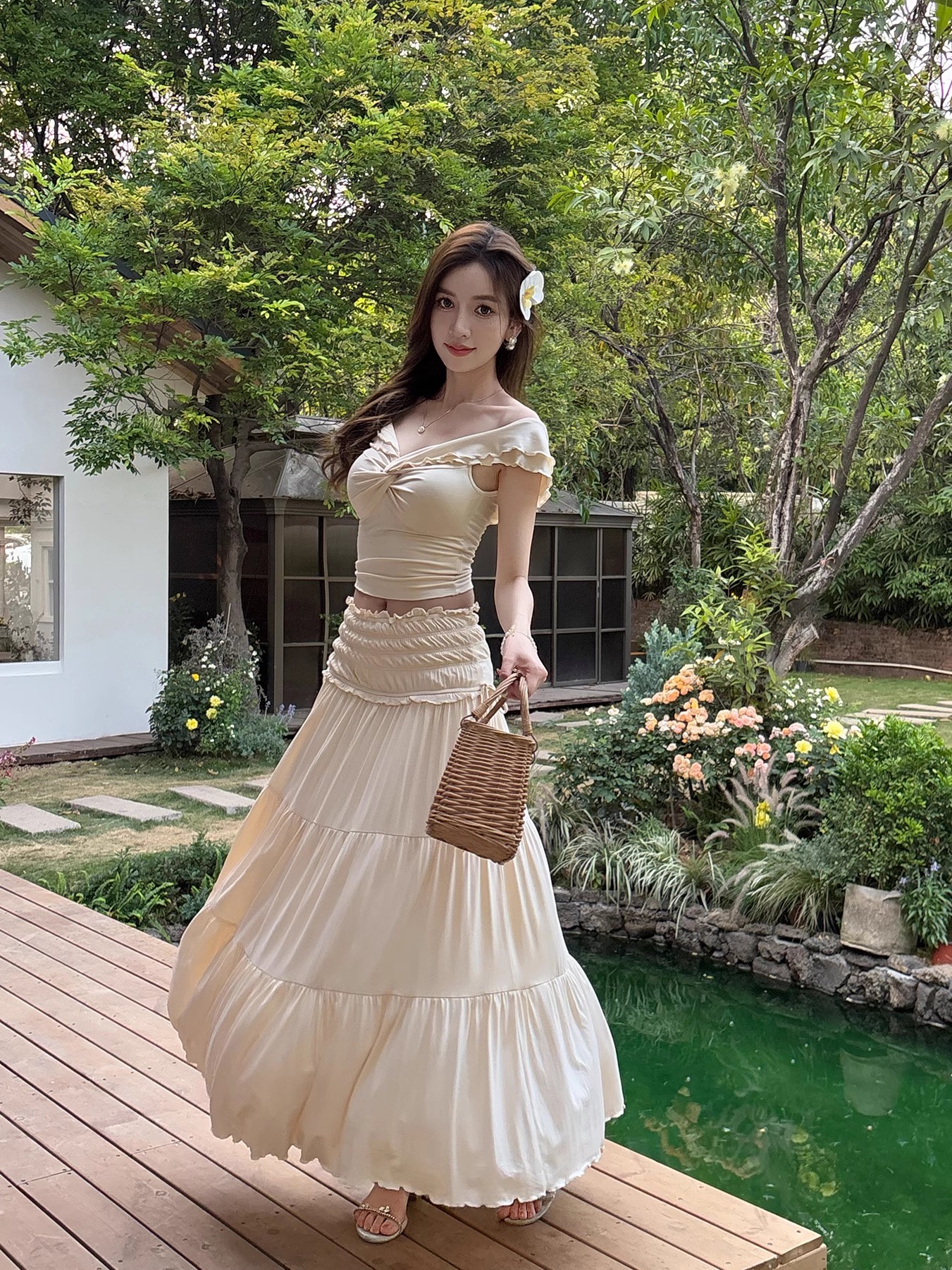 Concert Outfit Lightweight One Shoulder Top Ear Shaped Ruffles, Elastic Long Skirt Set Summer