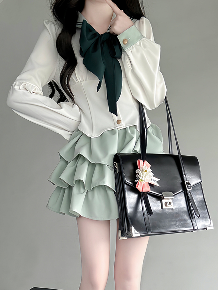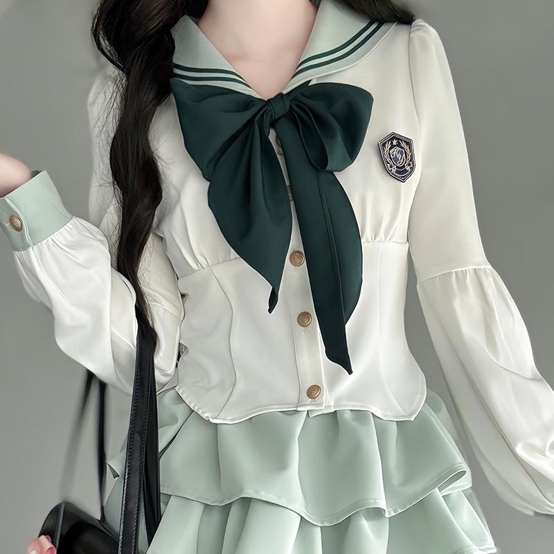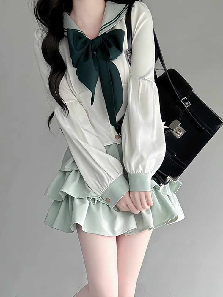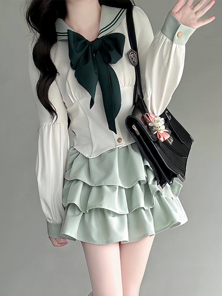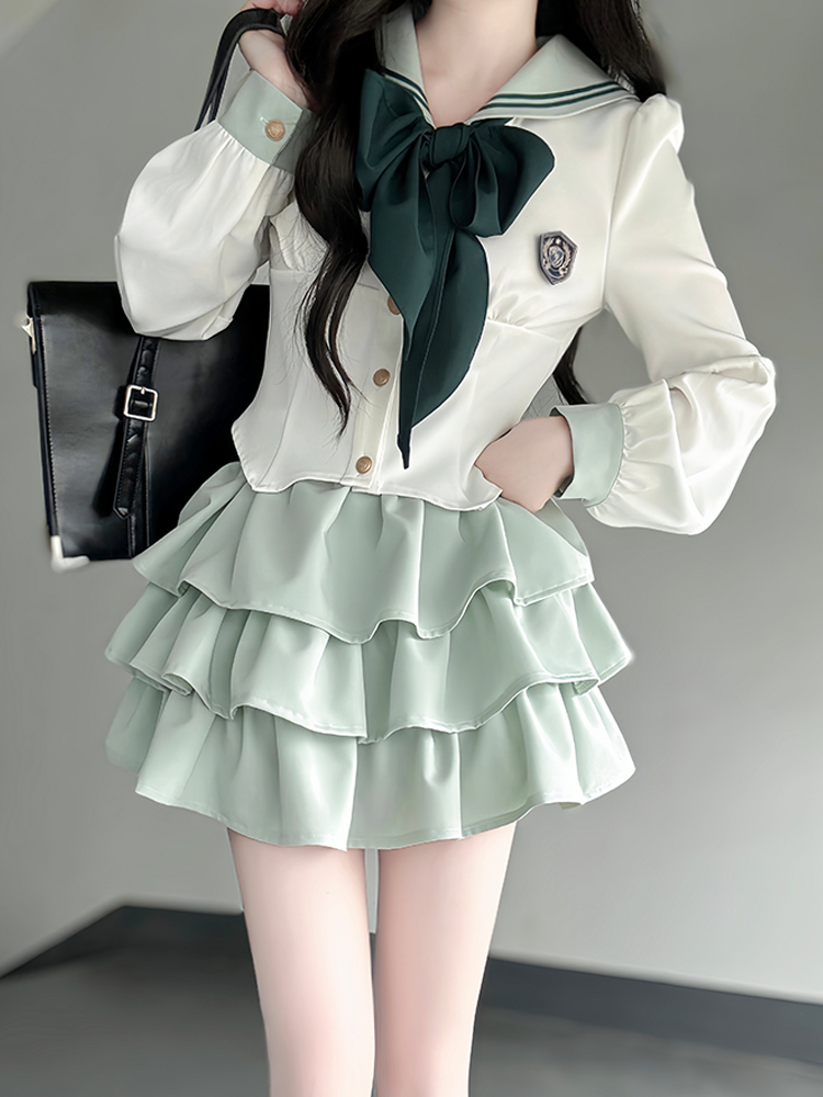 | Color | Cake skirt (green), Green long-sleeve outfit (top + skirt + scarf), Green top (long sleeve) |