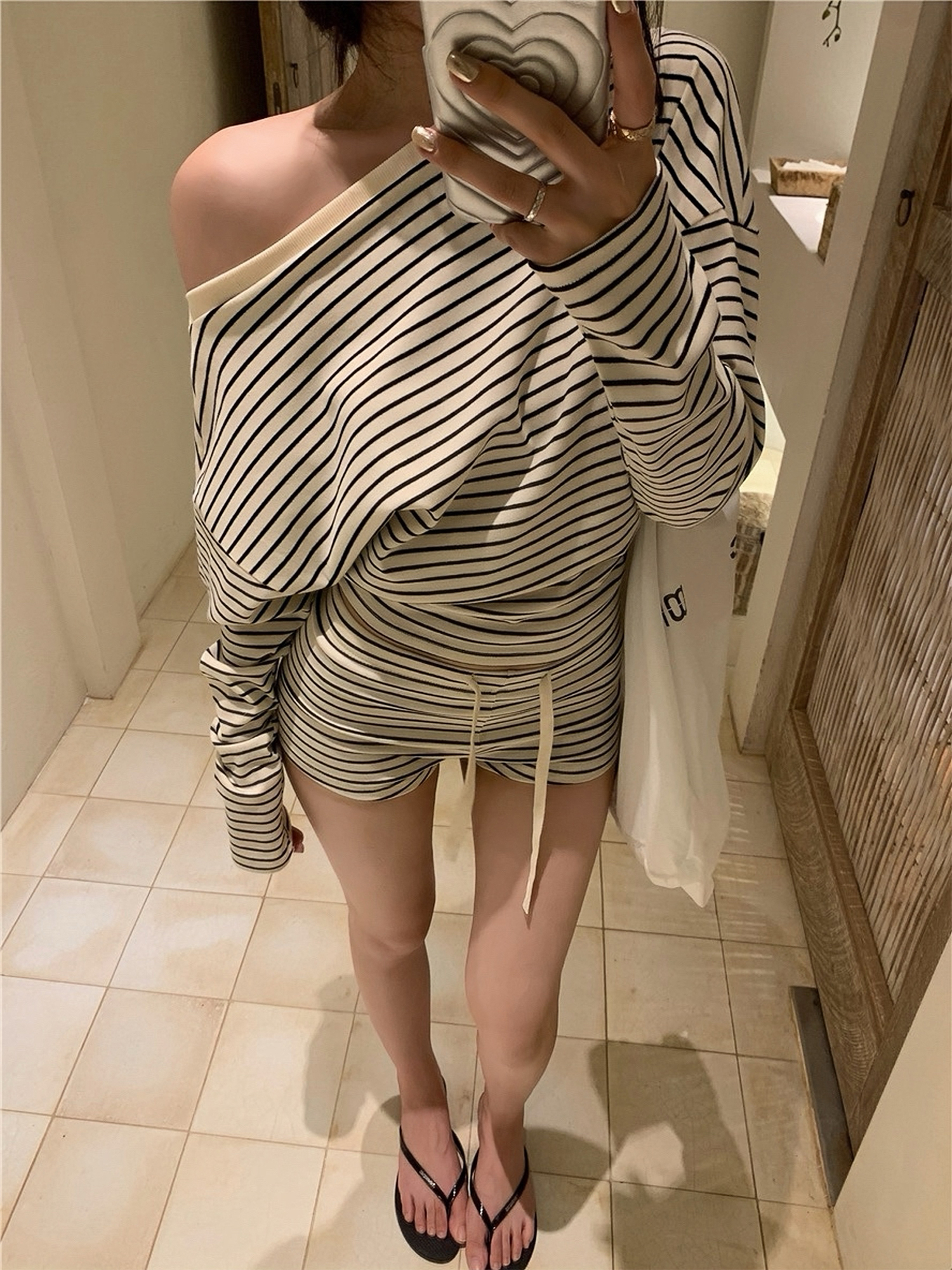 Elevate your casual wardrobe with our Off-Shoulder Long Sleeve Waist-Cinching Black and White Striped Top paired with stylish cotton shorts, perfect for a Y2K-inspired look. This eye-catching outfit features a flattering off-shoulder design that highlights your neckline, while the cinched waist creates a beautifully defined silhouette. Made from soft, breathable fabric, this ensemble promises all-day comfort and effortless style. Ideal for brunches or casual outings, it’s the go-to outfit for making a statement. Don’t miss out on this trendy addition—add to your cart today!