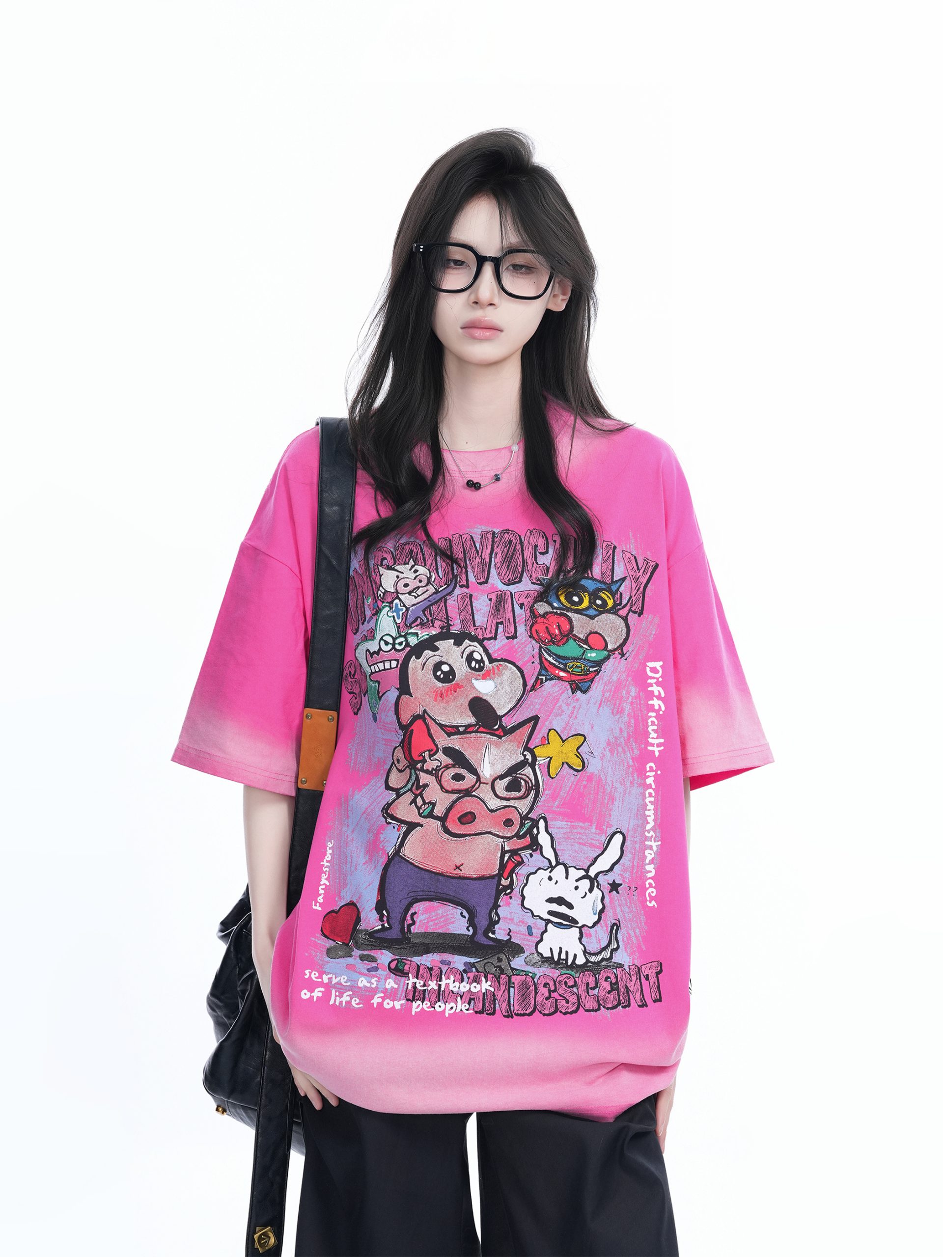 Elevate your casual wardrobe with our Pink Gradient Cartoon Print Loose-Fit Short-Sleeve T-Shirt for Women. Designed with a relaxed fit and eye-catching cartoon graphics, this heavy-duty top combines comfort and playful style, perfect for any casual outing or lounging at home. Made with high-quality materials, it offers durability and a flattering silhouette that pairs effortlessly with your favorite jeans or shorts. Don’t miss out on adding this trendy piece to your collection – add to your cart today!