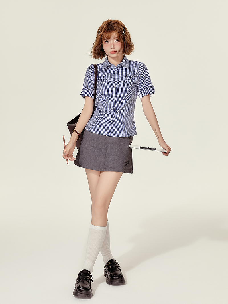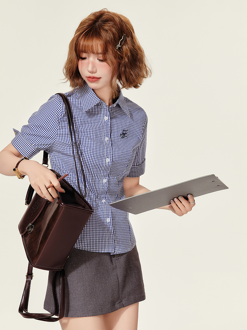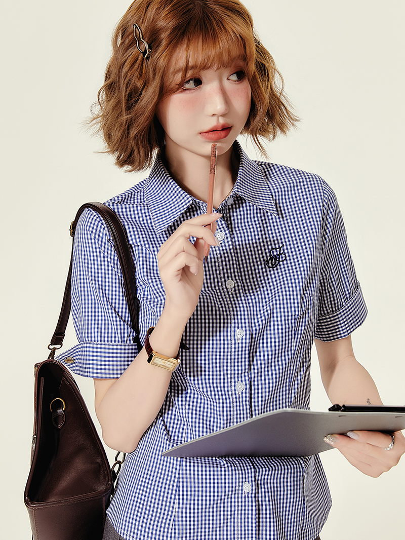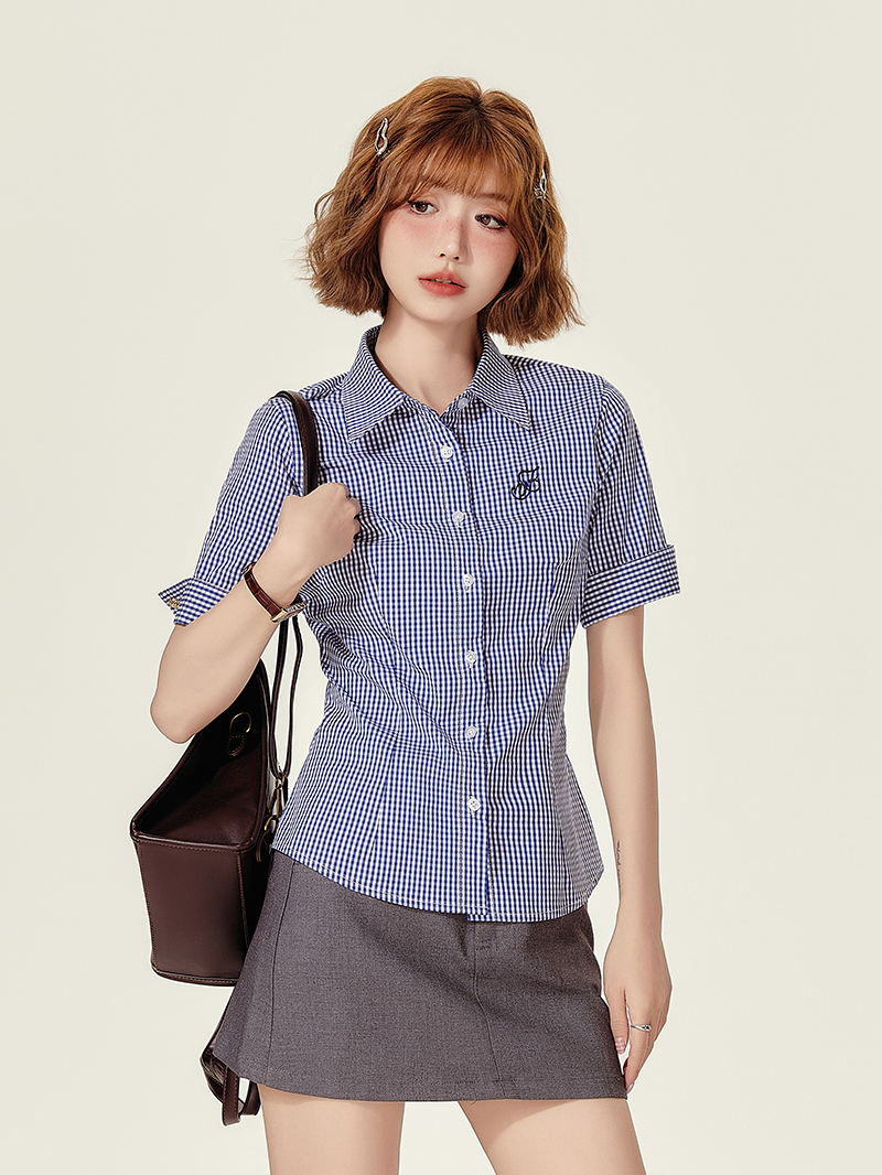 Stylish Concert Outfit: Plaid Embroidered Short Sleeve Shirt for Women
