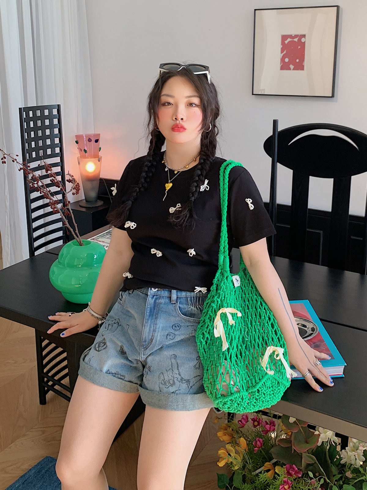 Elevate your summer wardrobe with our Plus Size Pearl Bow T-Shirt for Women, a stunning handmade piece designed for style and comfort. This chic short sleeve top features a playful pearl bow detail that adds a trendy touch, perfect for any casual outing or special occasion. With its flattering fit and breathable fabric, you’ll stay cool and fashionable all season long. Don’t miss out on this must-have addition to your closet—add to your cart today!