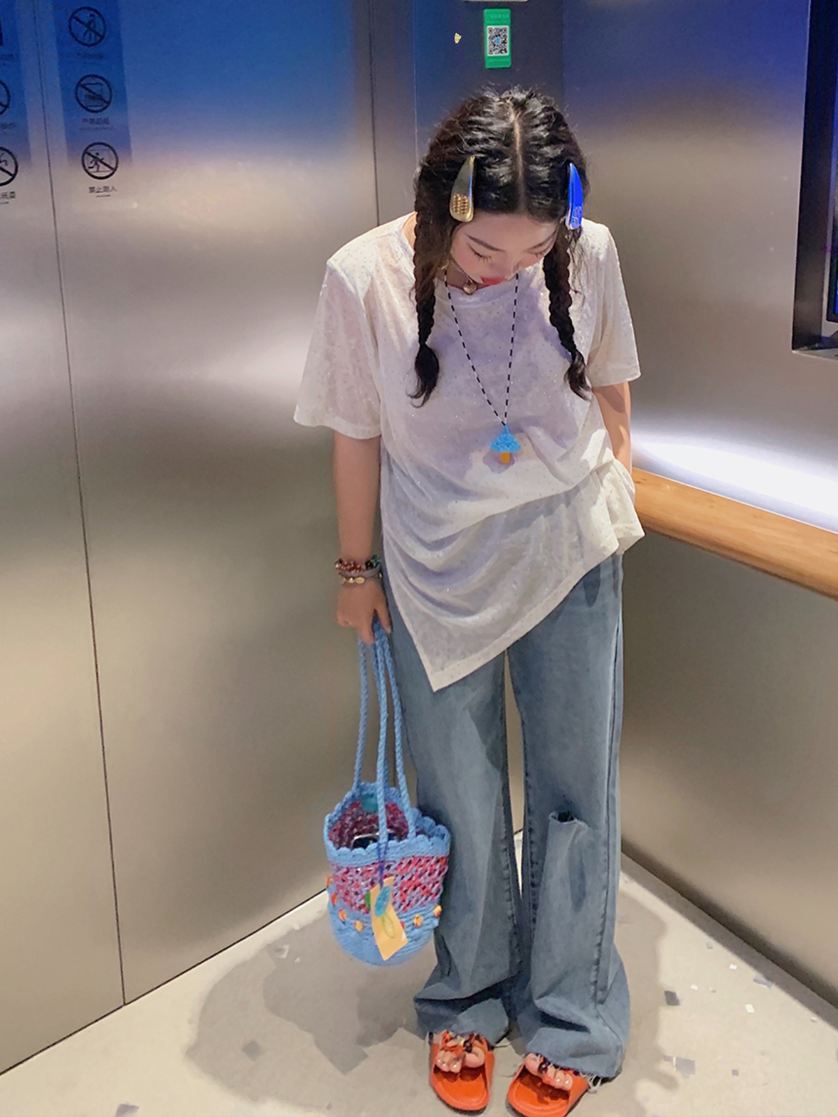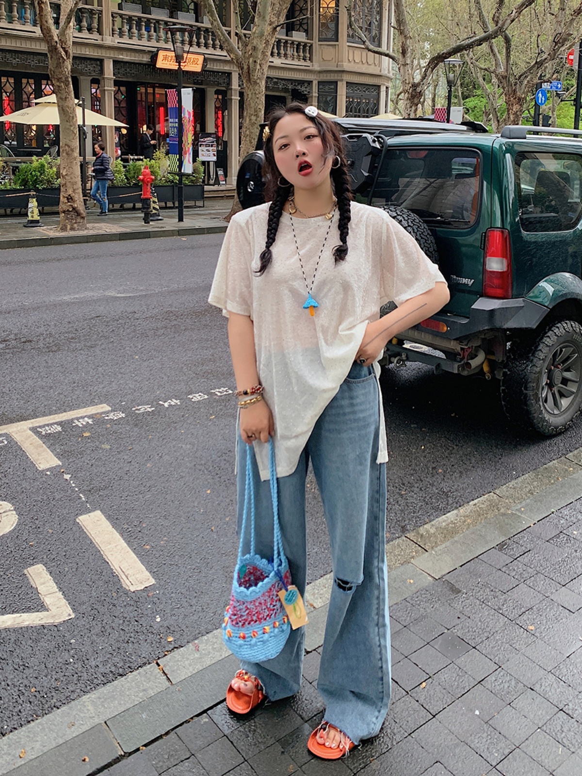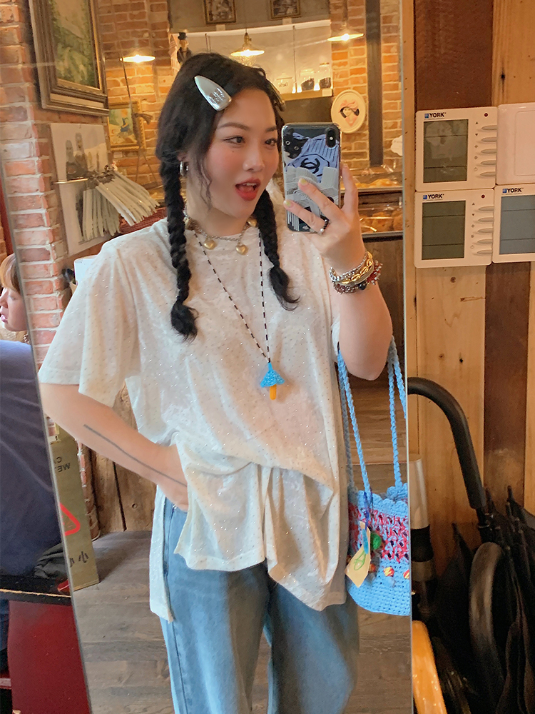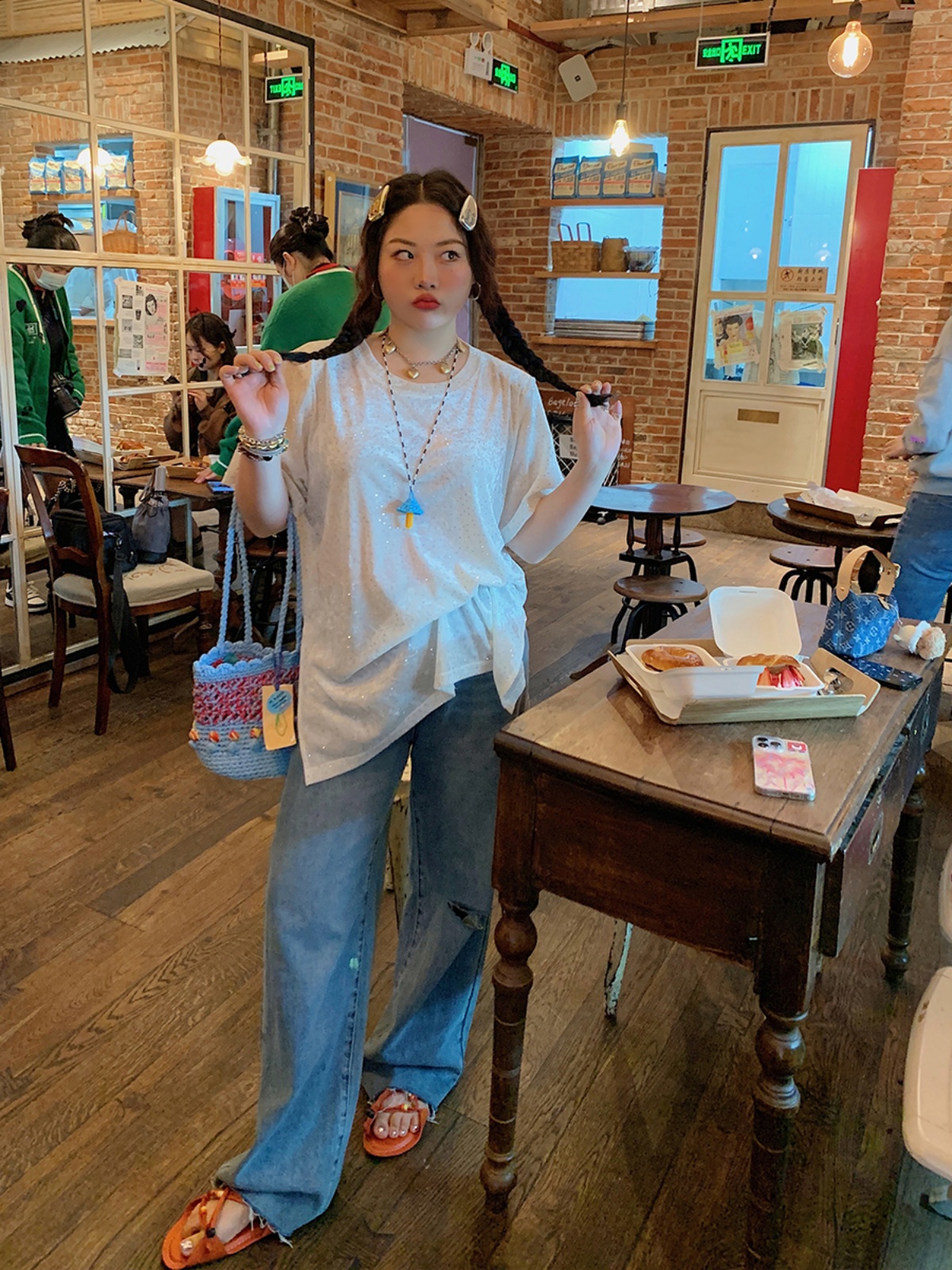 Concert Outfit Plus Size Slit Diamond T- shirt Women Short Sleeve White Top, pring/Summer Curvy Figures