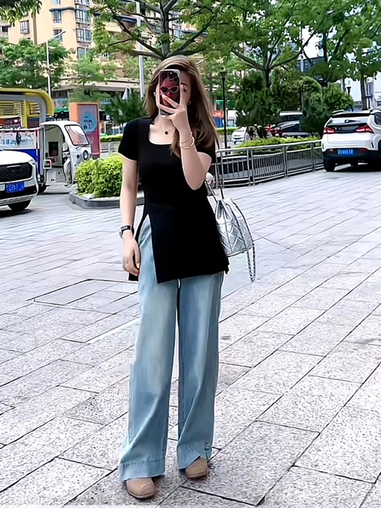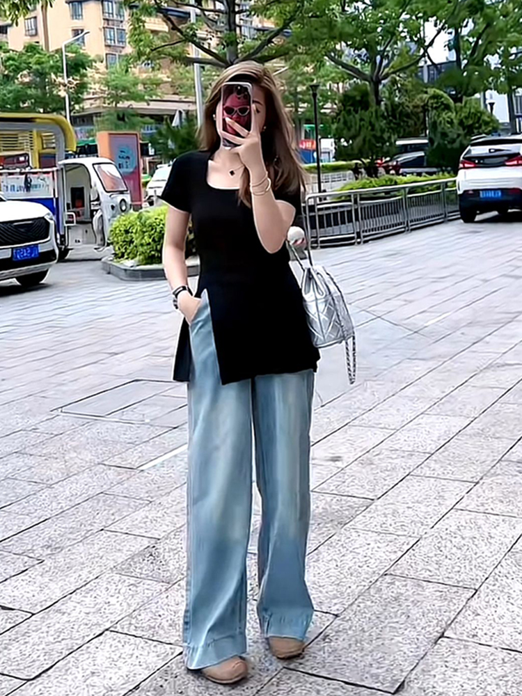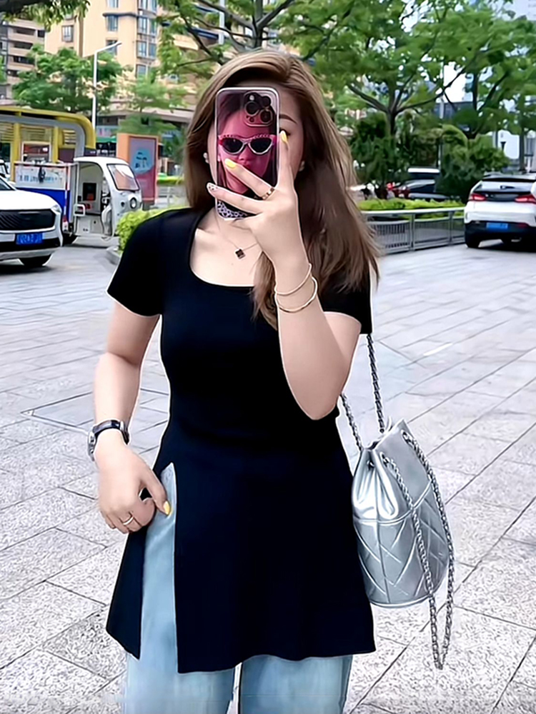 Concert Outfit Plus Size Women Ice Silk Side Slit T- shirt Knitted Summer Top Chubby Figures