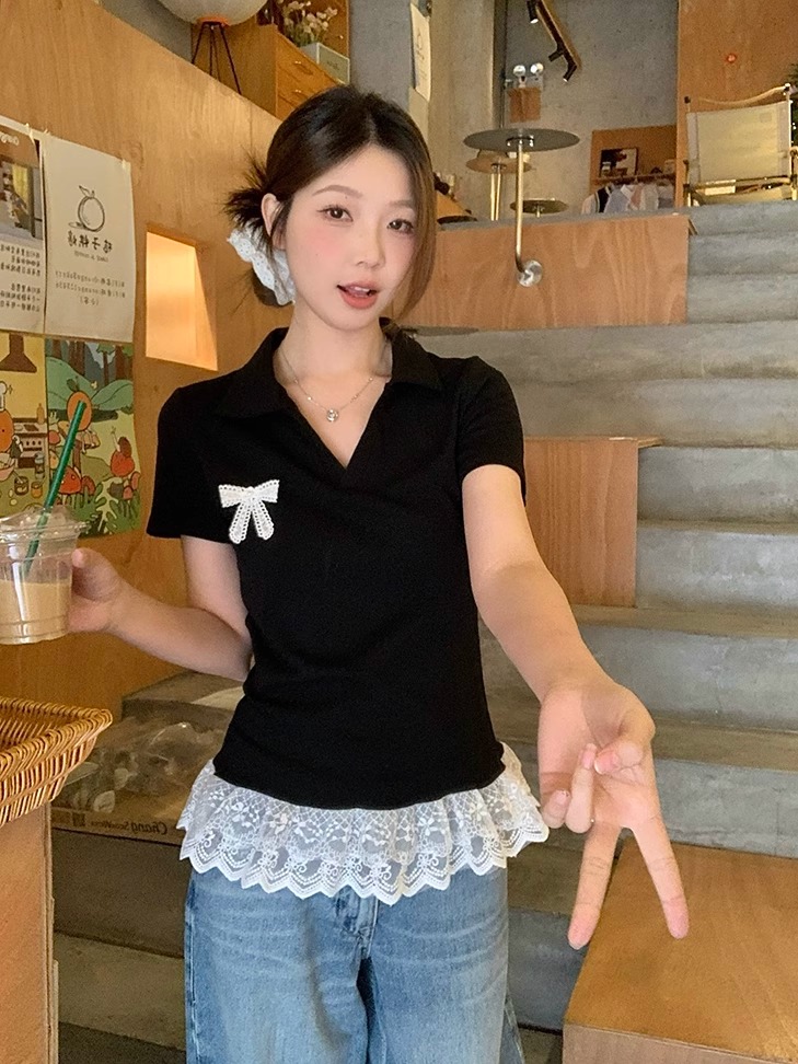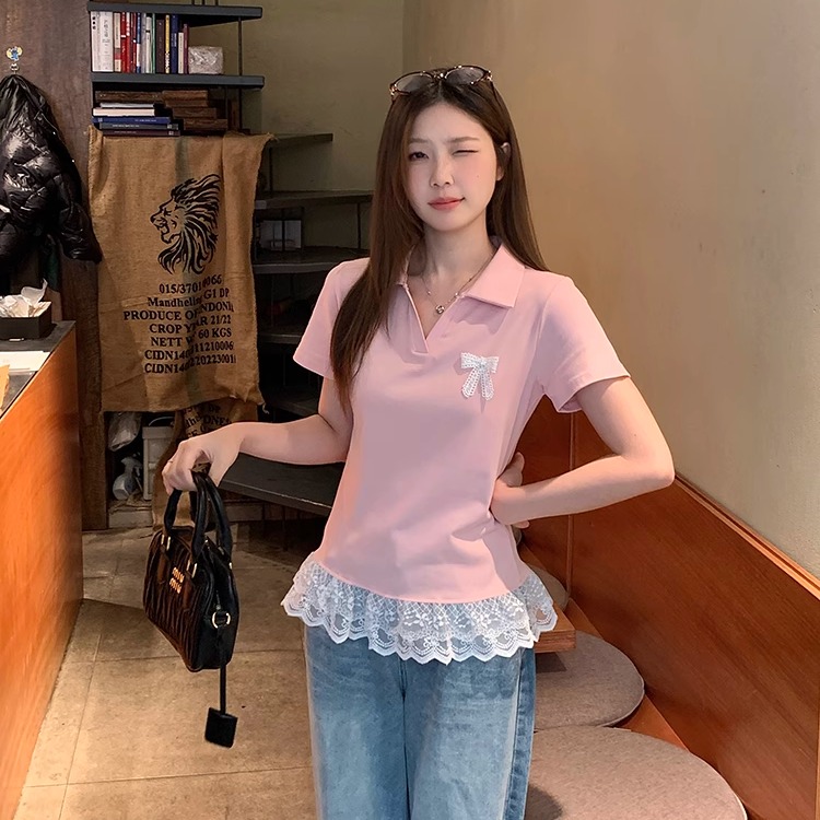 Elevate your summer wardrobe with our Plus-Size Women’s Lace Patchwork Bow Short-Sleeve T-Shirt, designed for curvy girls who love to embrace their style. This sweet and slimming lapel top features delicate lace accents and a charming bow detail, offering a flattering fit that accentuates your curves while keeping you comfortable all day long. Perfect for casual outings or dressy occasions, this versatile tee pairs beautifully with your favorite jeans or skirts. Don’t miss out on this must-have piece—add to your cart and step out in style!