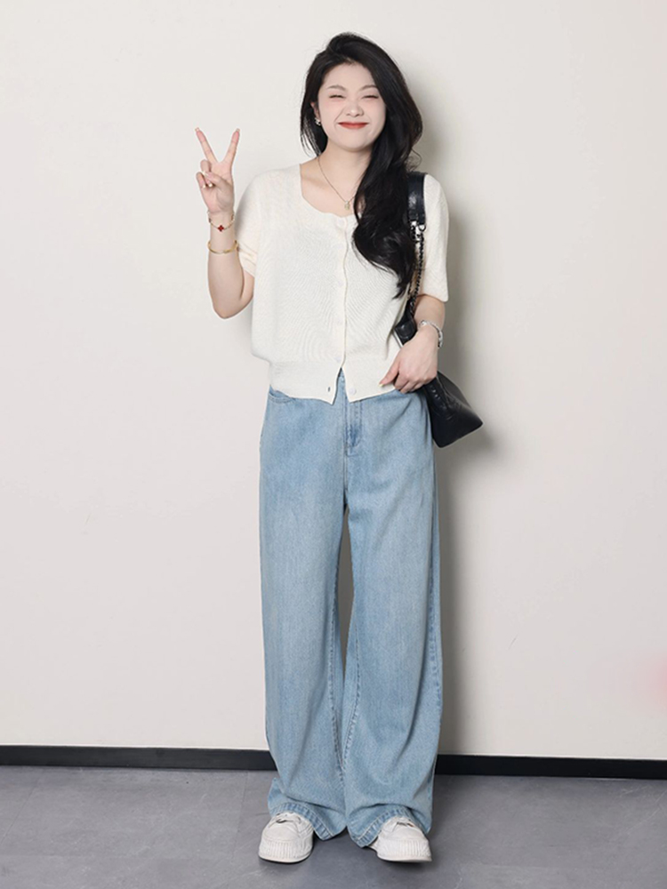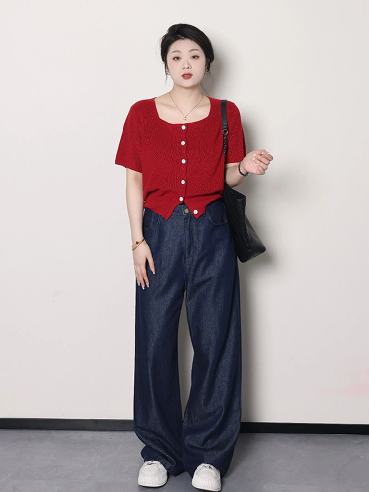 Concert Outfit Plus Size Women Summer Short Sleeve Ice Silk Knitted Top Flattering Square Neck Blo Curvy Figures