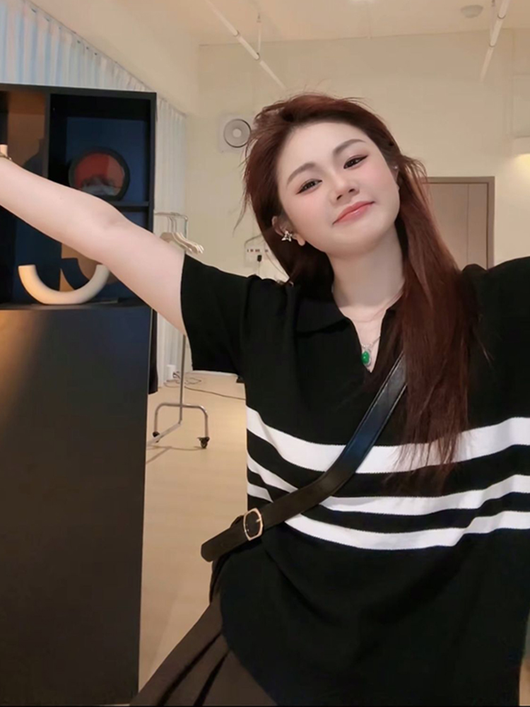 Concert Outfit Plus Size Women Summer Short Sleeve Striped Polo Collar Knitted Top Youth