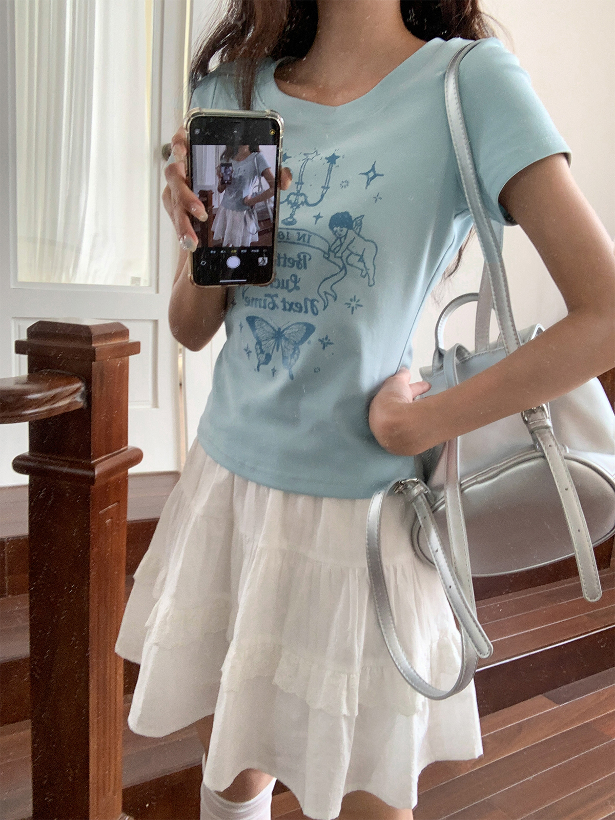 Concert Outfit Retro Angel Print Slim Fit Short Sleeve T- shirt Women Summer, Casual, Y2K, Top
