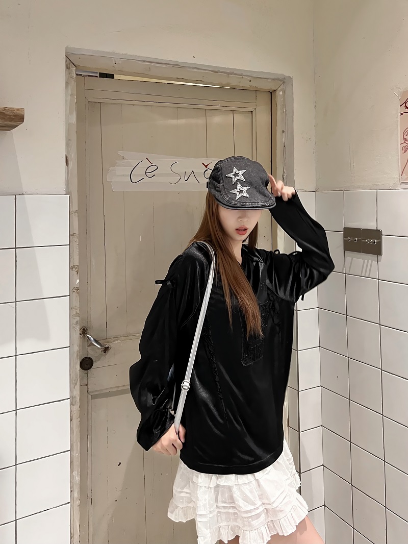 Retro Revival Concert Outfit: Lace Bow Long Sleeve T-shirt for Women