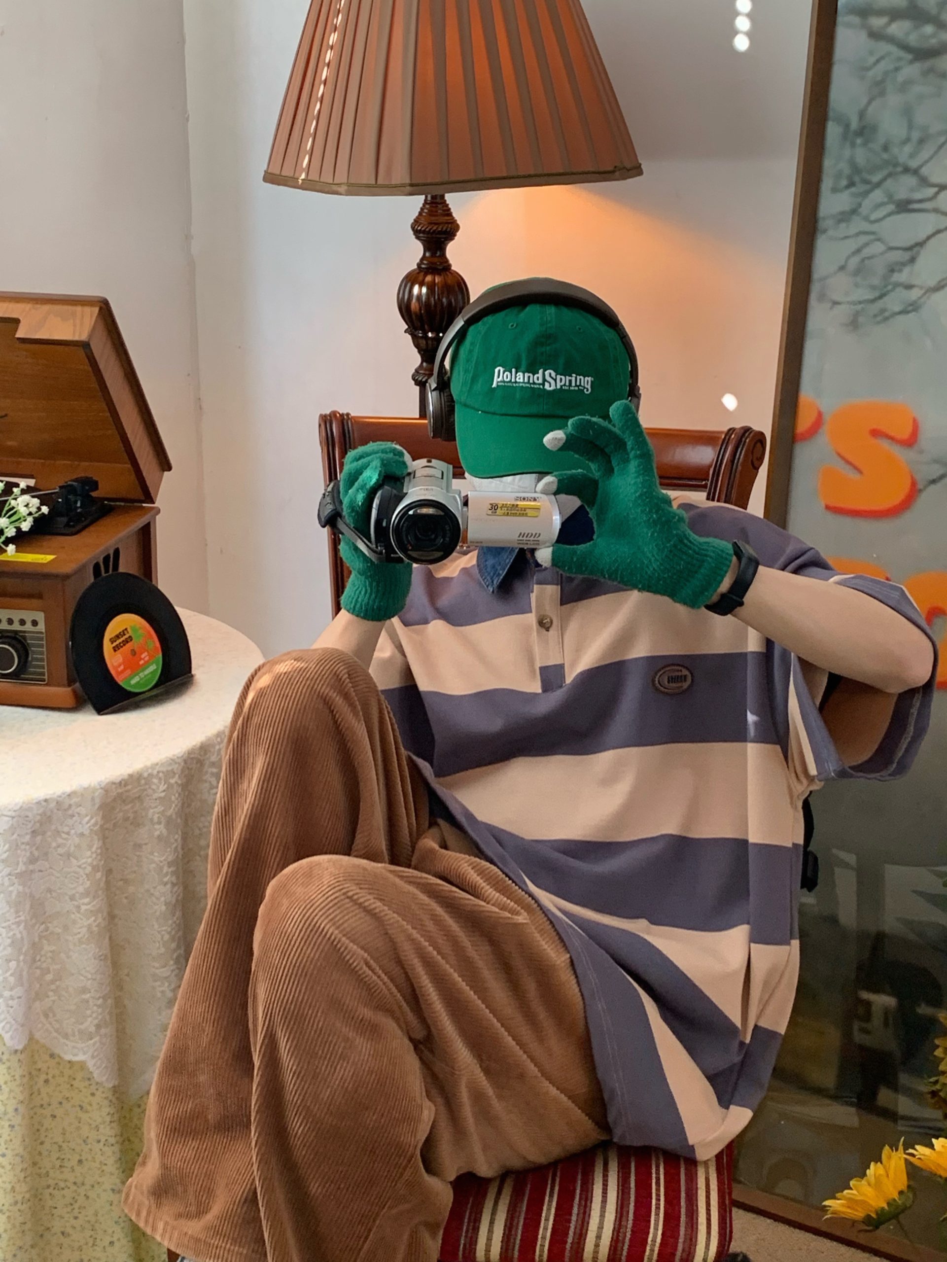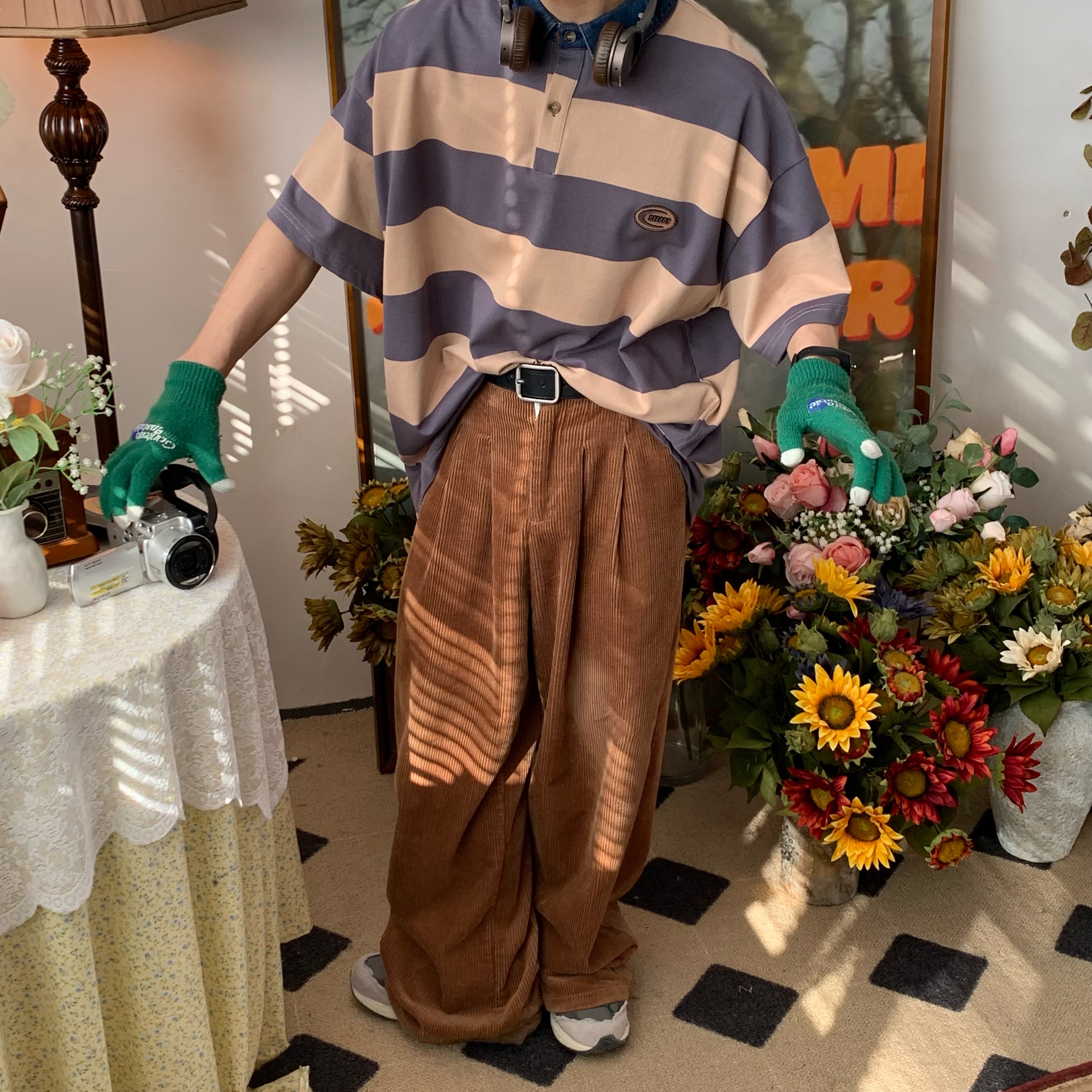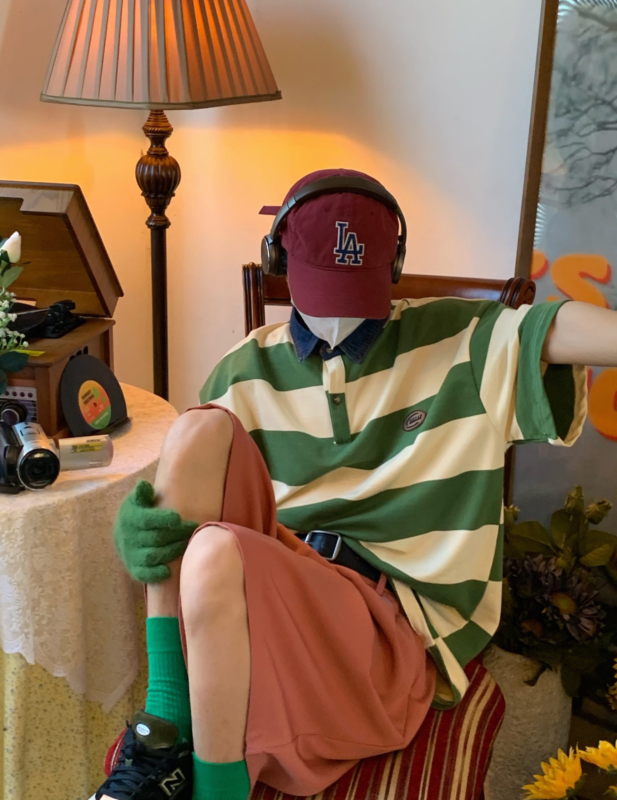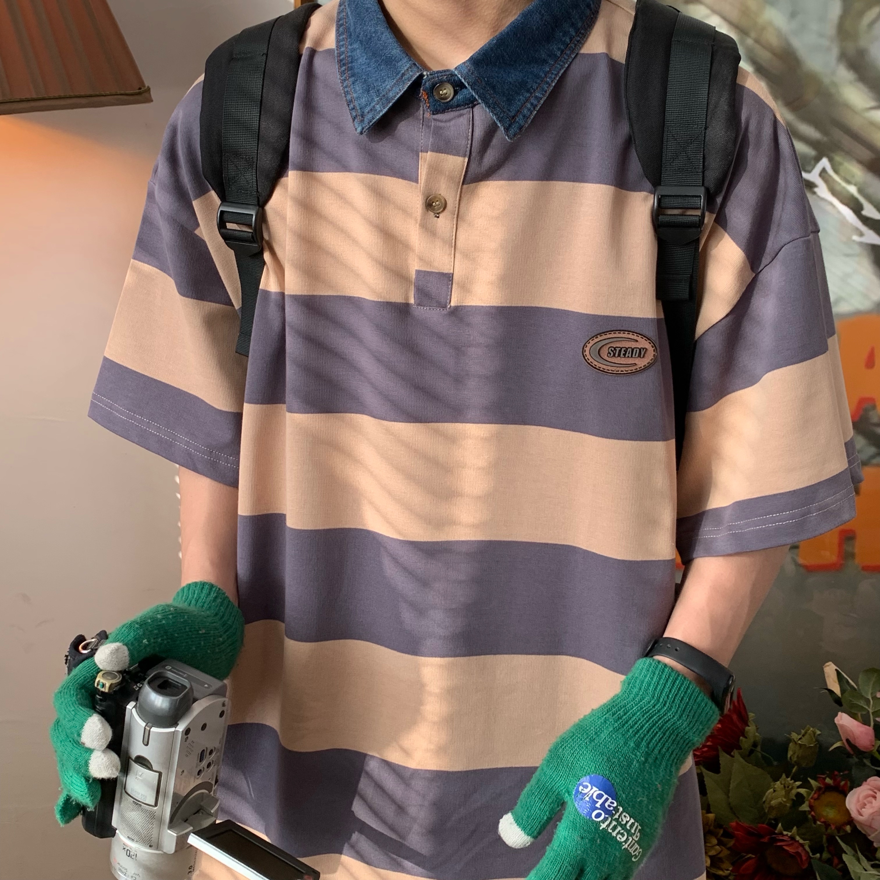 Concert Outfit Retro Striped Polo Shirt Denim Collar Loose Fit, Short Sleeve, College, pired Top
