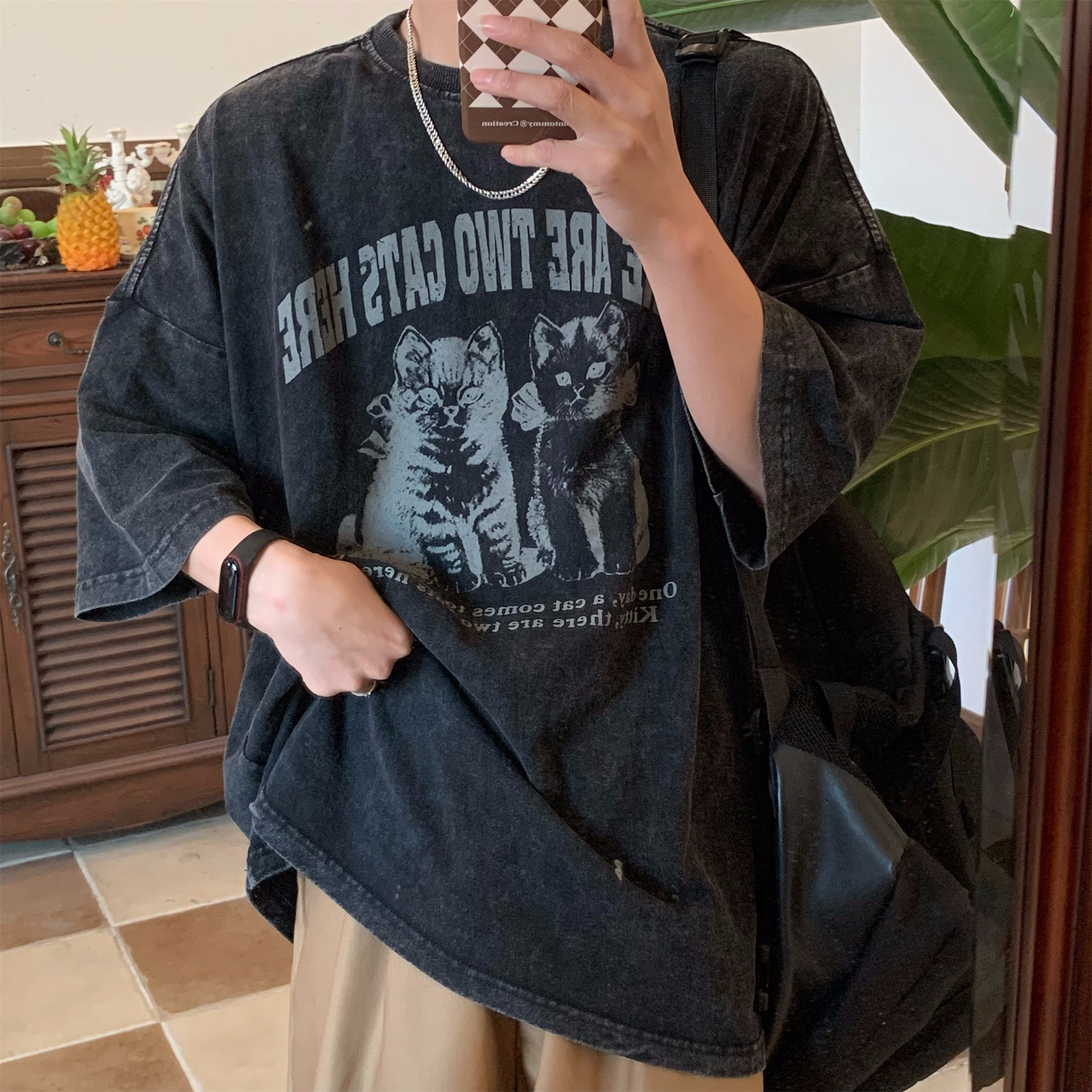 Embrace the Y2K vibe with our Retro Trendy Washed Vintage Cat Print Loose Fit Couple Round Neck Short Sleeve T-Shirt. This stylish tee features a playful cat graphic, perfect for those who love to showcase their unique fashion sense. Its relaxed fit ensures all-day comfort, making it an ideal choice for casual outings or lounging at home. Don’t miss out on this must-have addition to your wardrobe—add it to your cart today!