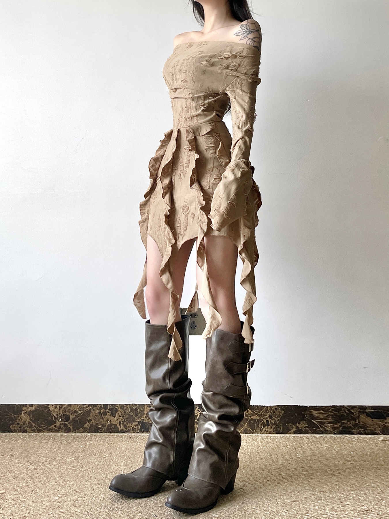Stylish Concert Outfit: Ruffled Tassel Light Denim Off-shoulder Mini Skirt