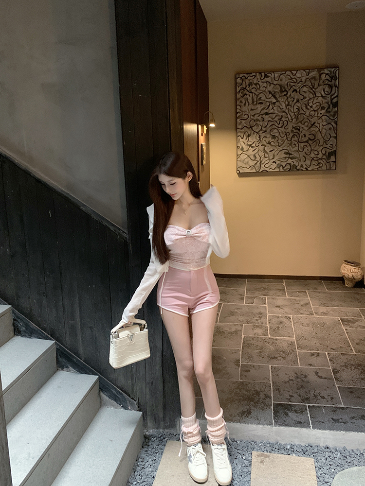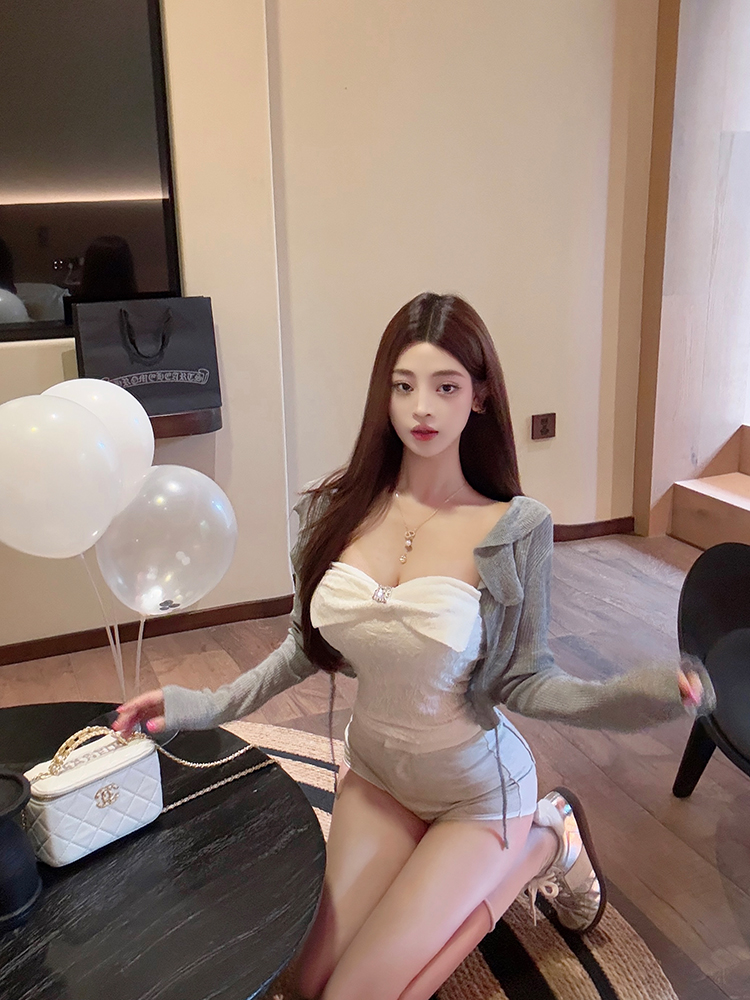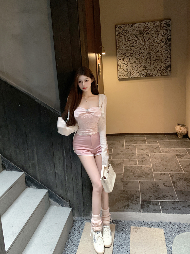 | Color | Gray cardigan, Light gray shorts, Pink shorts, Pink strapless top, White cardigan, White strapless top |
