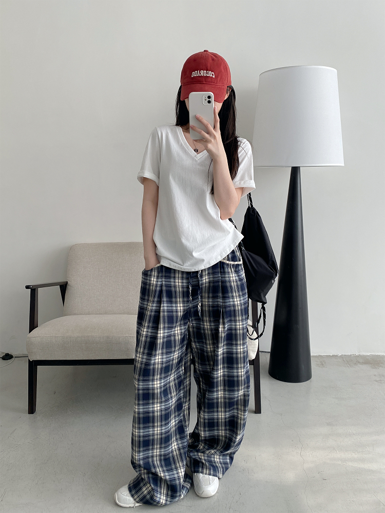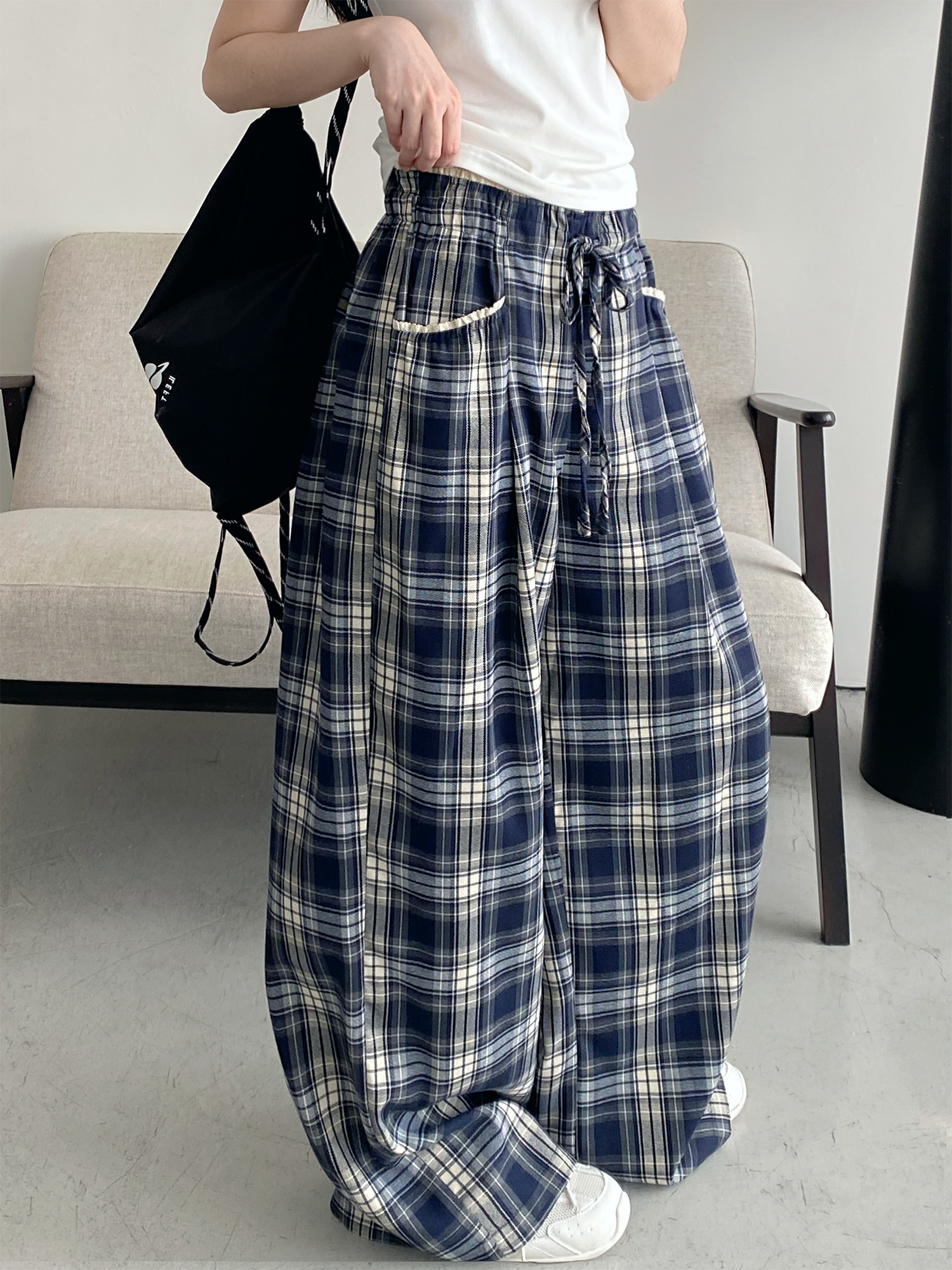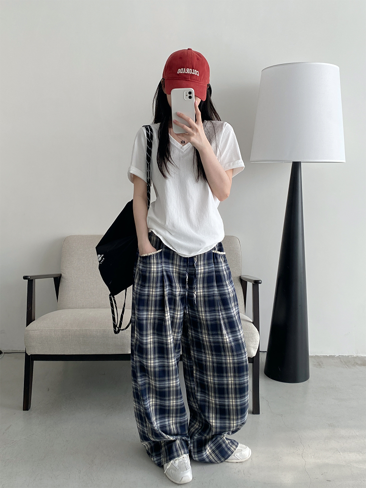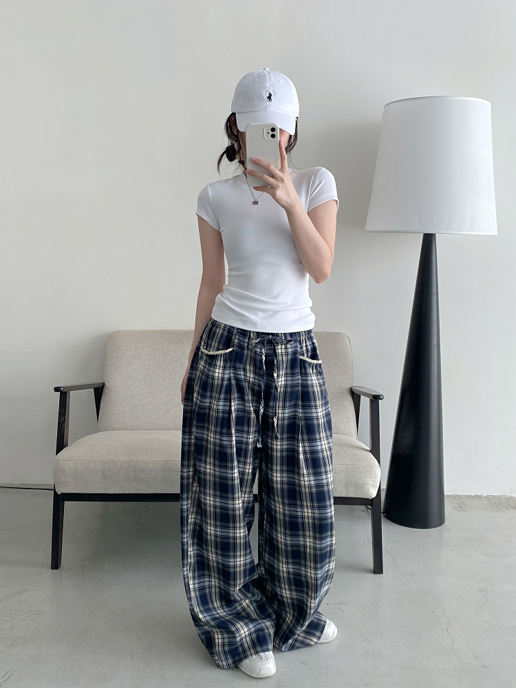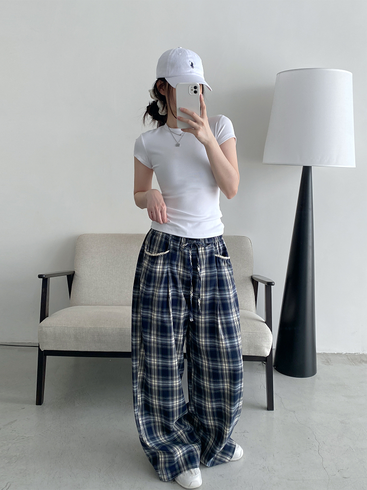 Elevate your casual wardrobe with our Slim-Fit Gray-Blue Checkered Casual Pants, designed for both comfort and style. Featuring a spliced waistband with a drawstring for a customizable fit, these versatile wide-leg trousers offer a loose straight silhouette that flatters every body type. Perfect for any occasion, whether you’re out with friends or enjoying a laid-back day at home, these pants are a must-have addition to your collection. Shop now and redefine your casual look!