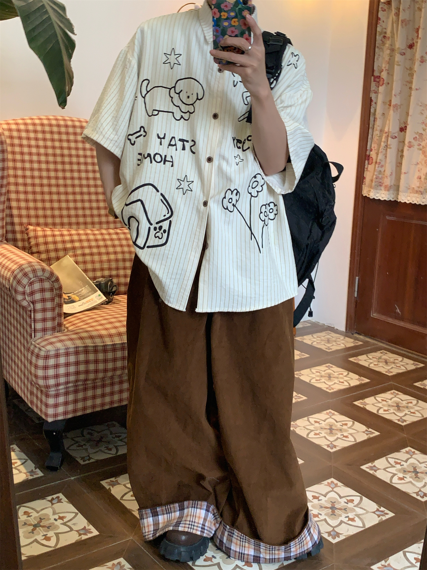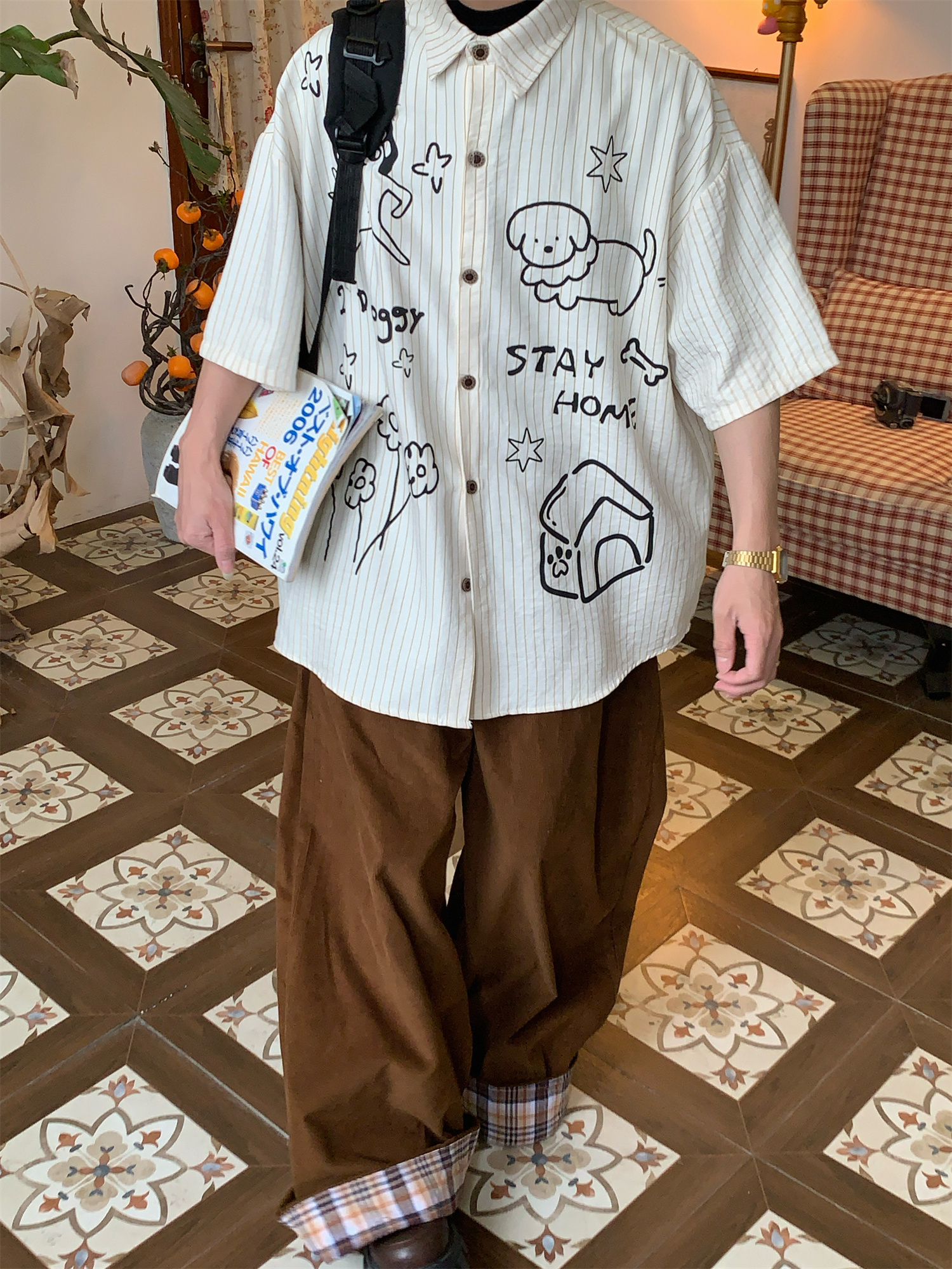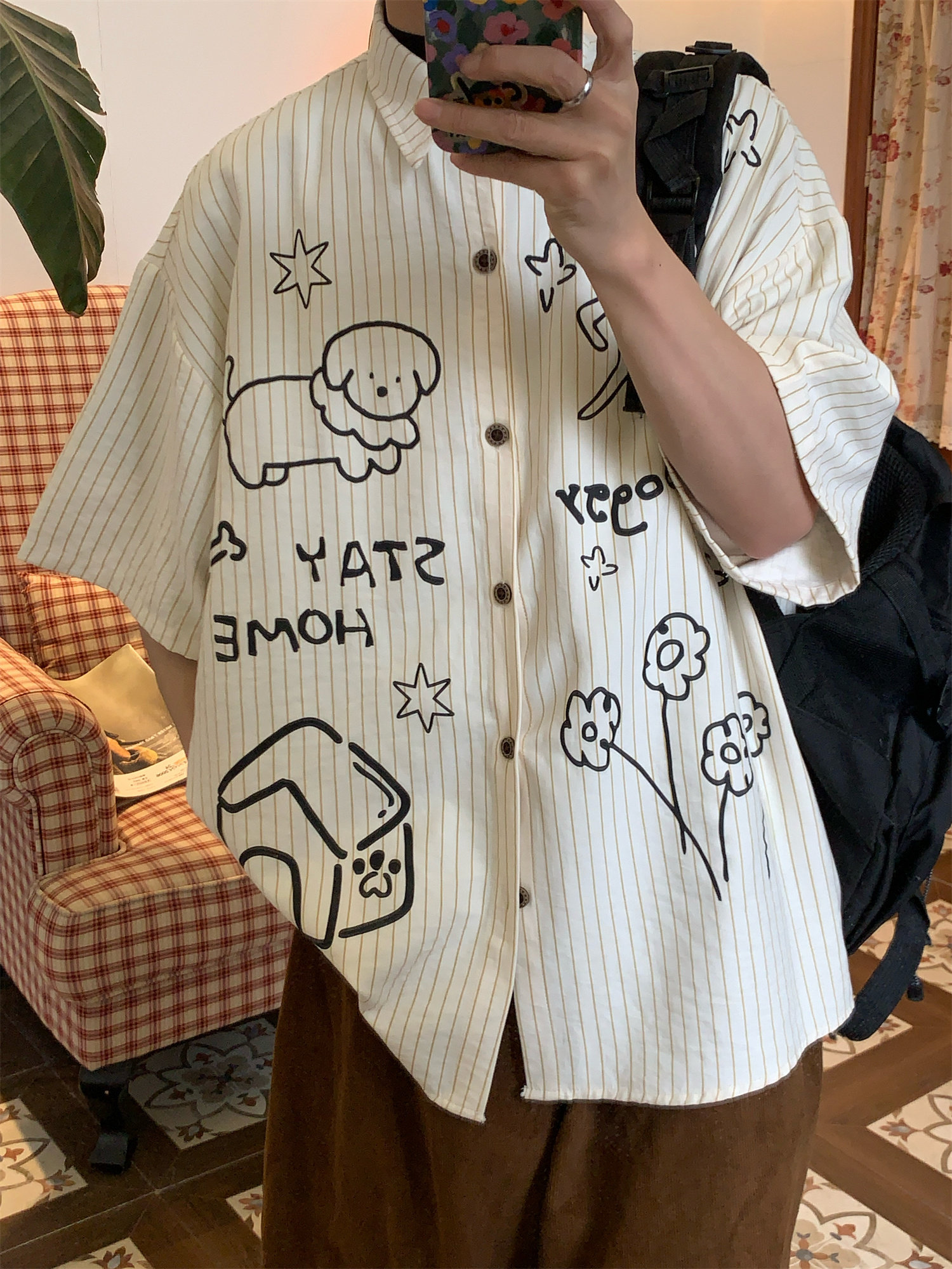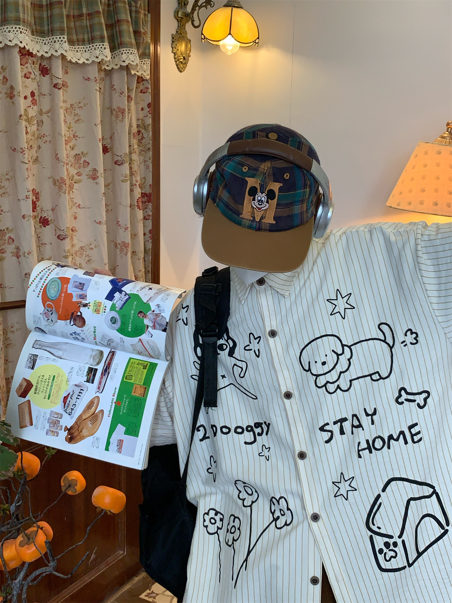 Concert Outfit Striped Short Sleeve Shirt Dog Print Couples Summer Loose Fit Top Vintage
