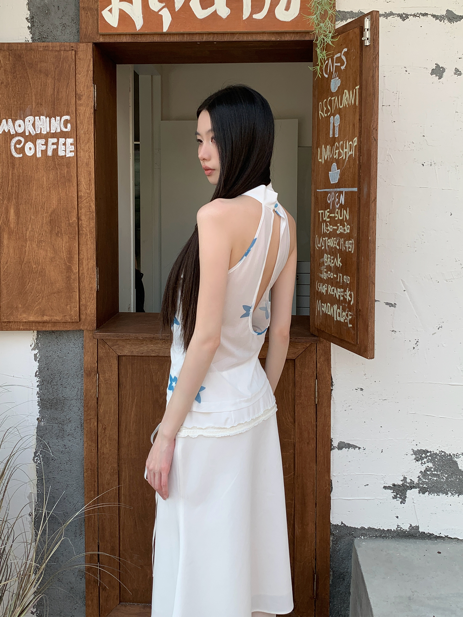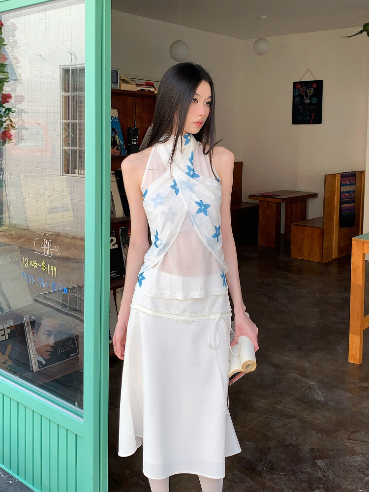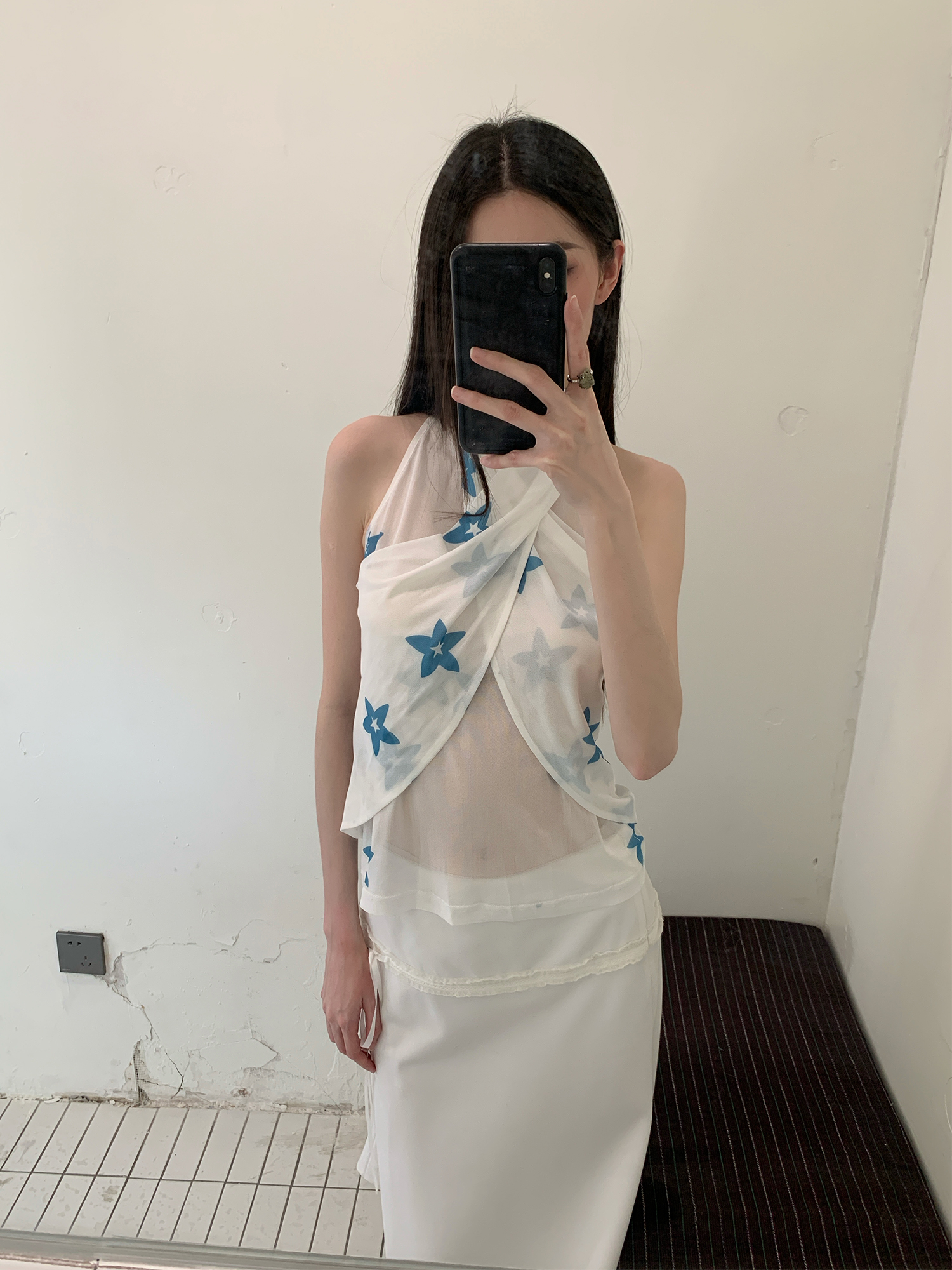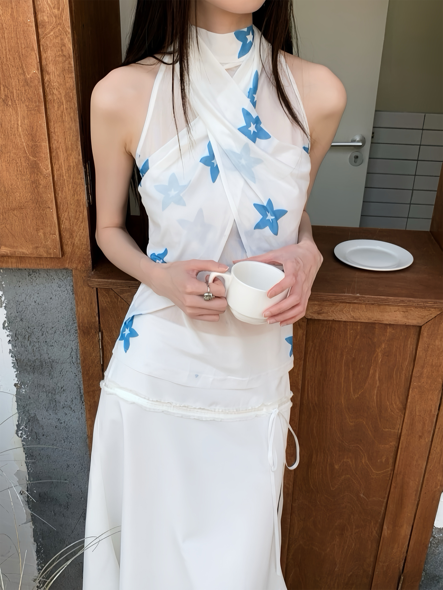 Concert Outfit Summer Blue Star Flower Halter Lightweight Sleeveless Tank Top Floral Casual Y2K
