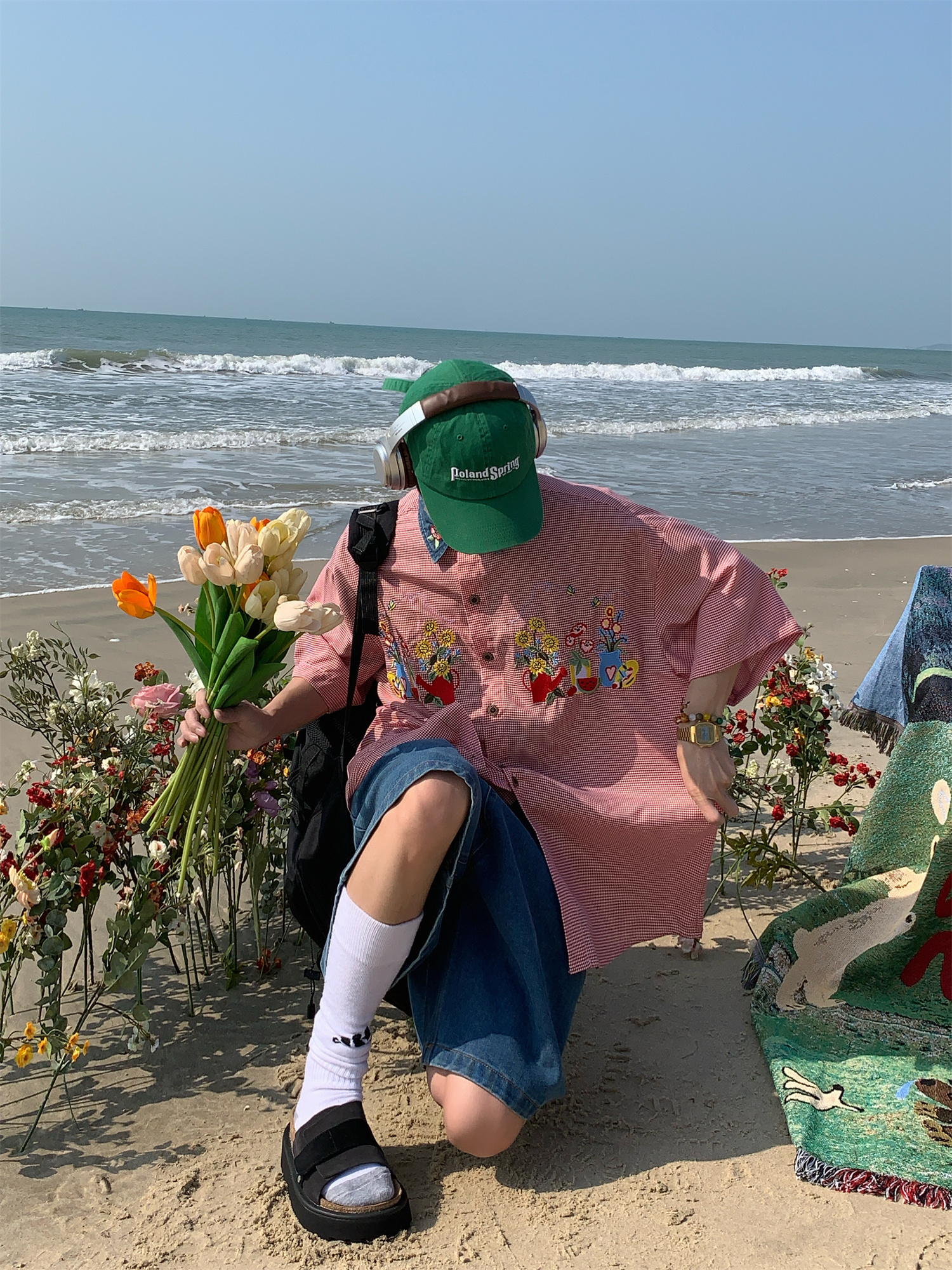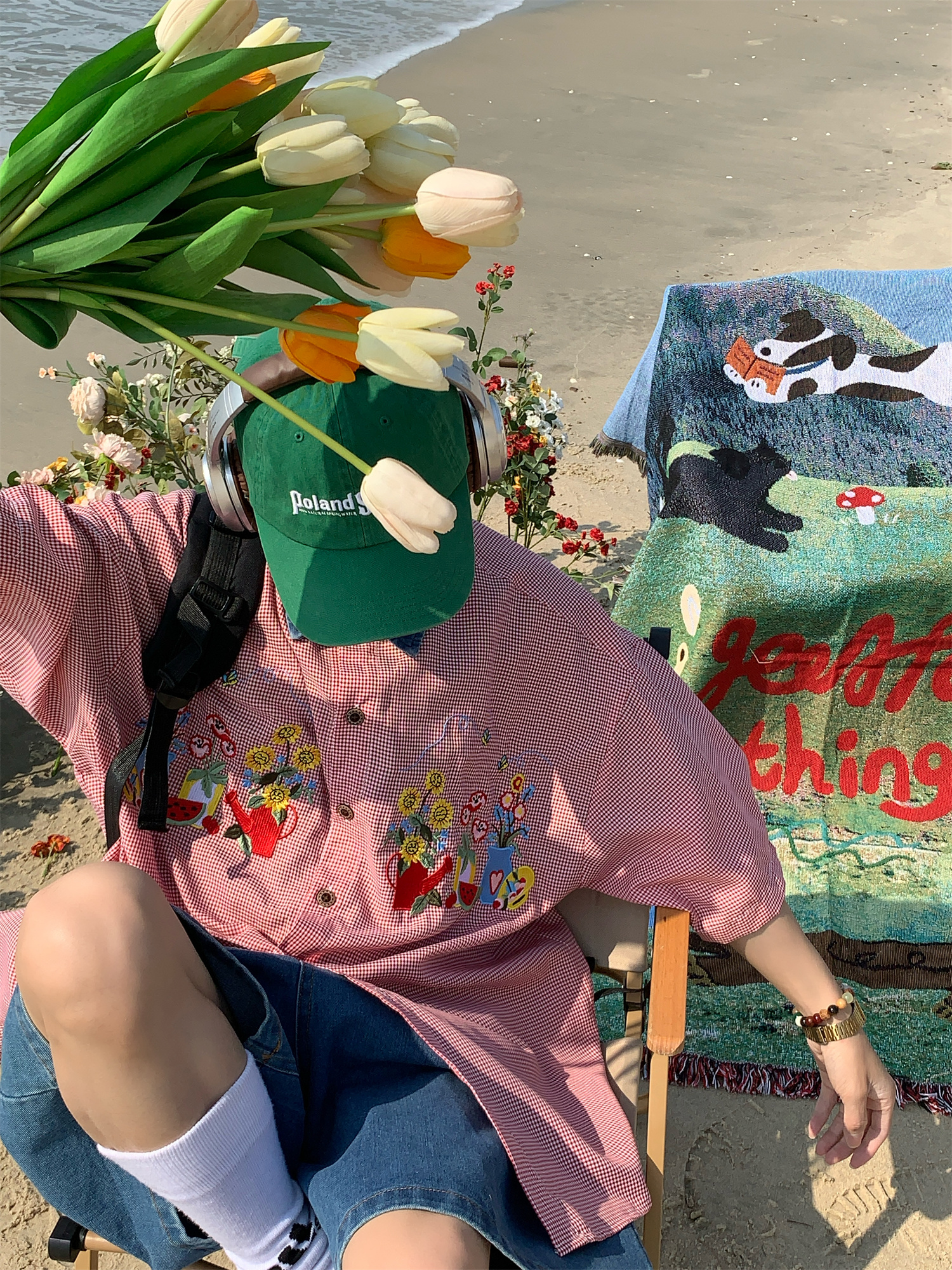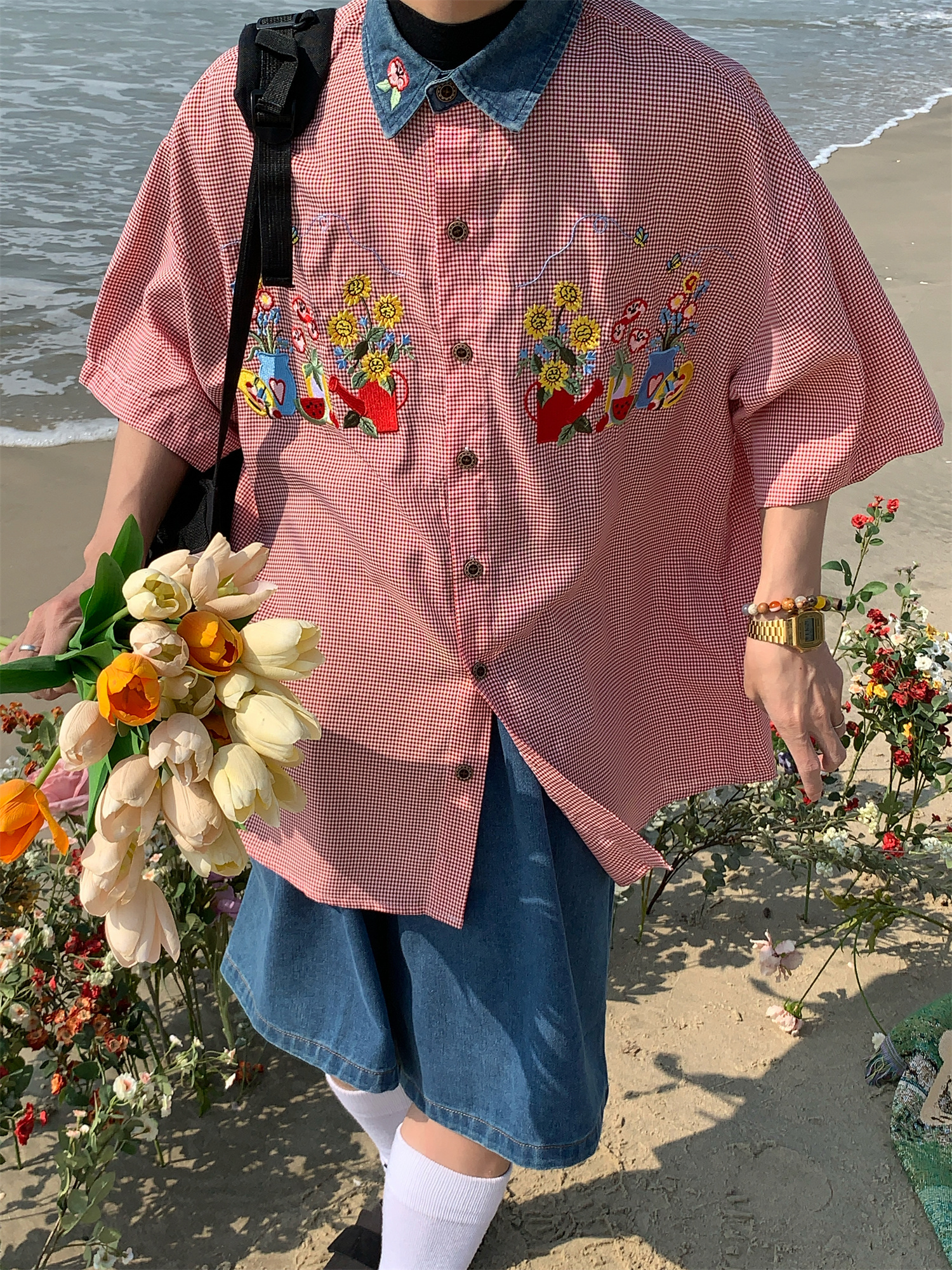 Concert Outfit Summer Retro Fun Floral Embroidery Shirt Denim Collar Short Sleeve Plaid Top Couples, Y2K