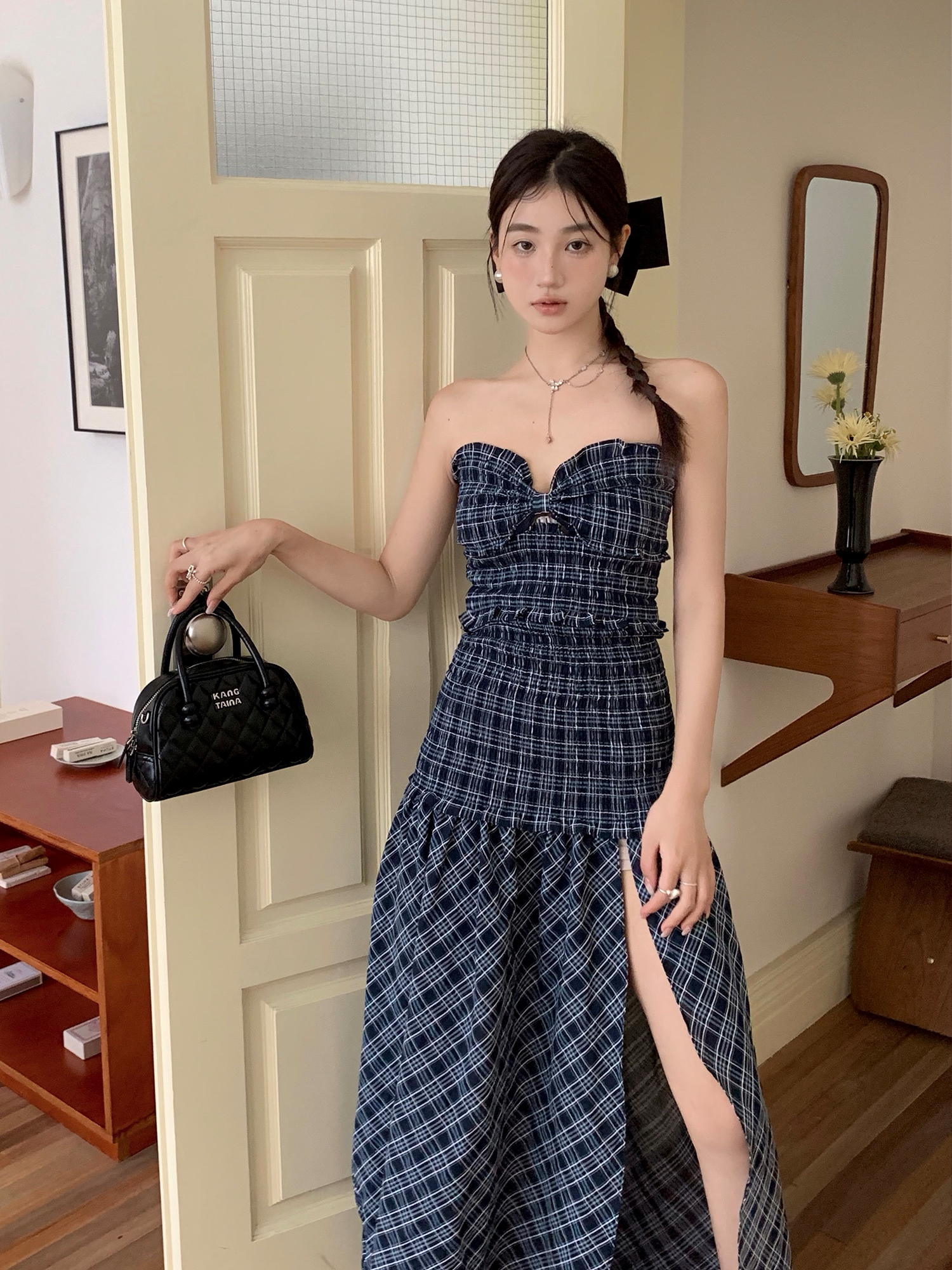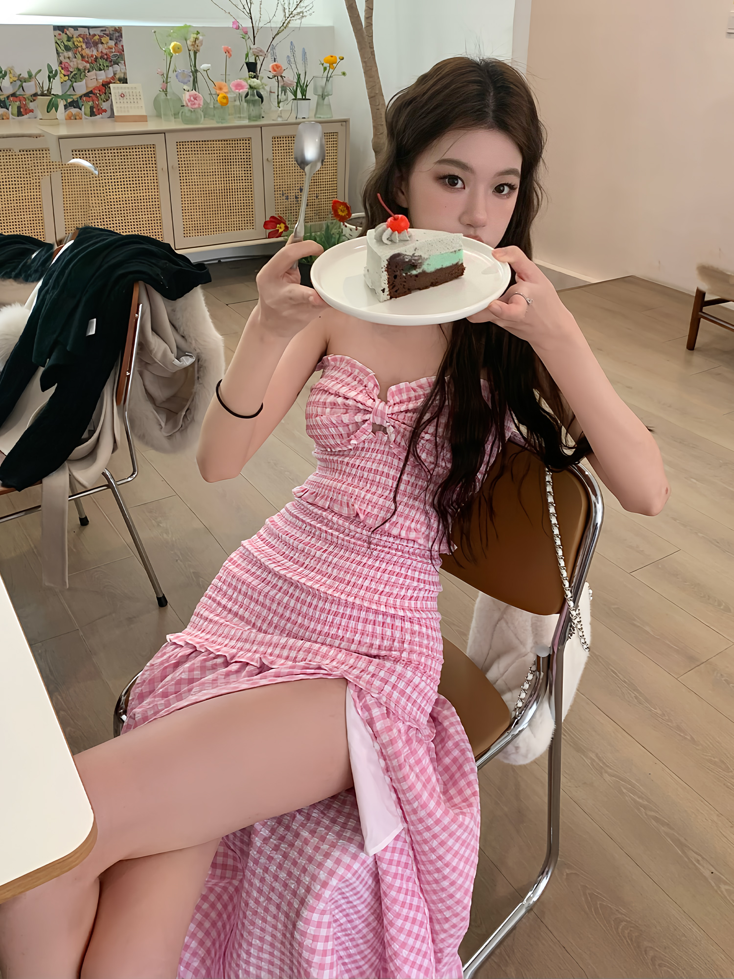 Concert Outfit Sweet Pink Checkered Strapless Fitted DressGirl, pired