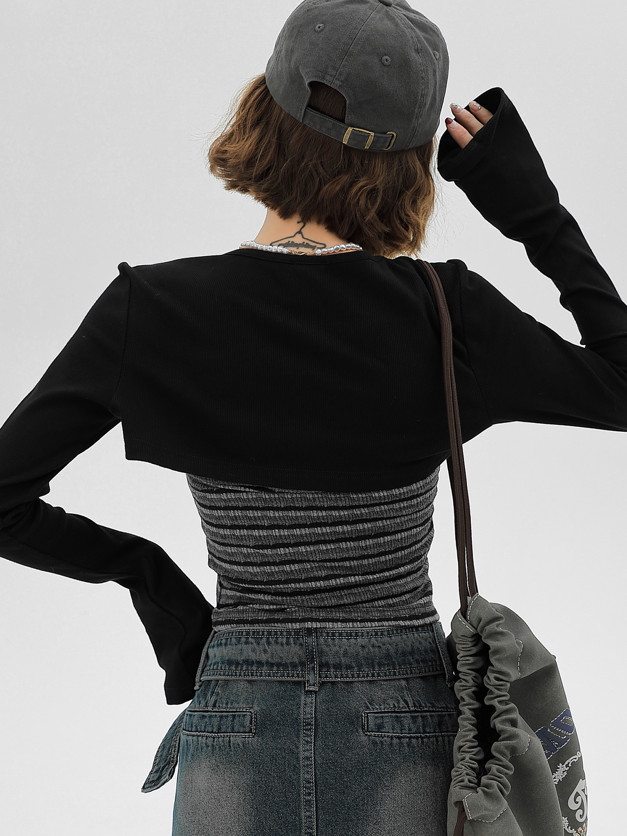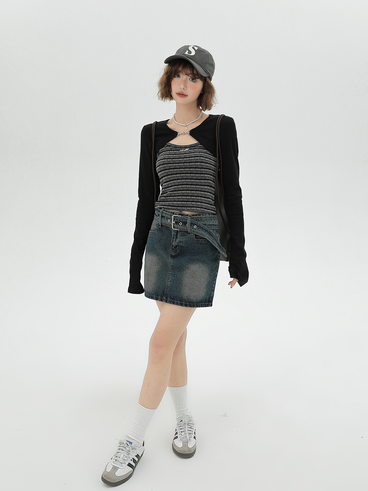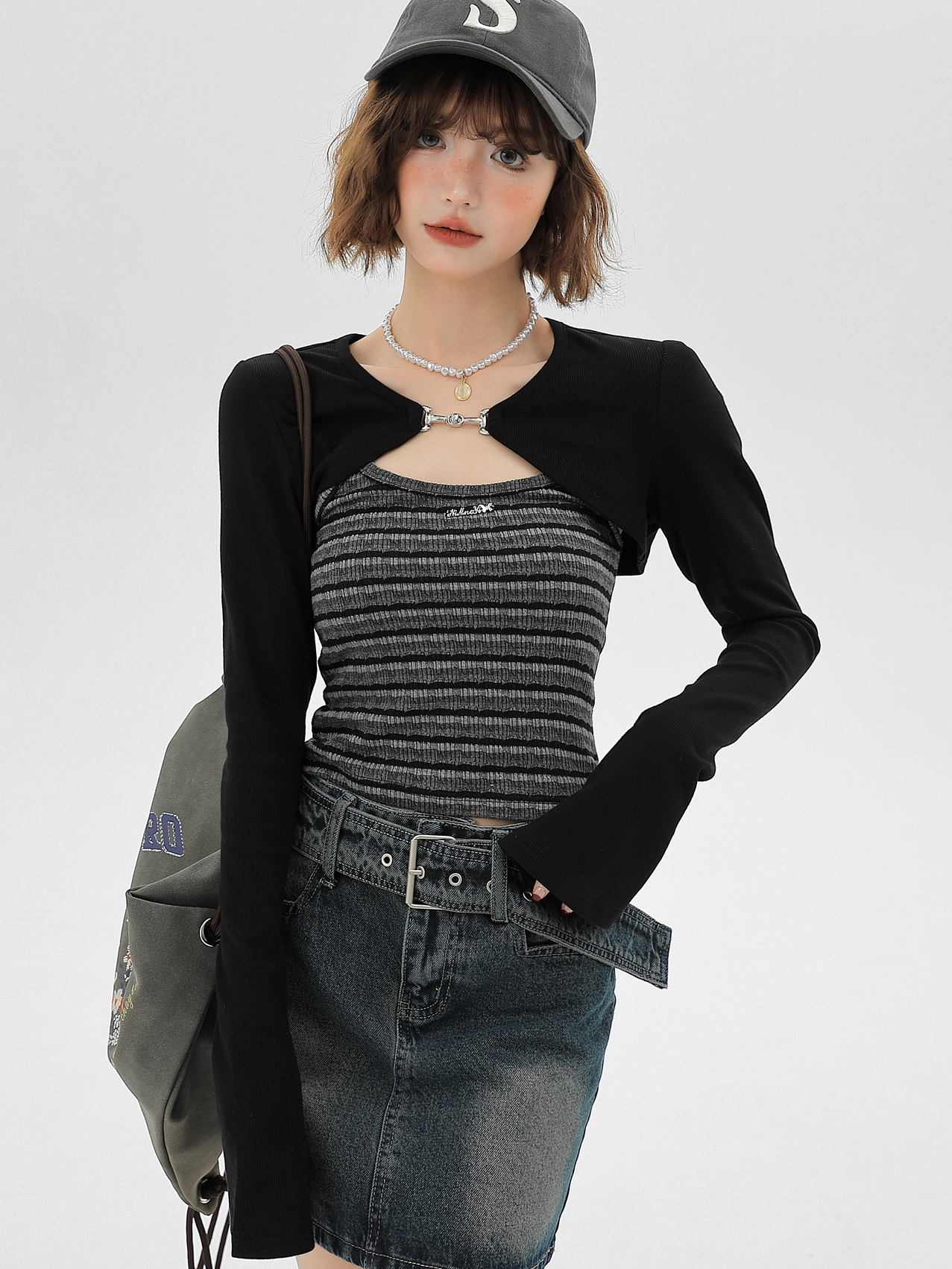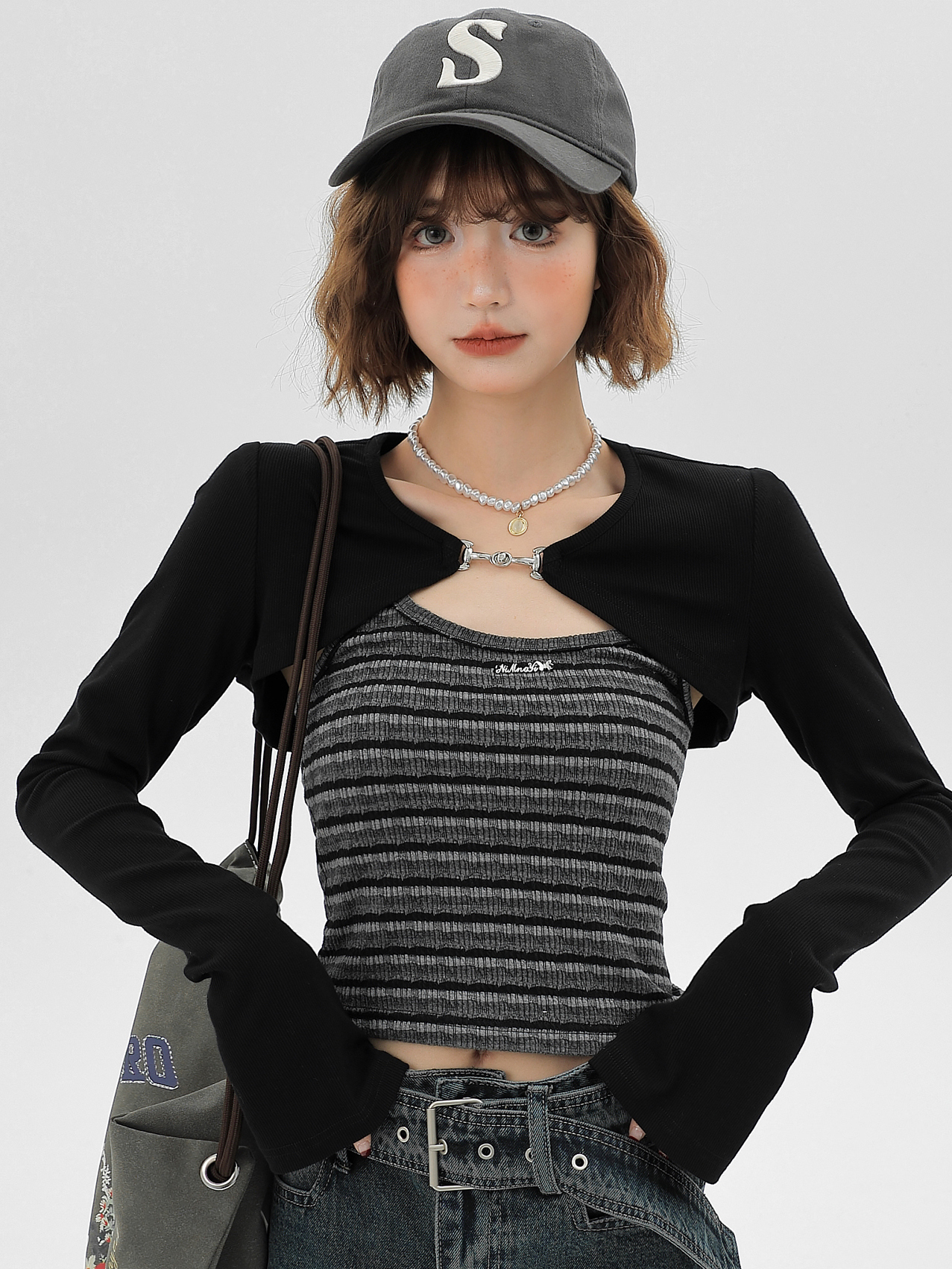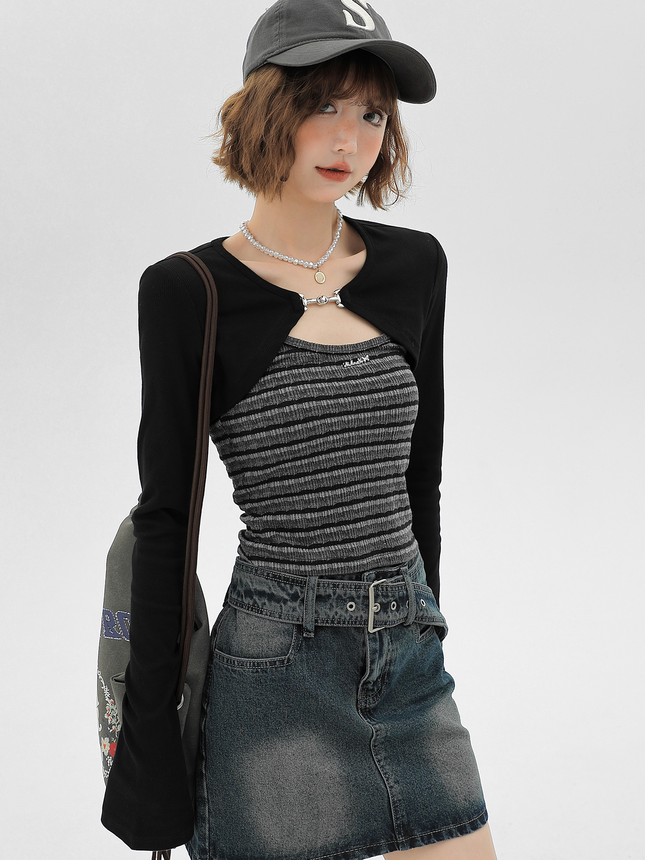 | Main color | Black cardigan + striped camisole |