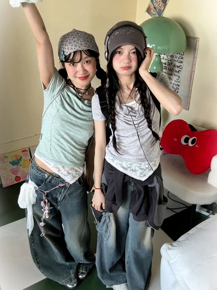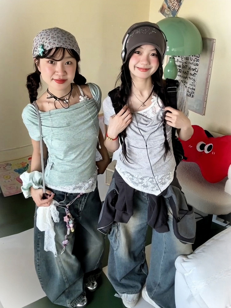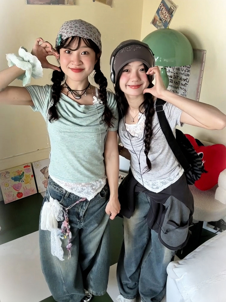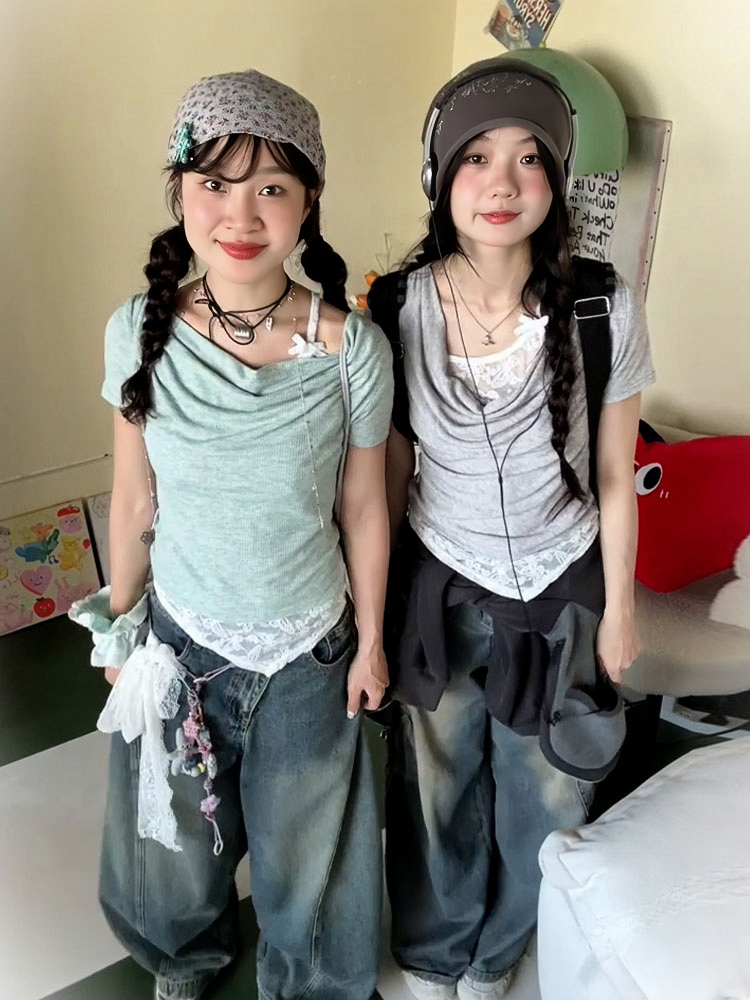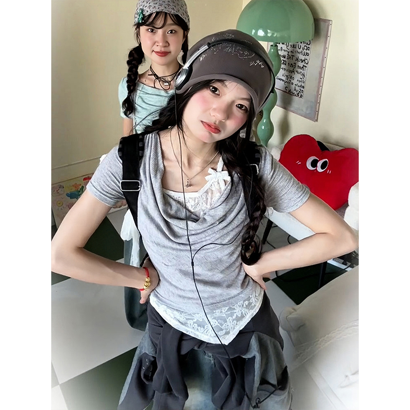 Concert Outfit Vintage Swing Collar T- shirt Women, Summer Lace Splicing, Slim Fit, Short Sleeve, Cropped Top, Y2K