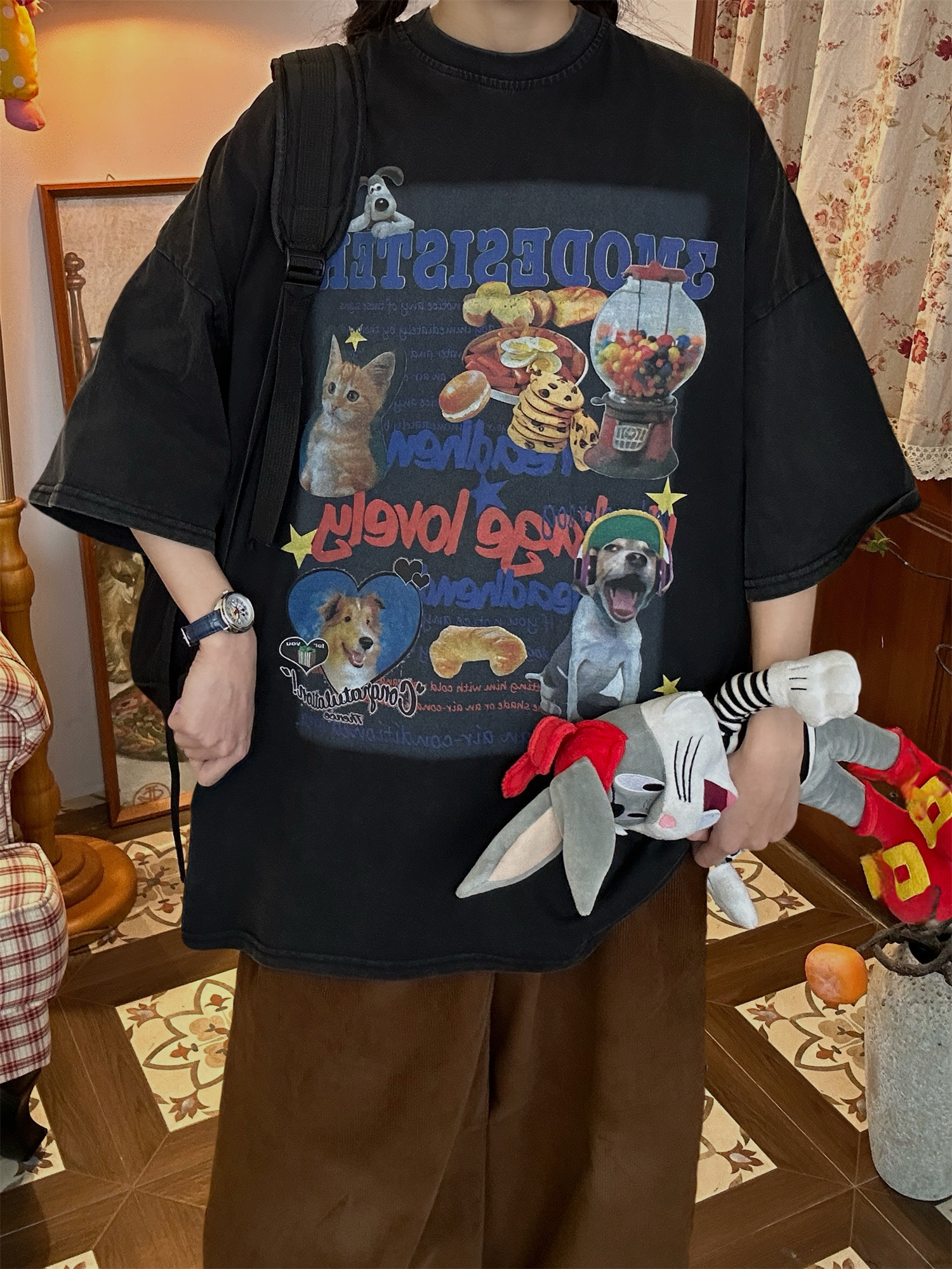 Elevate your casual style with our Vintage Cartoon Cat and Dog Print Short Sleeve T-Shirt, designed for a relaxed and trendy look. This washed, distressed top offers a loose fit that flatters every body type, making it a perfect addition to your Y2K inspired wardrobe. Embrace playful fashion while enjoying all-day comfort—add this must-have tee to your cart today!