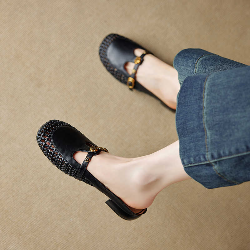 Concert Outfit Vintage Women Genuine Leather Woven Camellia Mules Mid Heel Closed Toe Slippers