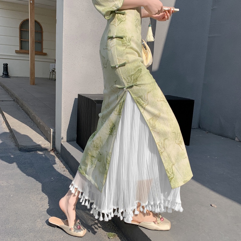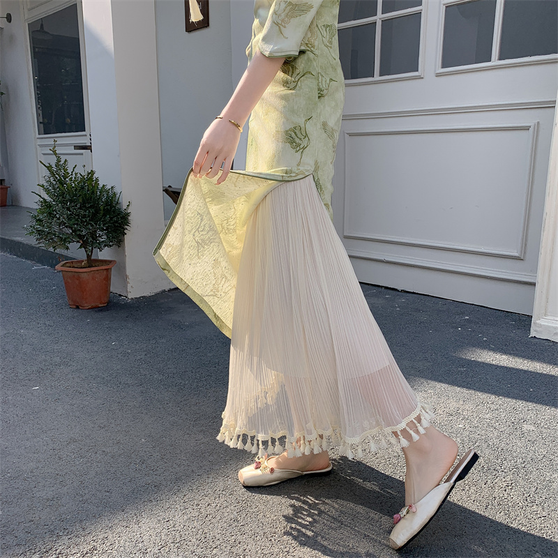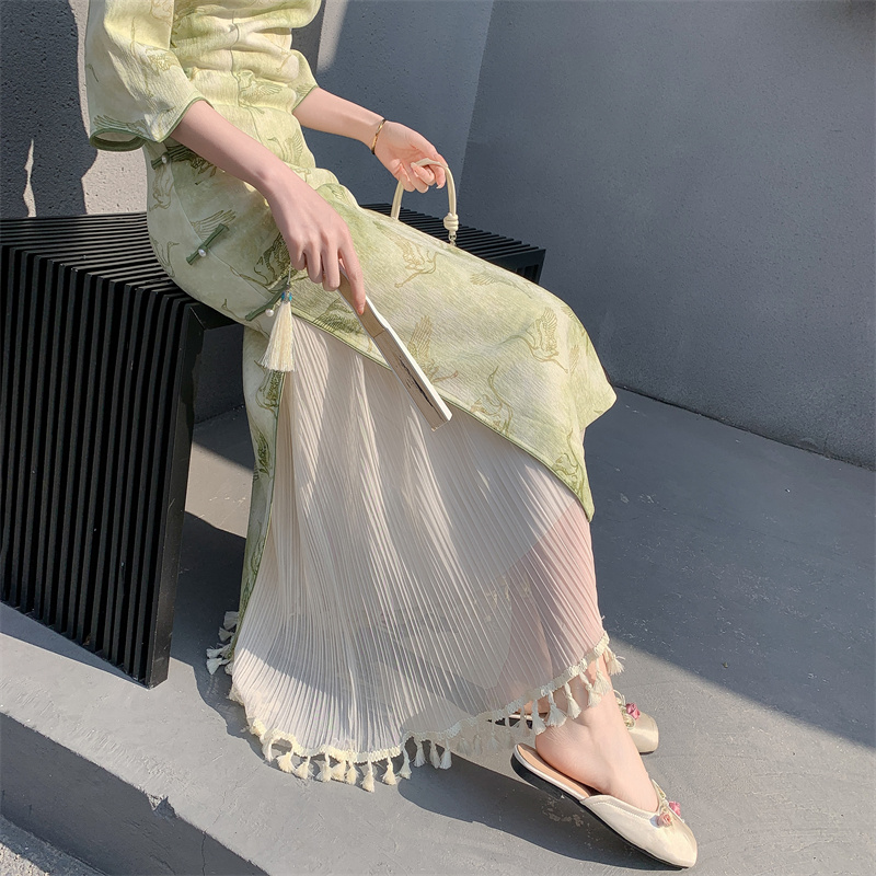 Elevate your wardrobe with our Vintage Hanfu Qipao Inner Slip Dress, featuring a stunning mesh pleated tassel skirt that sways gracefully with every step. Designed with an elastic waist for a comfortable fit, this elegant piece offers a hip-covering long layer that flatters all body types while exuding sophisticated Korean style. Perfect for special occasions or a chic everyday look, this dress combines tradition with modern flair. Don’t miss out on this timeless addition to your collection—add to your cart today!
