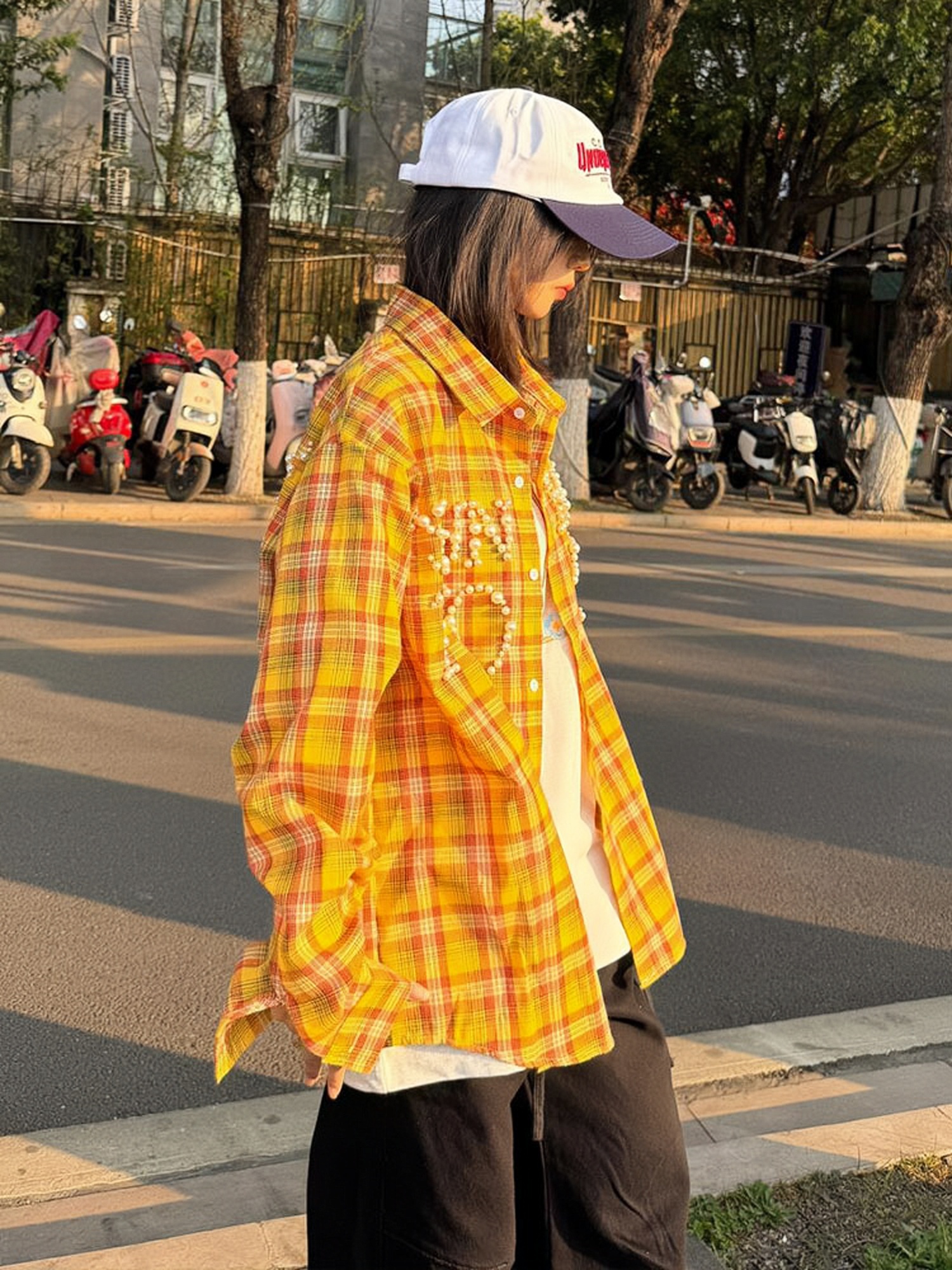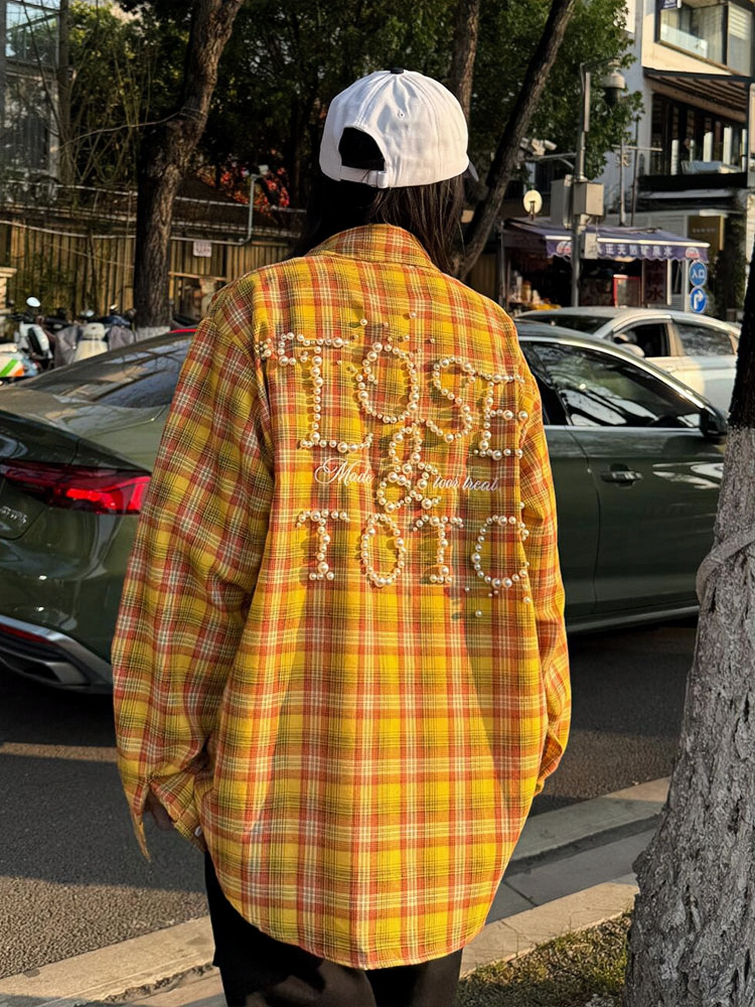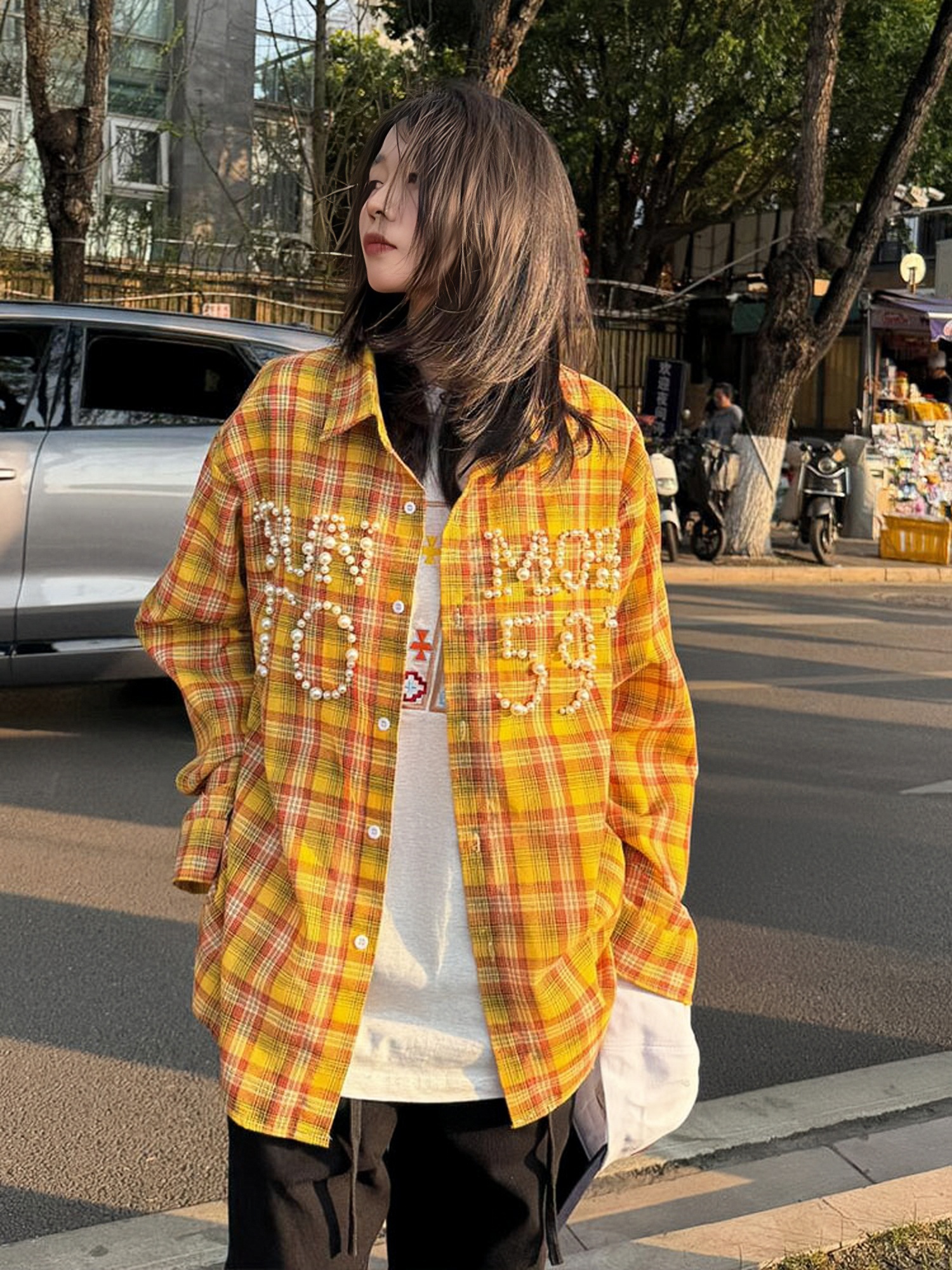 Concert Outfit Vintage Plaid Long Sleeve Shirt Jacket Women, Pearl Letter Casual TopDopamine Yellow, Spring