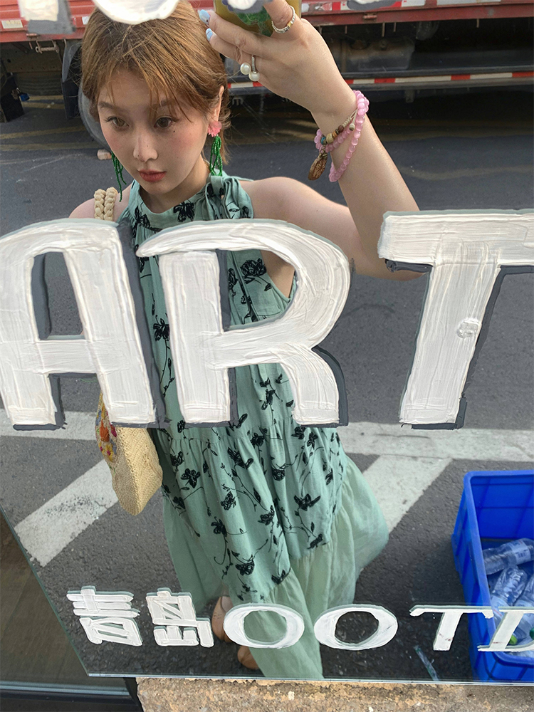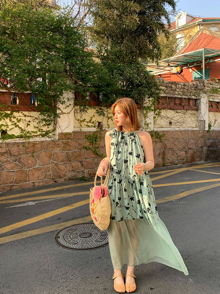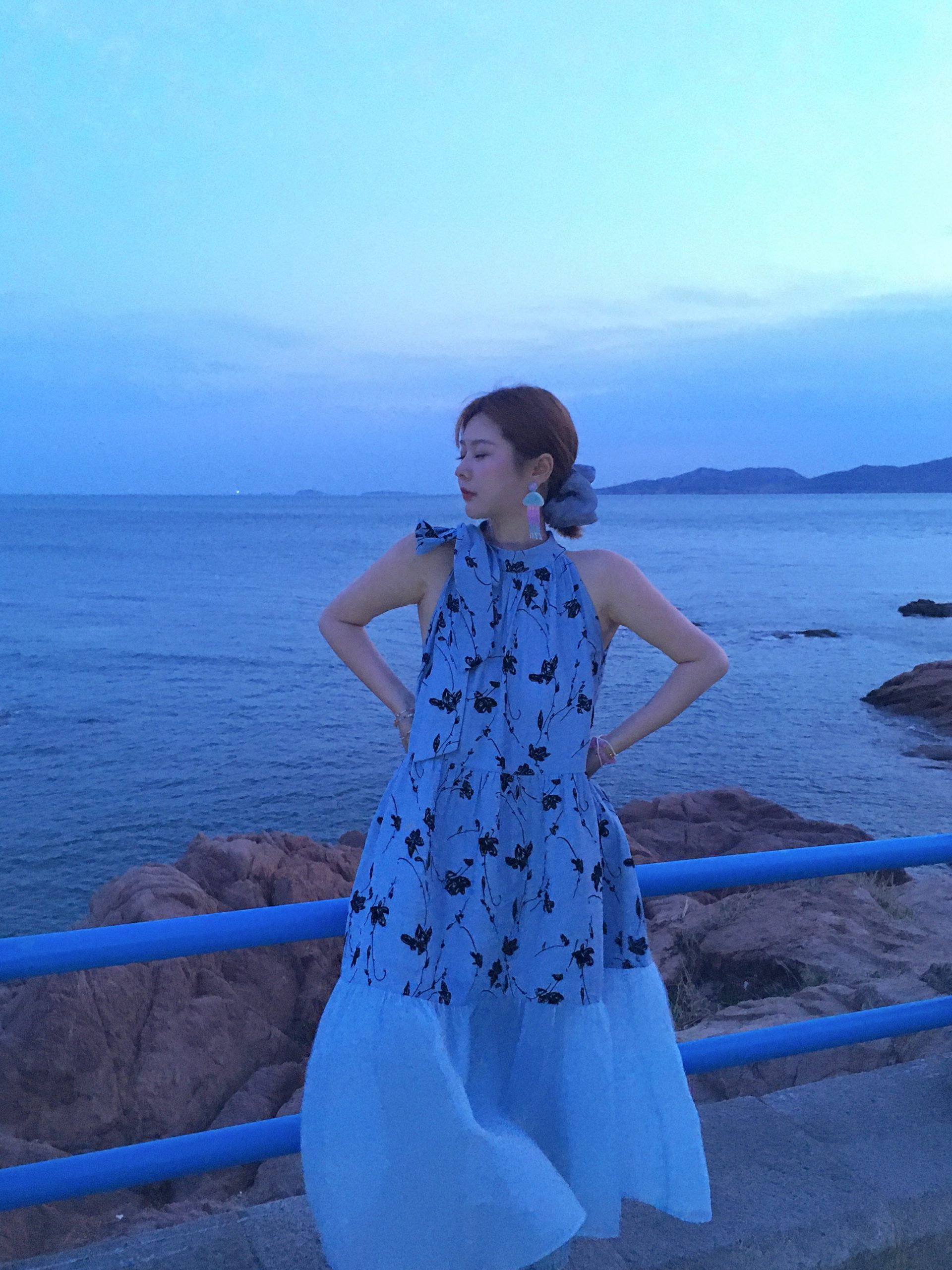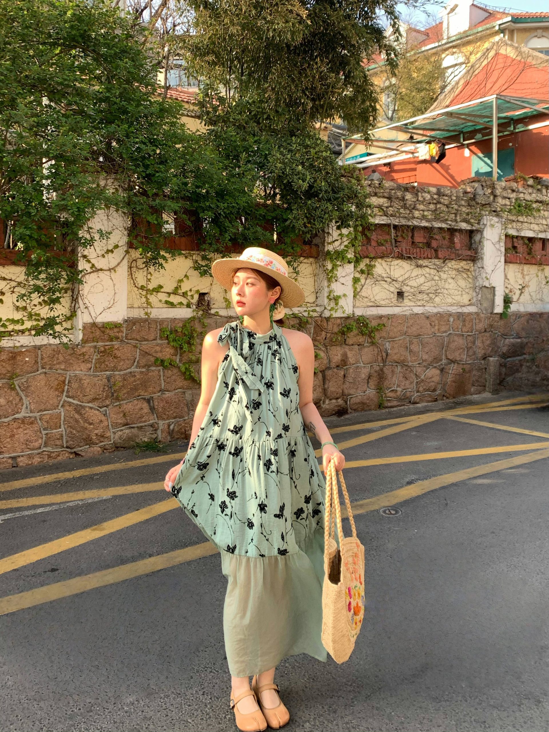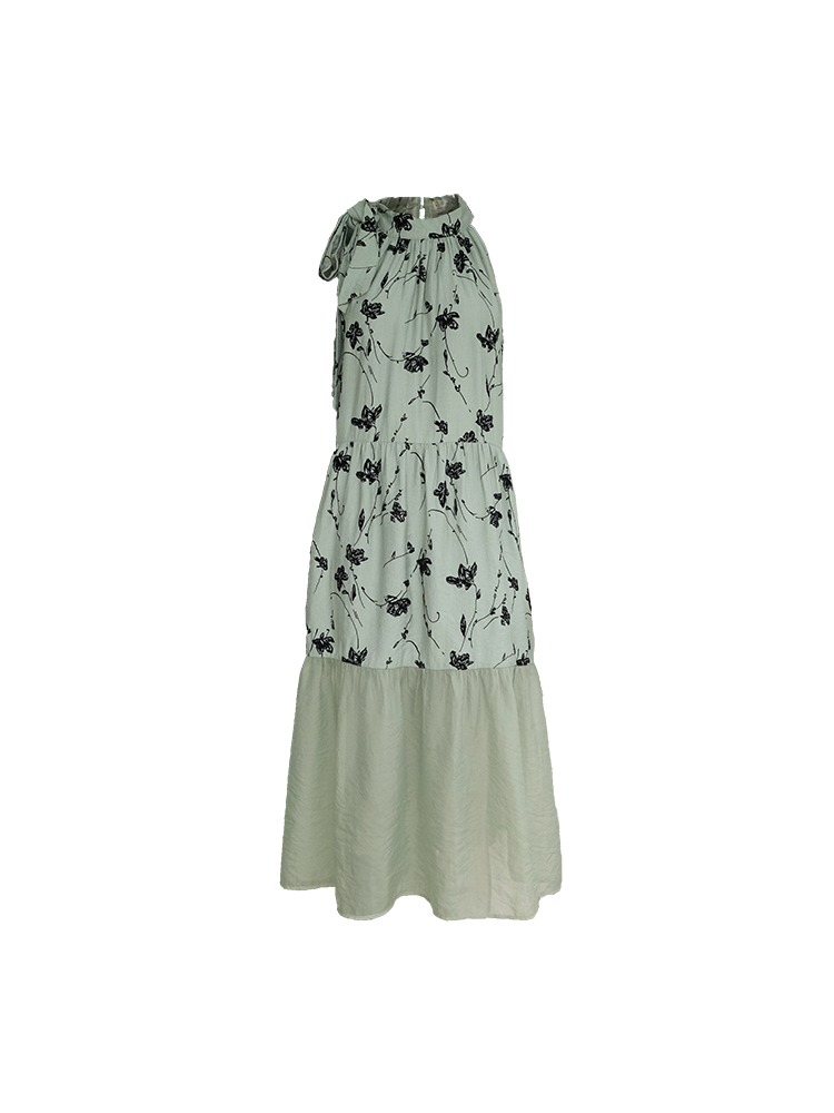Concert Outfit Vintage Rose Sea Wave Print Sheer Halter Dress Women Summer Loose Retro Maxi Dress Boho