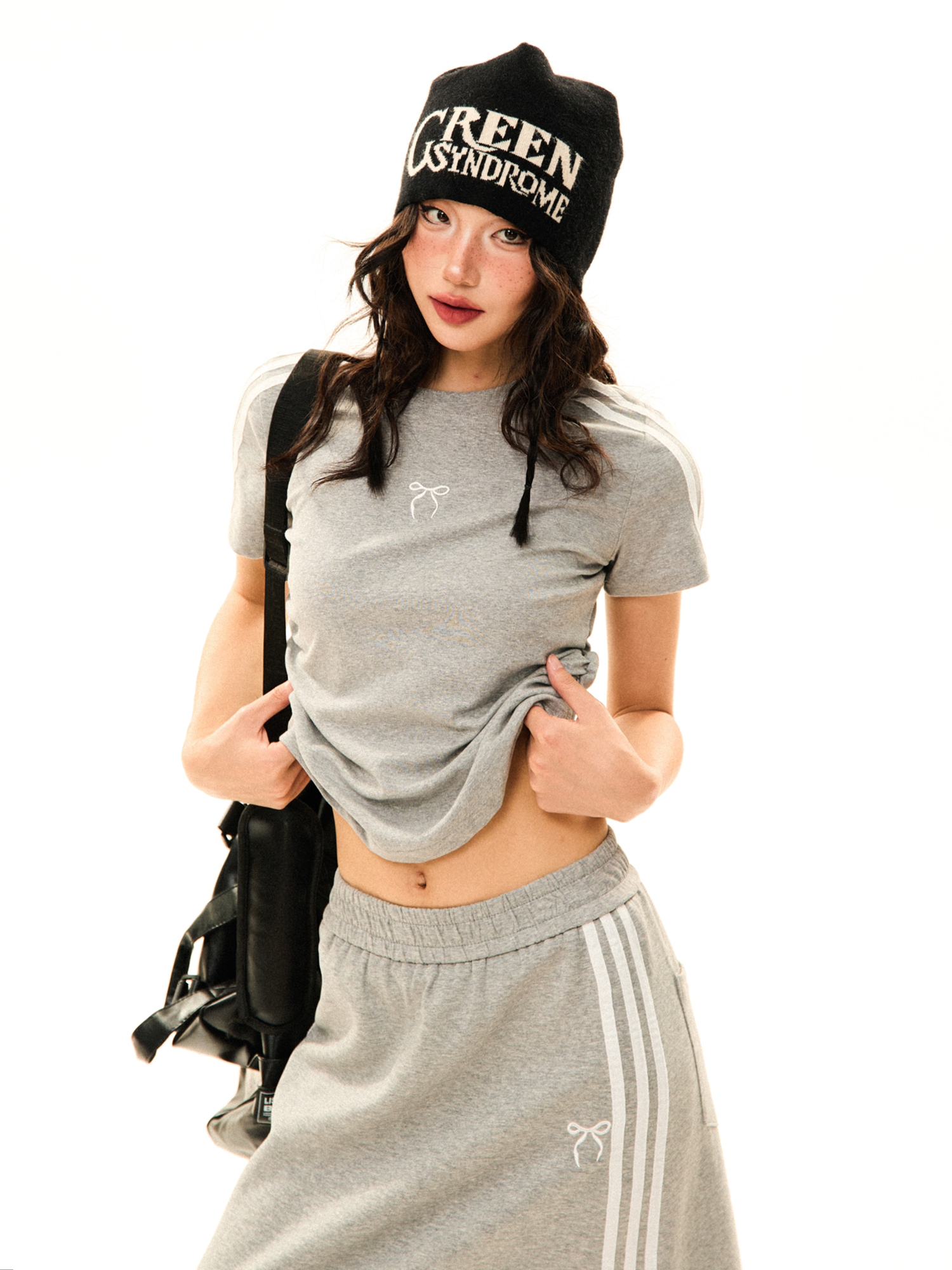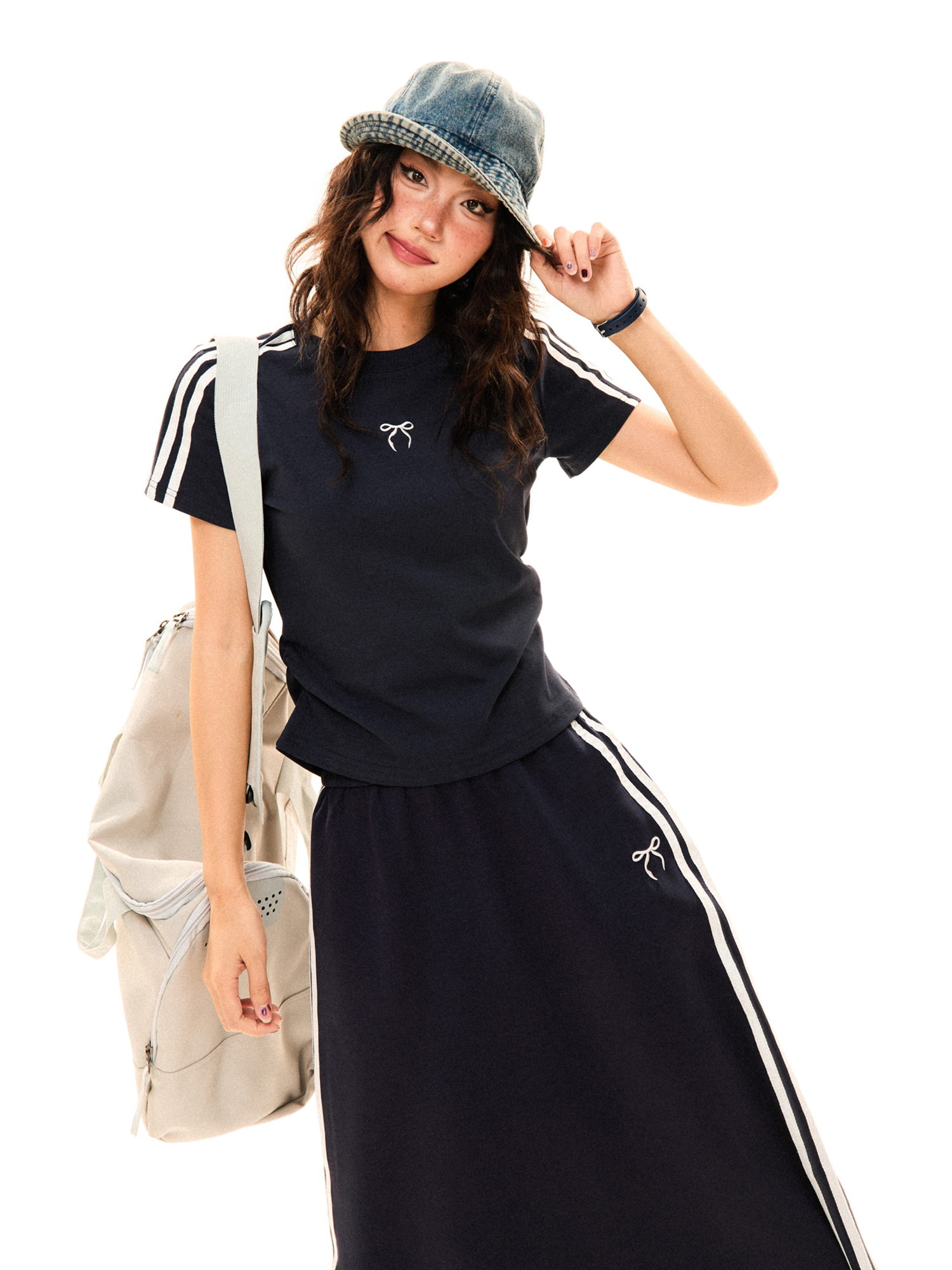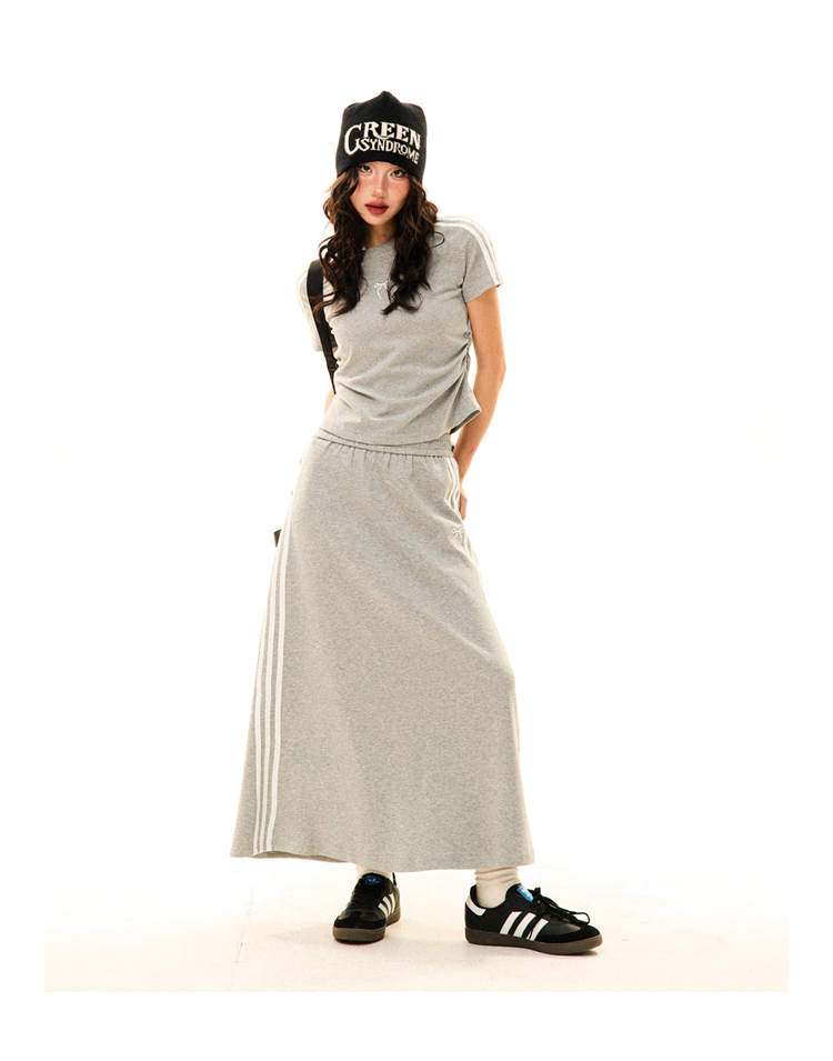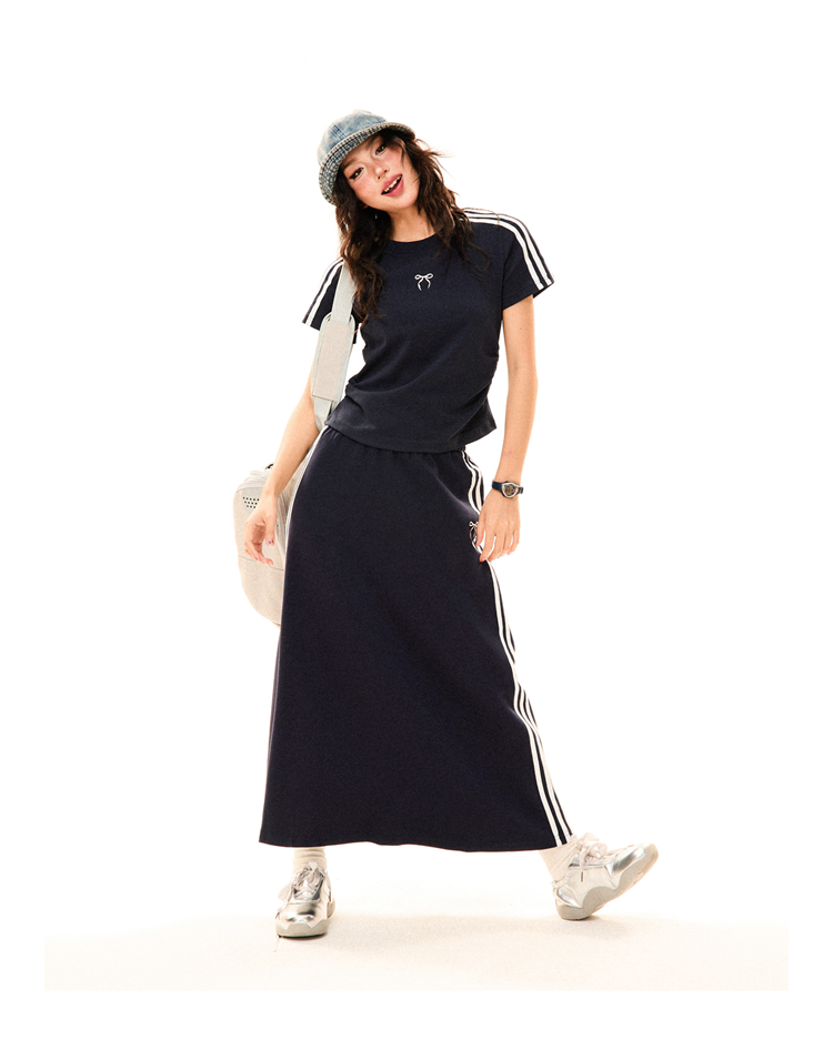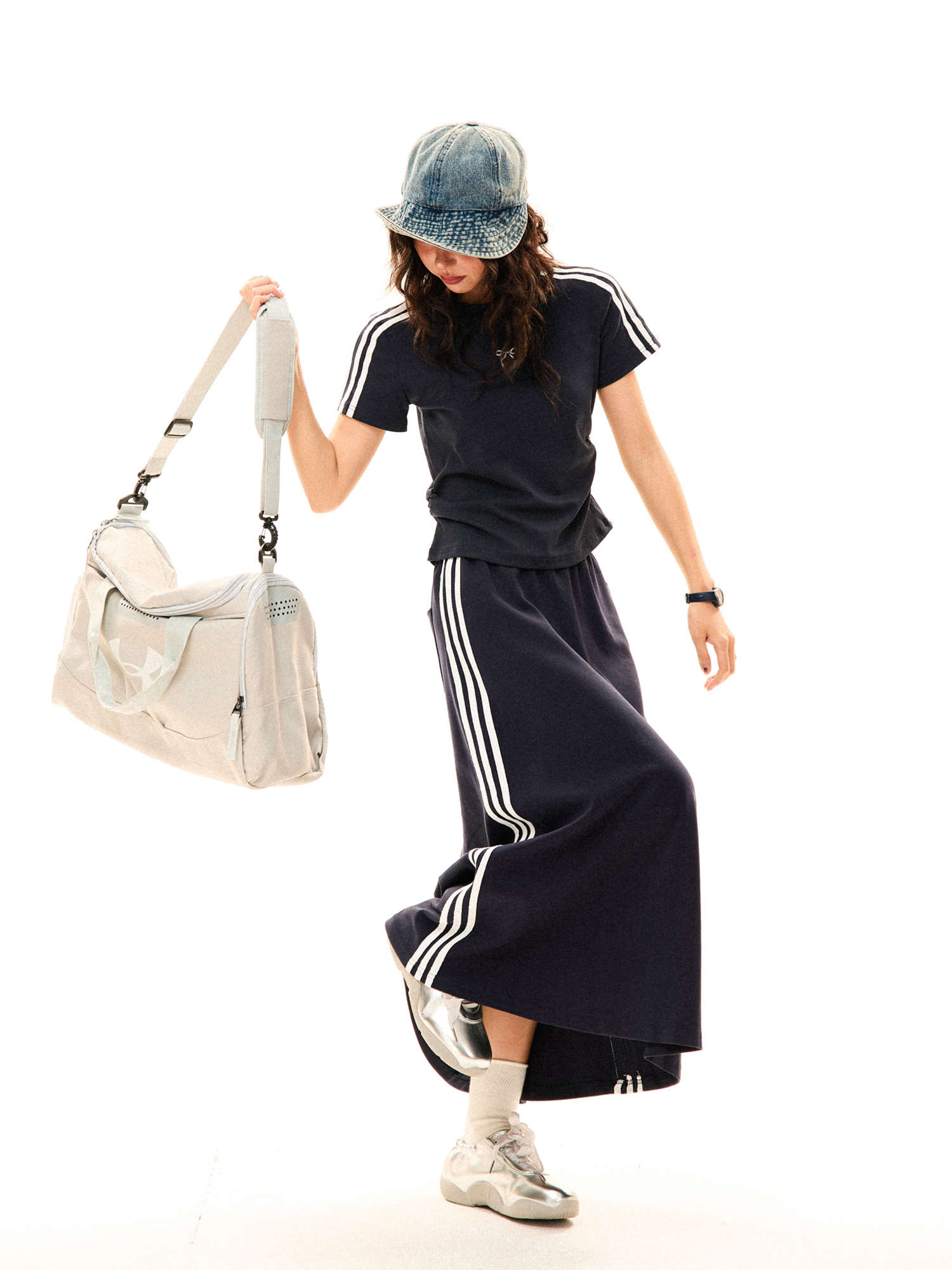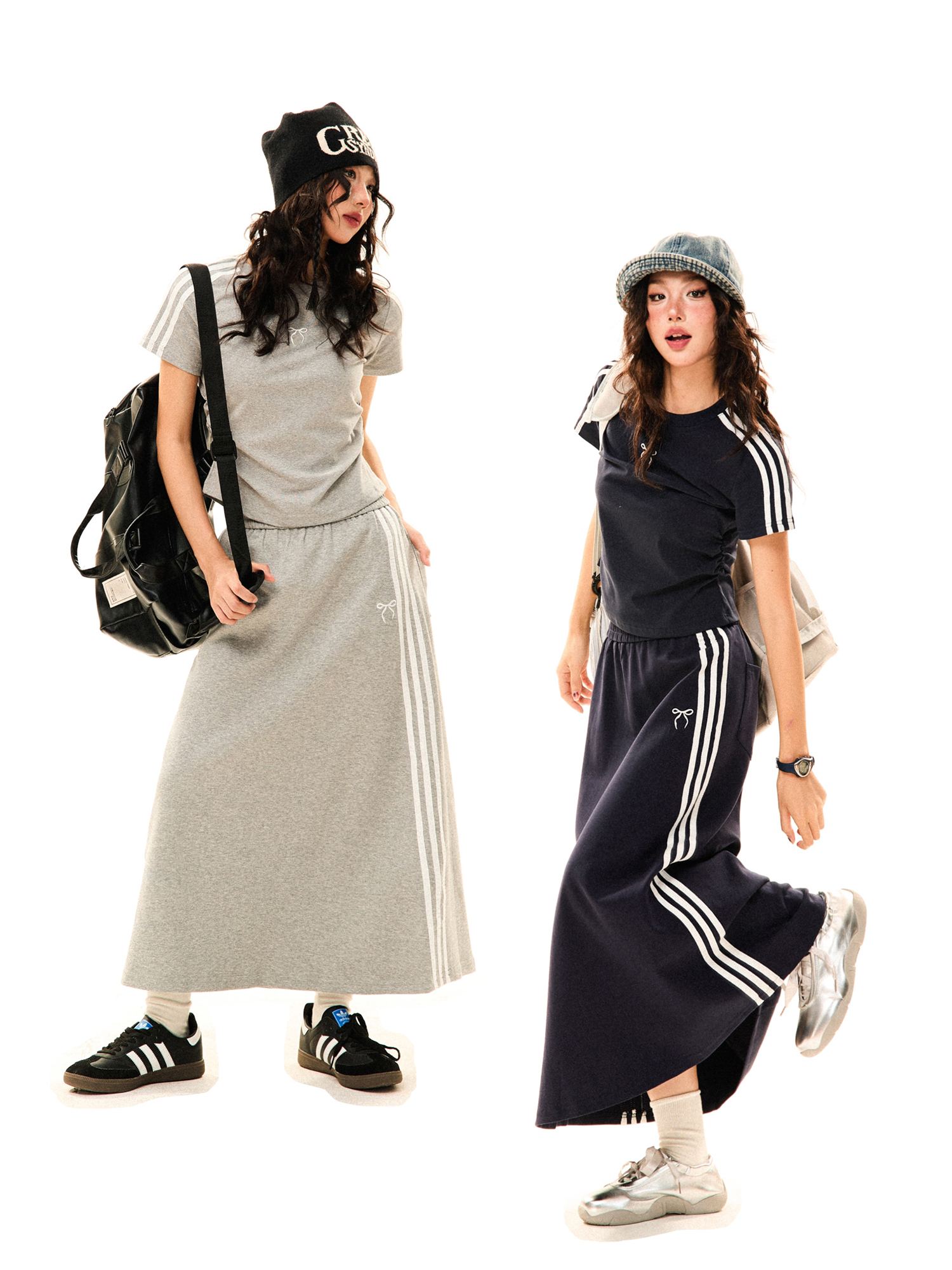 Elevate your summer wardrobe with our Women’s Retro Sports Set, featuring a stylish short sleeve T-shirt adorned with classic three stripes and a chic high waist draped mid-length skirt. This comfortable and trendy ensemble is perfect for casual outings or weekend adventures, offering a flattering fit that accentuates your silhouette while ensuring all-day ease. Don’t miss out on this must-have addition to your fashion collection—add to your cart now and embrace effortless style!