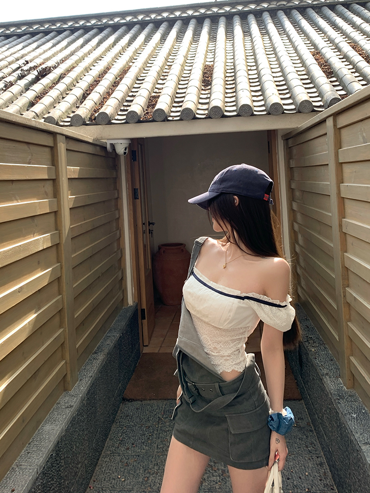 Concert Outfit Women Summer Lace Splicing One Shoulder Slim Top Short Sleeve T- shirtWhite Tea, Sweet Desire