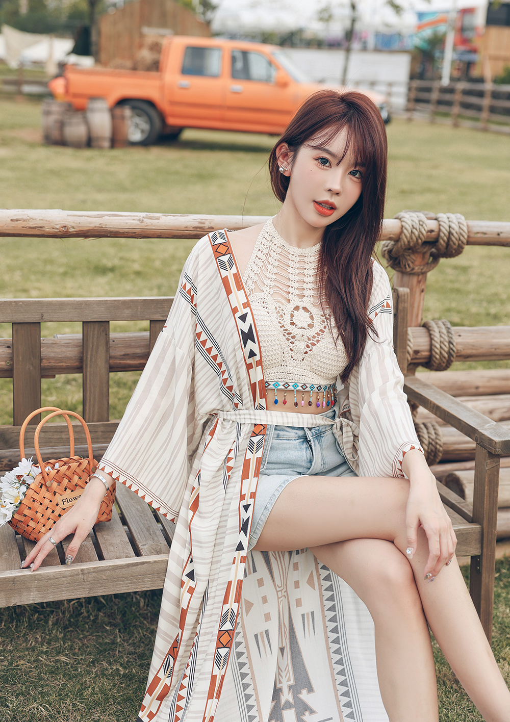 | Color | Apricot-colored vest, Geometric cardigan |