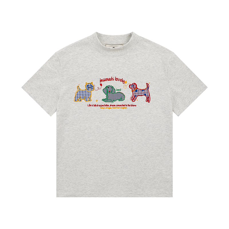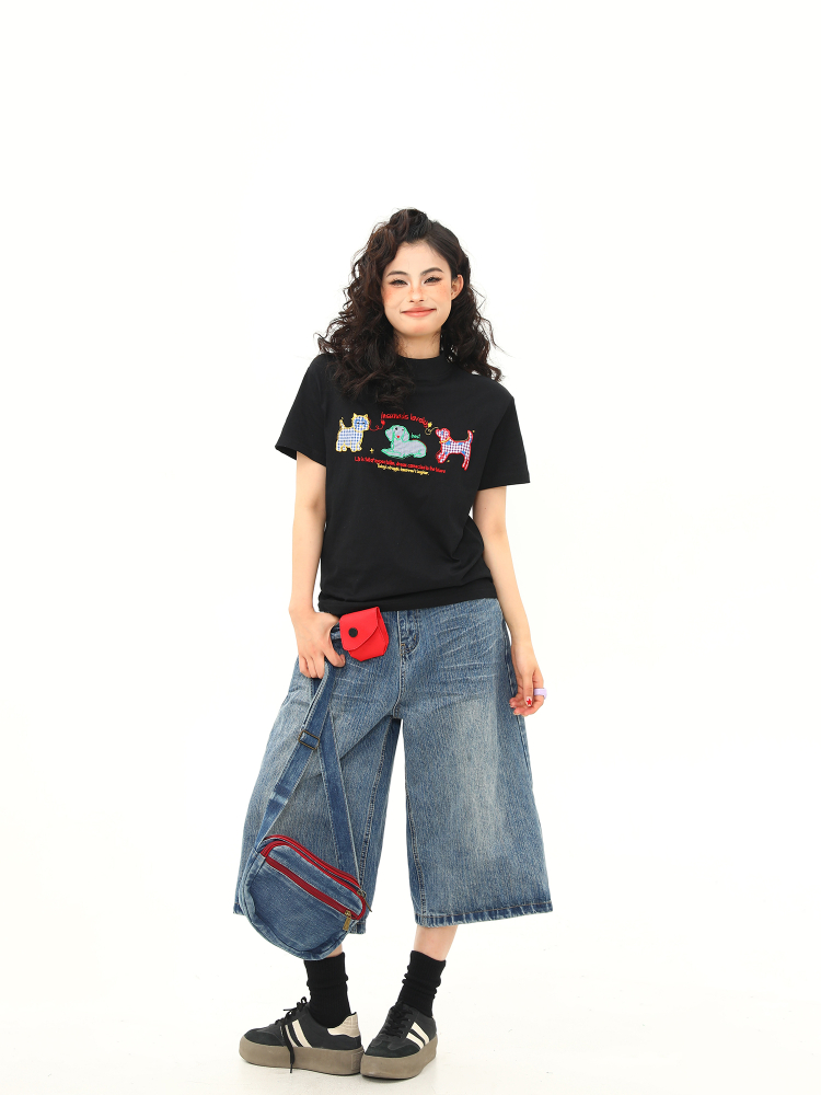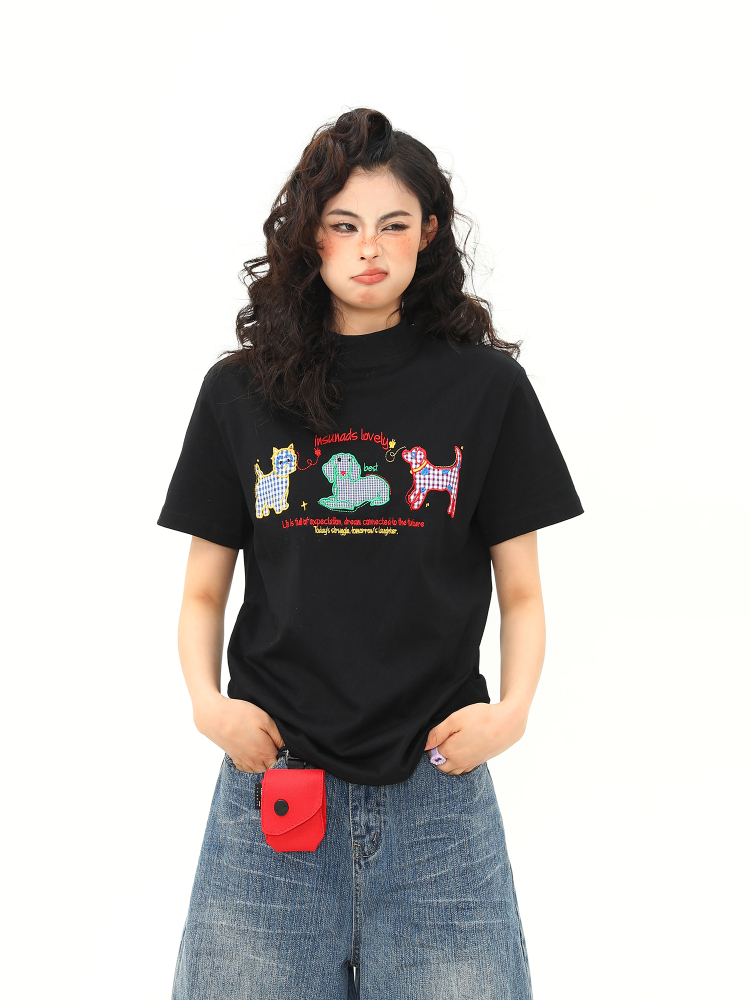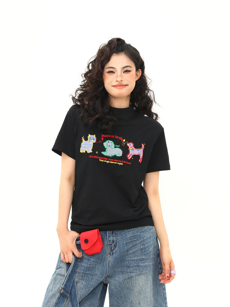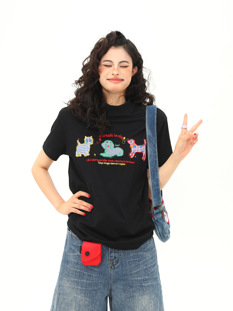 Concert Outfit Women Vintage Cartoon Dog Embroidery Shoulder T- shirt, Slightly Loose Fit, Short Sleeve, Y2K