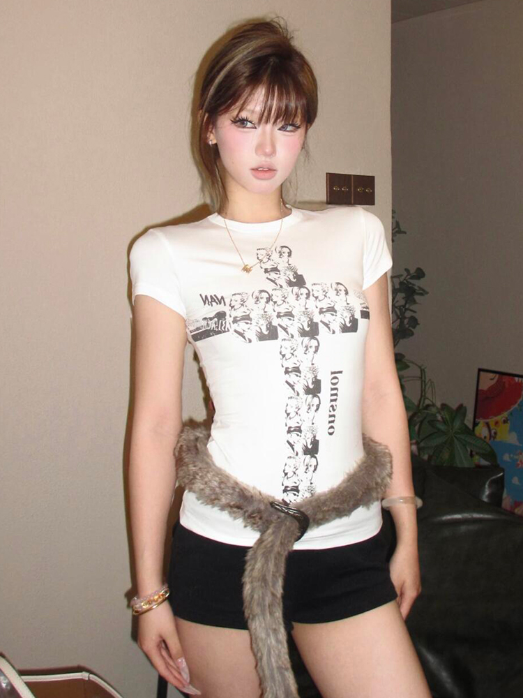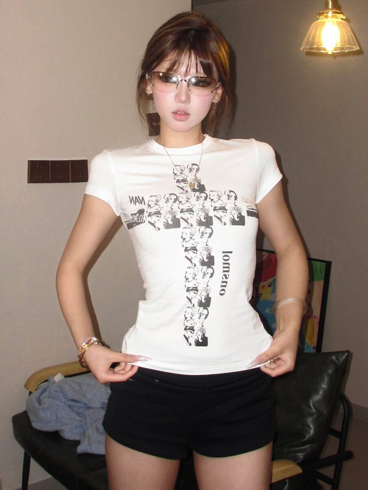 Elevate your summer wardrobe with our Y2K American Style Fitted Short Sleeve T-Shirt for Women, featuring a trendy band character print that captures the essence of retro vibes. This slim-fit white top is designed to flatter your figure while providing ultimate comfort, making it perfect for casual outings or laid-back days at home. Pair it with your favorite jeans or shorts for an effortlessly chic look. Don’t miss out on this stylish essential—add it to your cart today!