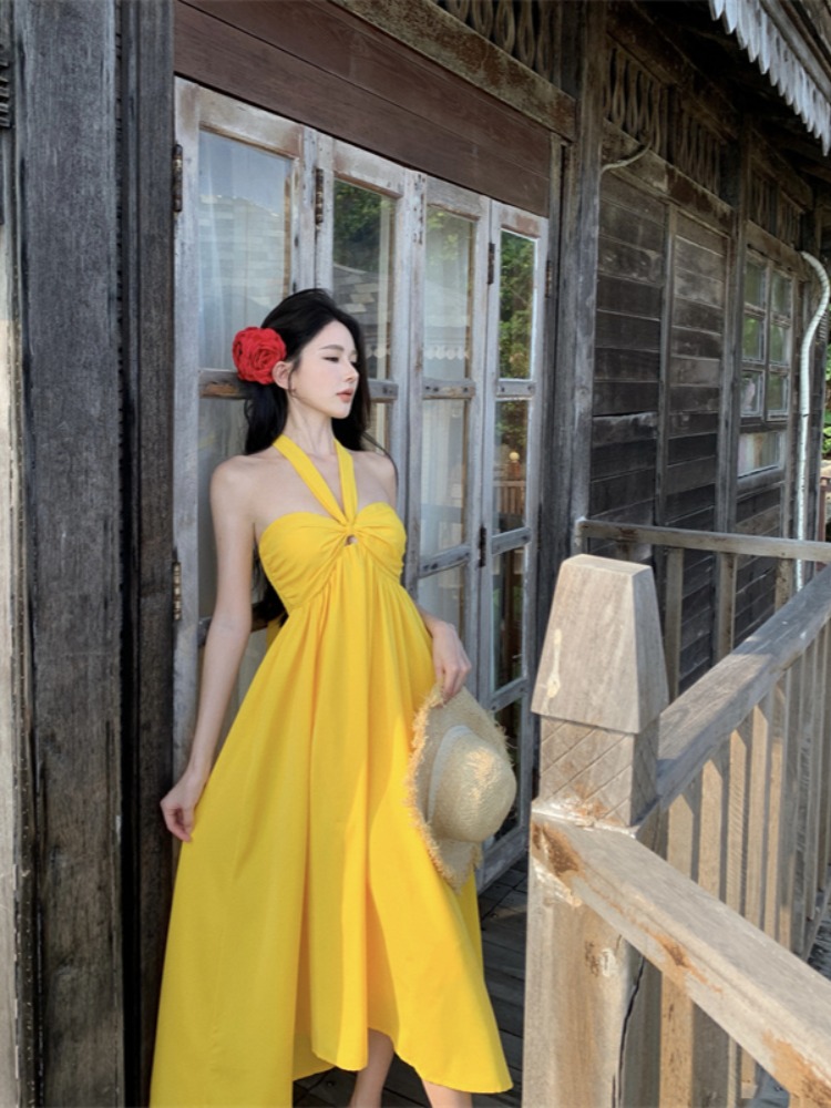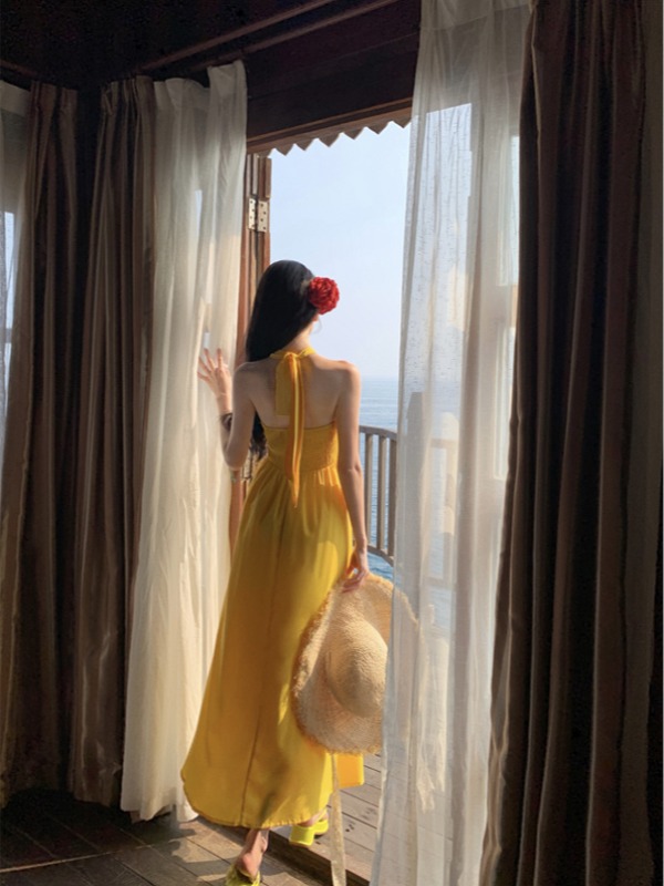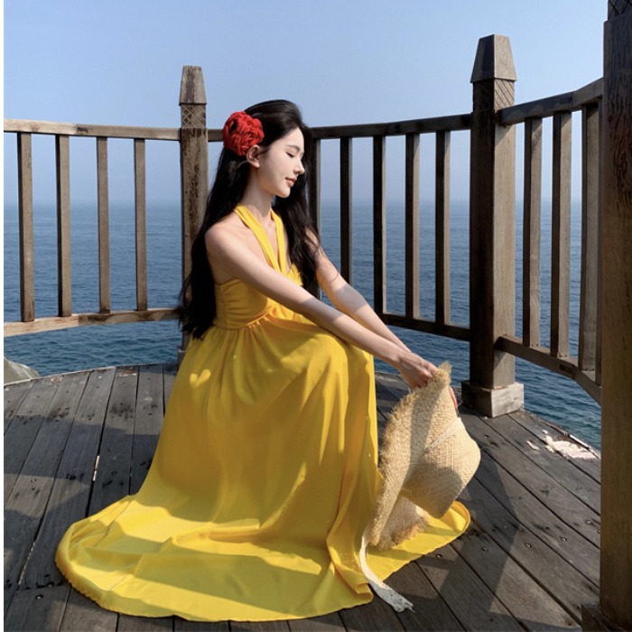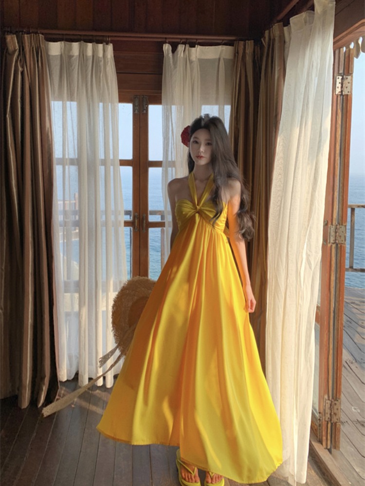 Step into summer with our stunning Yellow Backless Halter Dress, designed for the ultimate seaside vacation experience. This sexy summer style features a flattering fit that accentuates your silhouette, while the long beach skirt flows gracefully with every step, ensuring you feel both comfortable and chic. Perfect for beach parties or sunset strolls, this dress is a must-have for your warm-weather wardrobe. Don’t miss out on making a statement—add this gorgeous piece to your cart today!